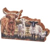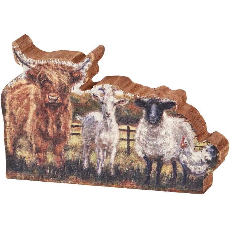 A wooden sitter from our Fall & Harvest Collection cut in the shape of the displayed design of a highland cow, goat, sheep, and chicken in fall scenery. Design is replicated from original artwork painted onto burlap canvas, giving the art a unique depth and texture. Seasonal sitter features coordinating natural wood on sides and back. Our Fall Farm Family chunky sitter is designed to free-stand alone on flat surface. A charming seasonal home accent that can be easily displayed in any home or work space.