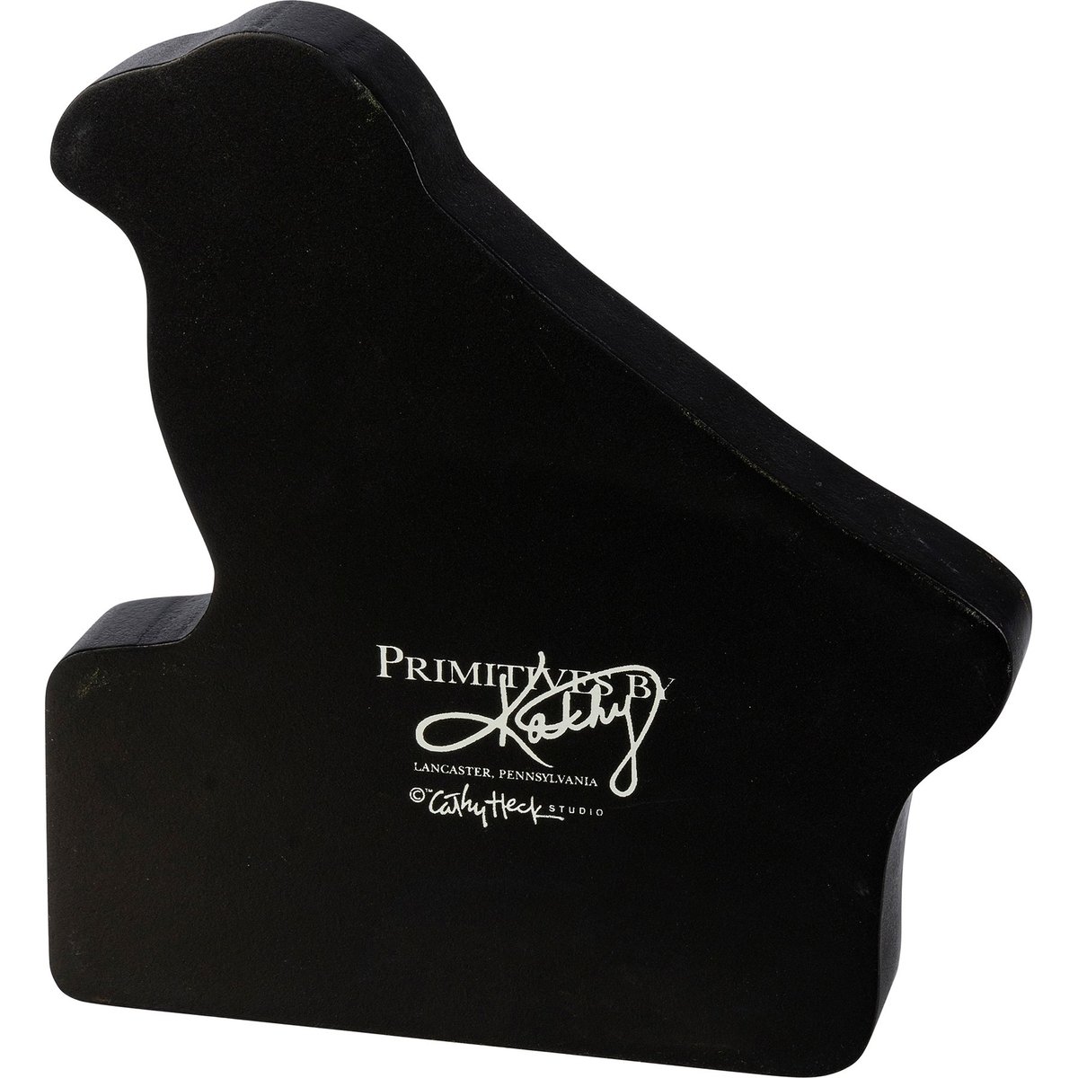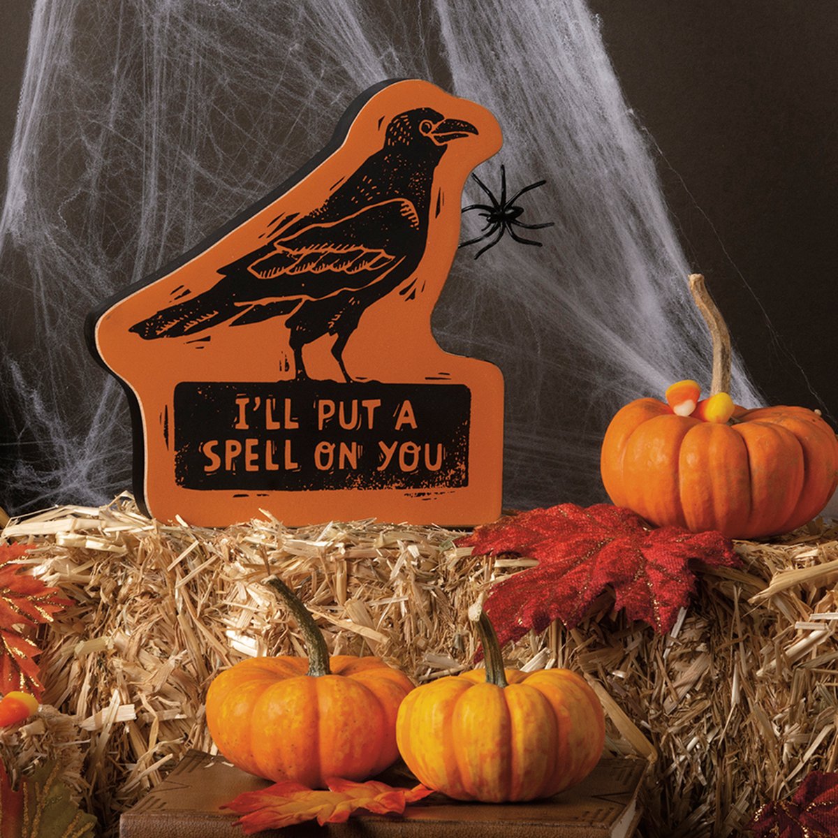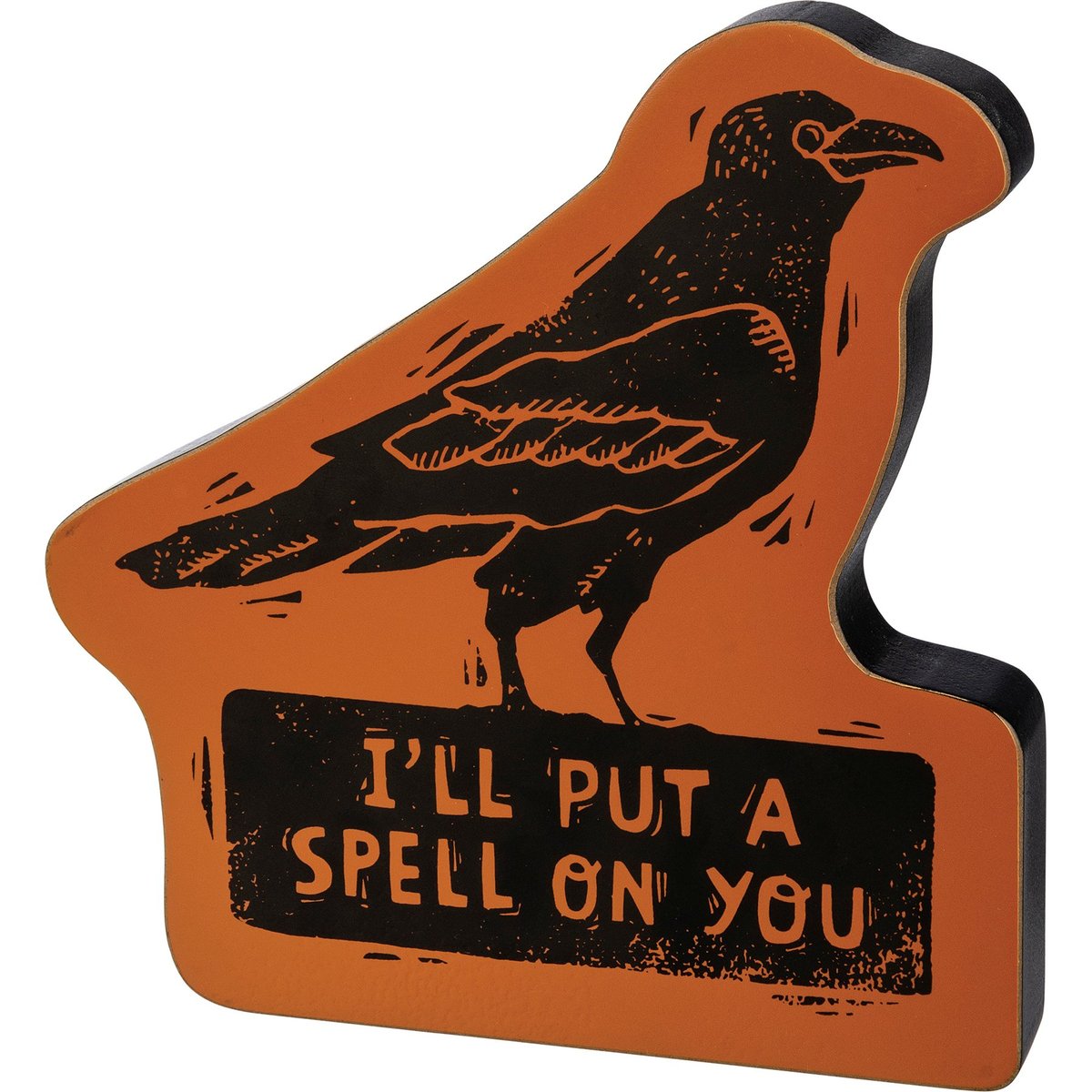 A wooden chunky sitter featuring a block print bird design with an "I'll Put A Spell On You" sentiment and a spooky Halloween palette. Features solid colored sides in a complementary color for added interest.