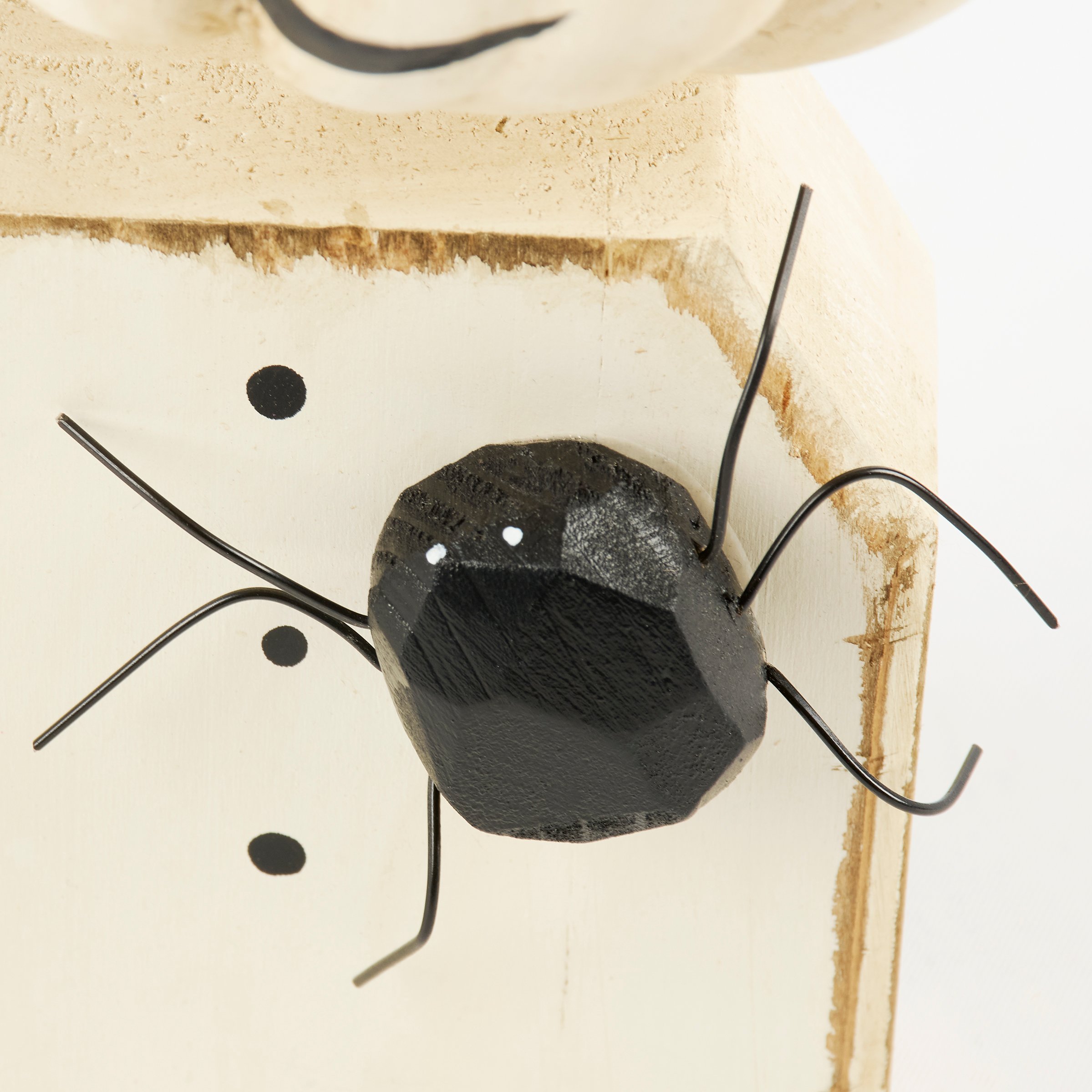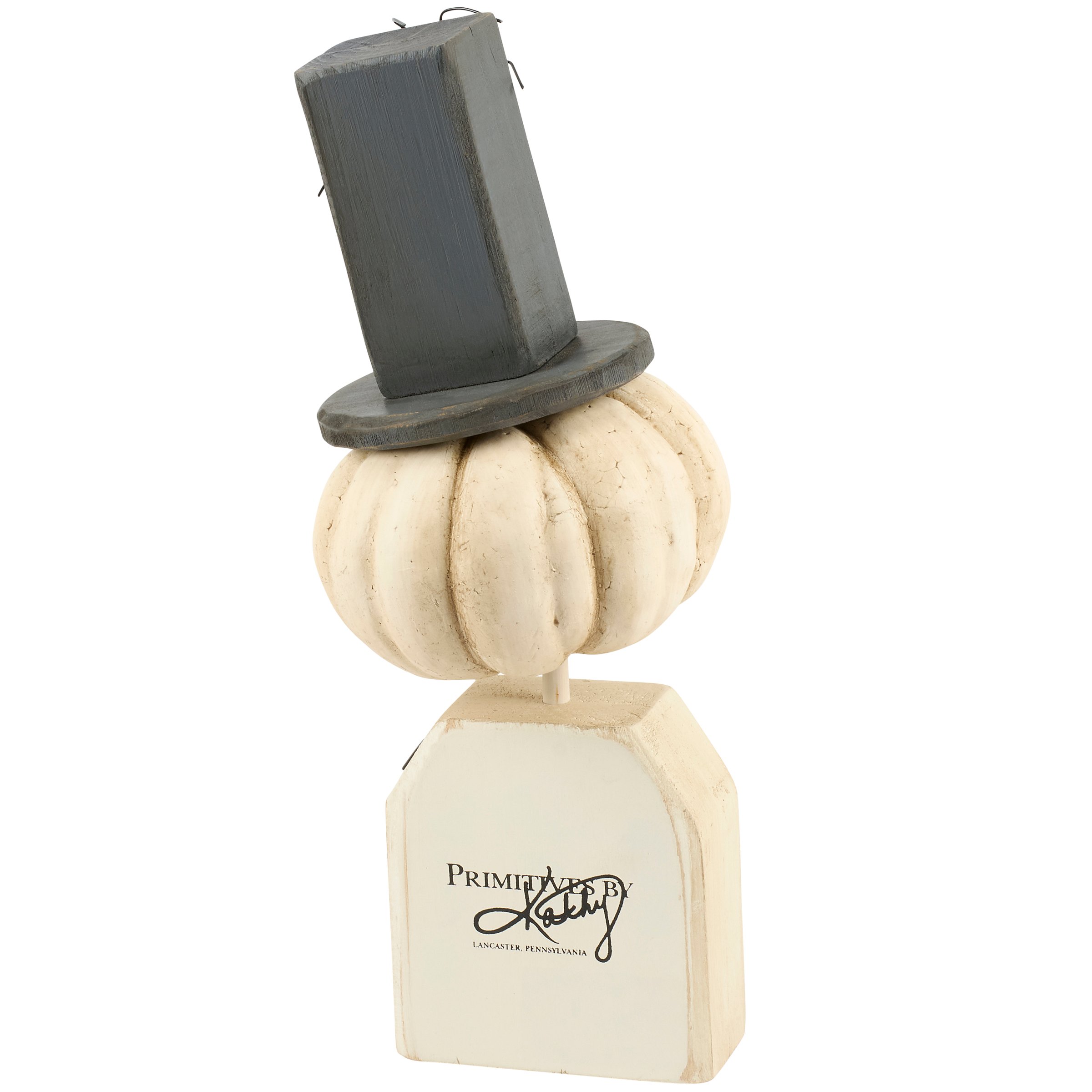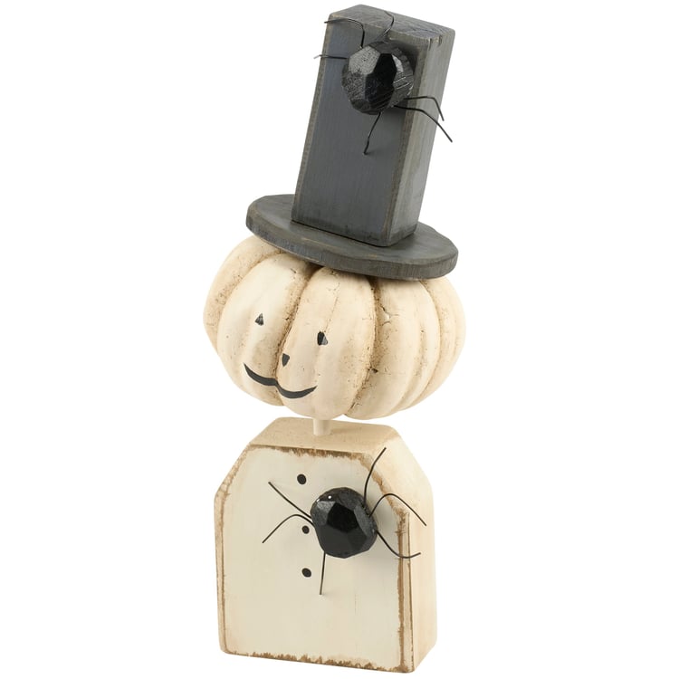 A wooden sitter from our Halloween Collection displaying a charming gentlemen jack o'lantern design recreated from an original hand carved and painted piece with distressed details. This rustic jack o'lantern sitter features handmade details including a wooden top hat and spider accents with wire legs. Our Mr. Jack chunky sitter is designed to free-stand on a flat surface for display. A rustic Halloween home accent that can be easily displayed in any home or work space.