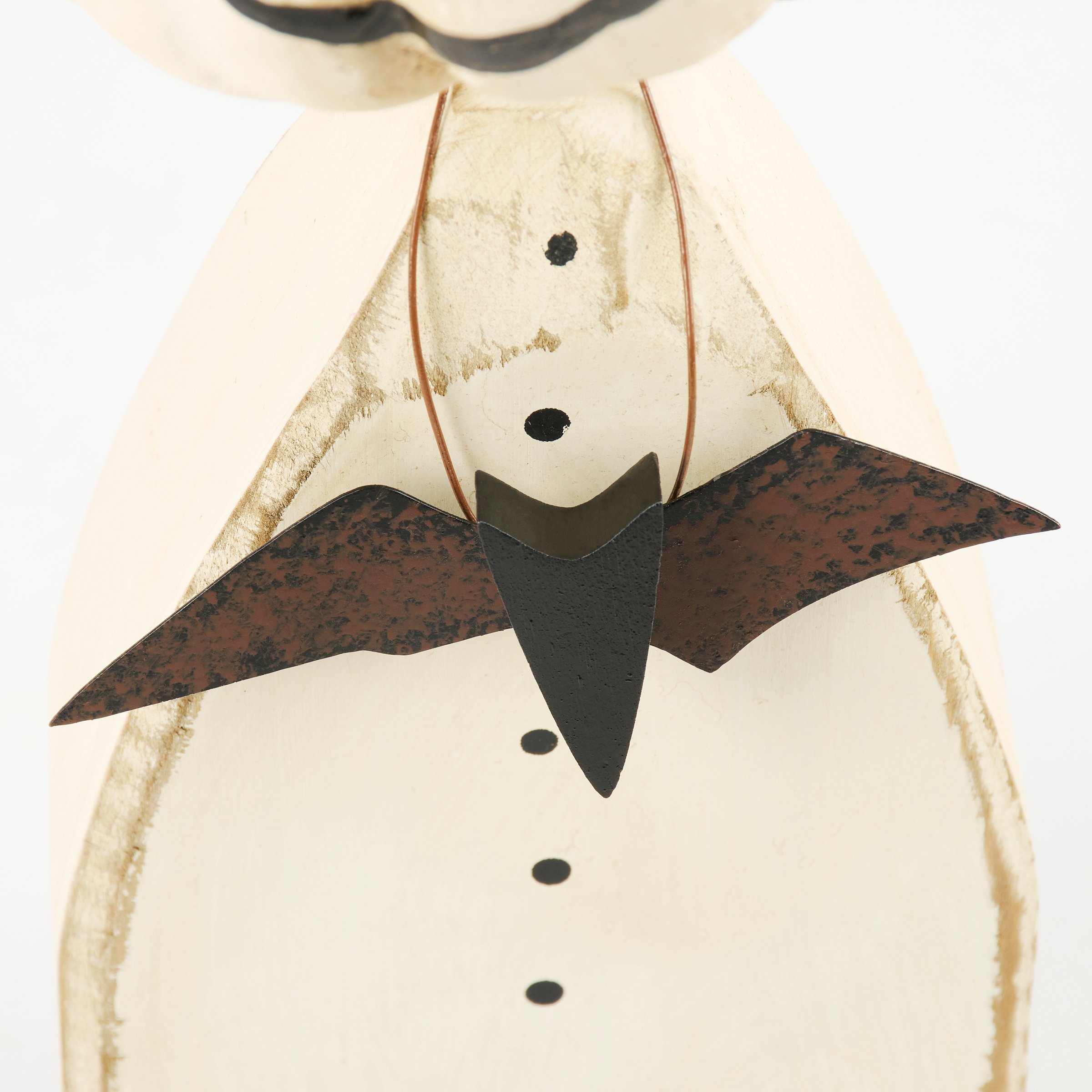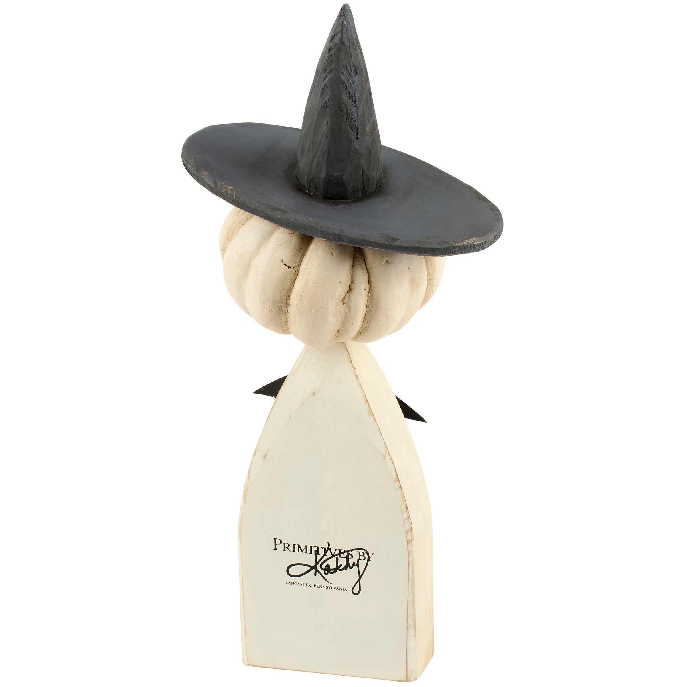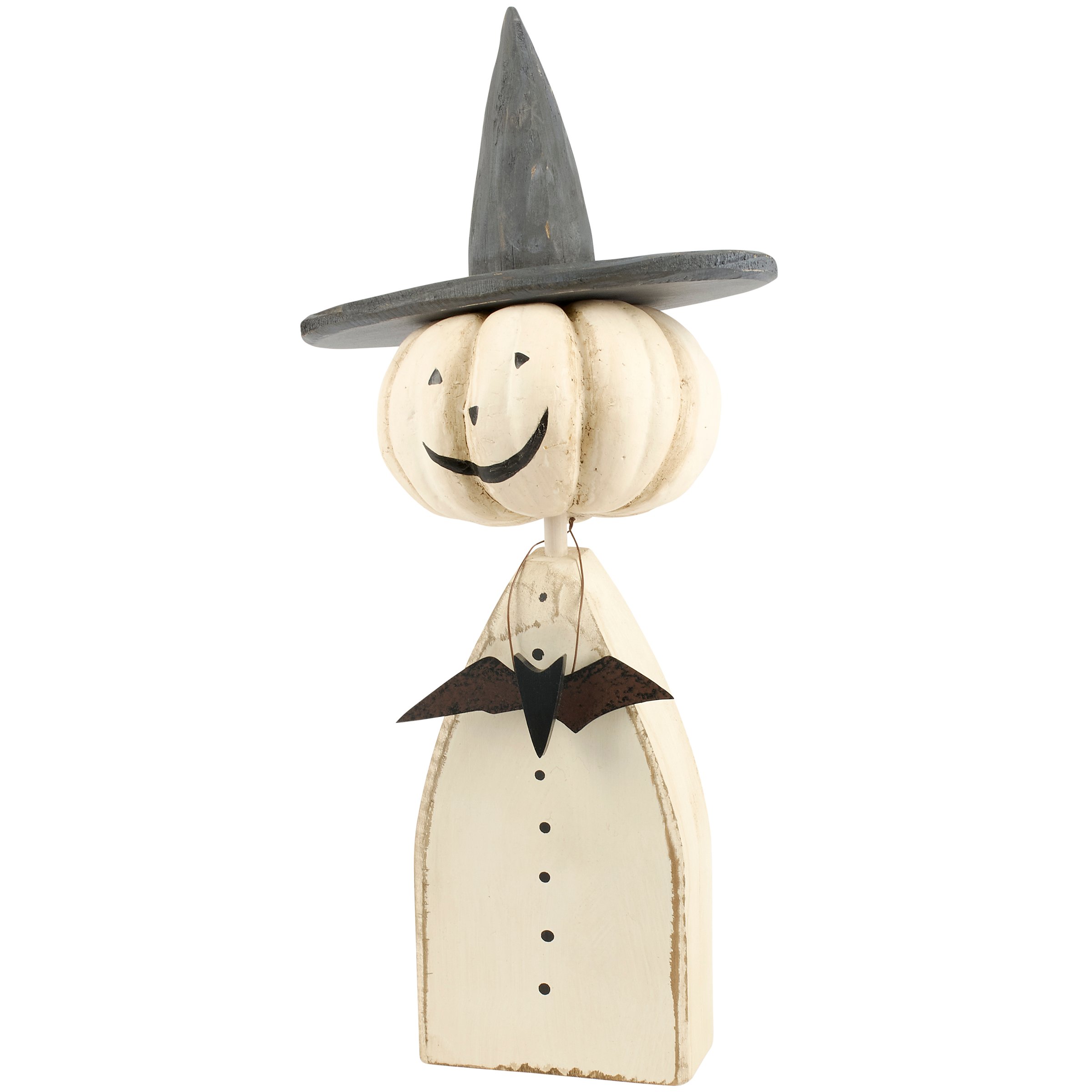 A wooden sitter from our Halloween Collection displaying a charming lady jack o'lantern design recreated from an original hand carved and painted piece with distressed details. This rustic jack o'lantern sitter features handmade details including a wooden witch hat and metal bat necklace. Our Mrs. Jack chunky sitter is designed to free-stand on a flat surface for display. A rustic Halloween home accent that can be easily displayed in any home or work space.