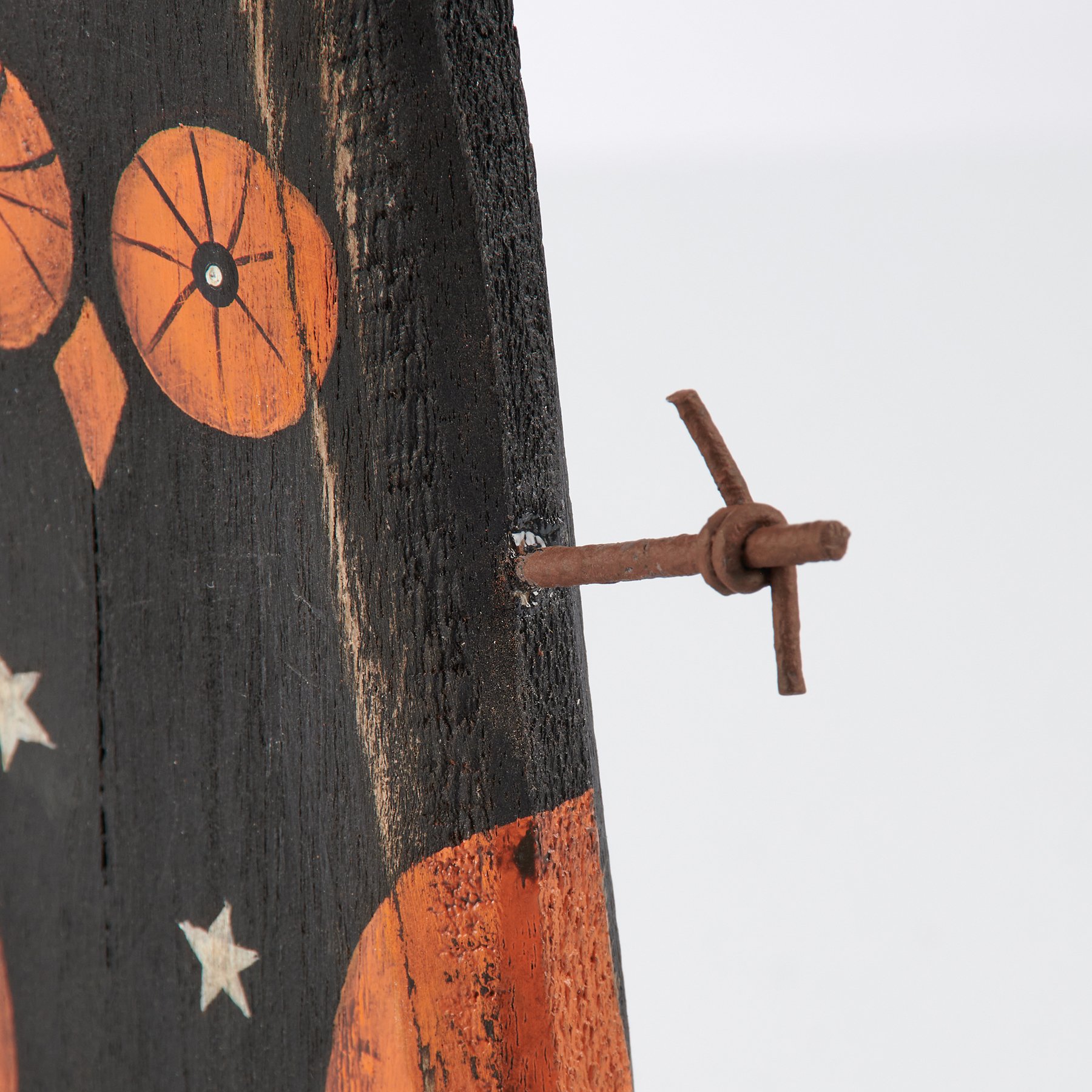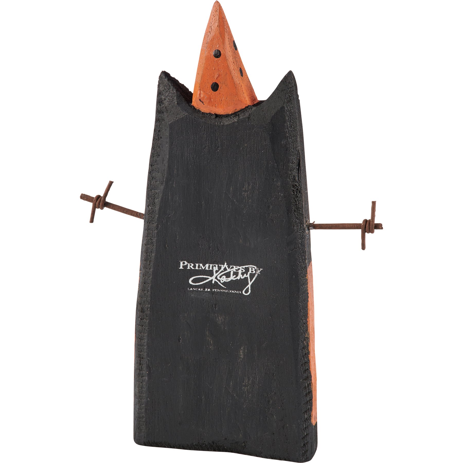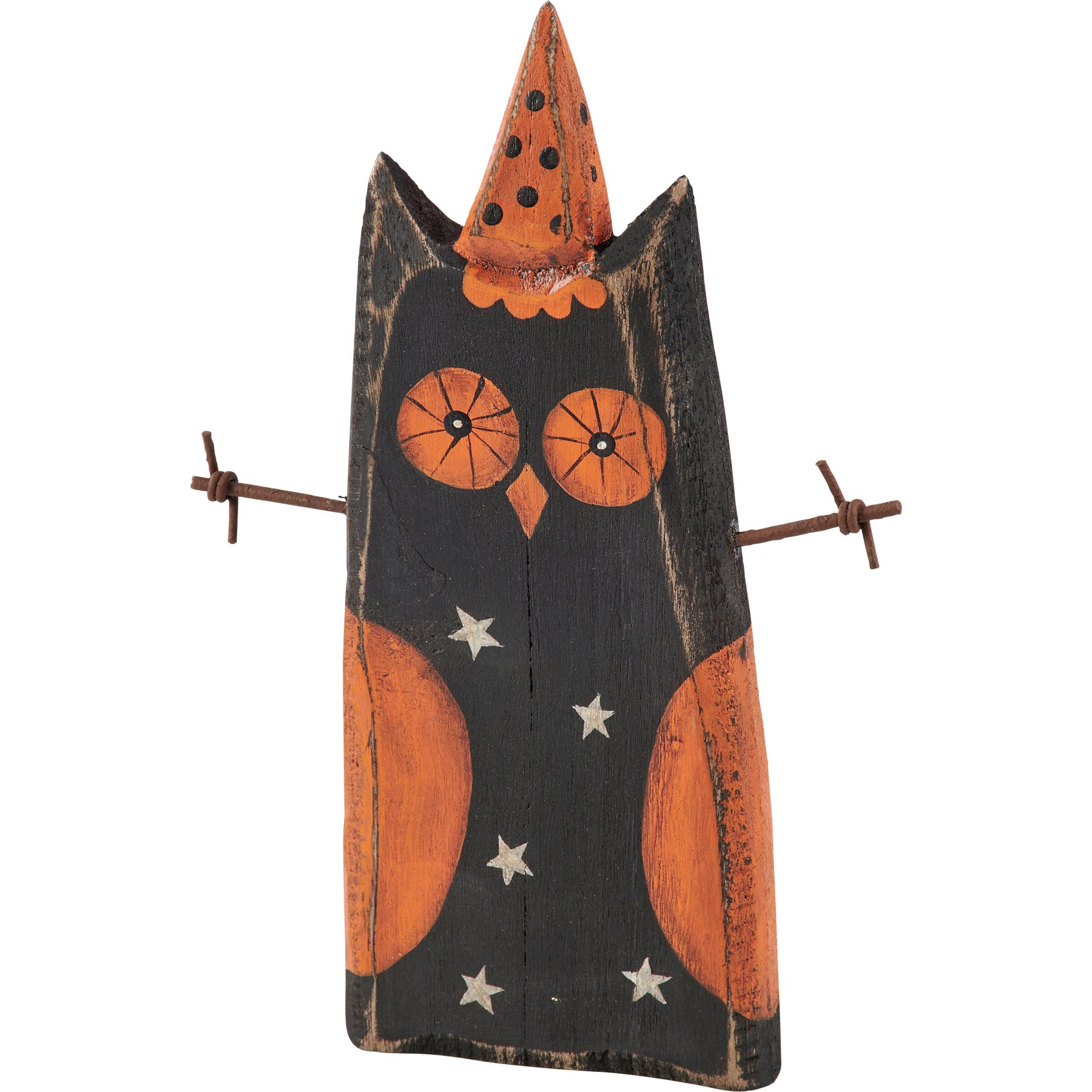 A wooden sitter from our Halloween Collection displaying an owl dressed for Halloween recreated from an original hand carved and painted piece. Sitter features twisted wire and painted accents to create a handmade feel. Our Owl chunky sitter is designed to free-stand alone on flat surface. A fun seasonal home accent that adds character to any display.