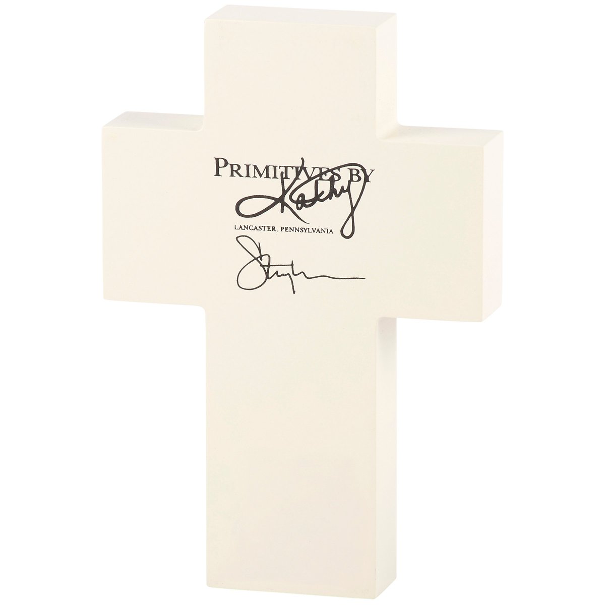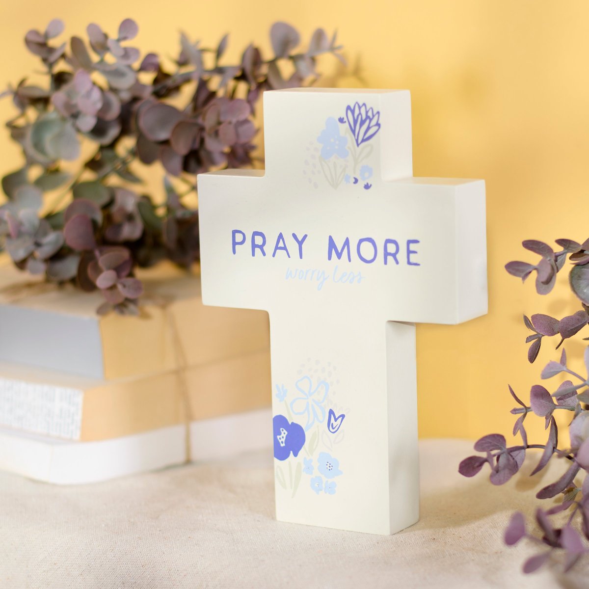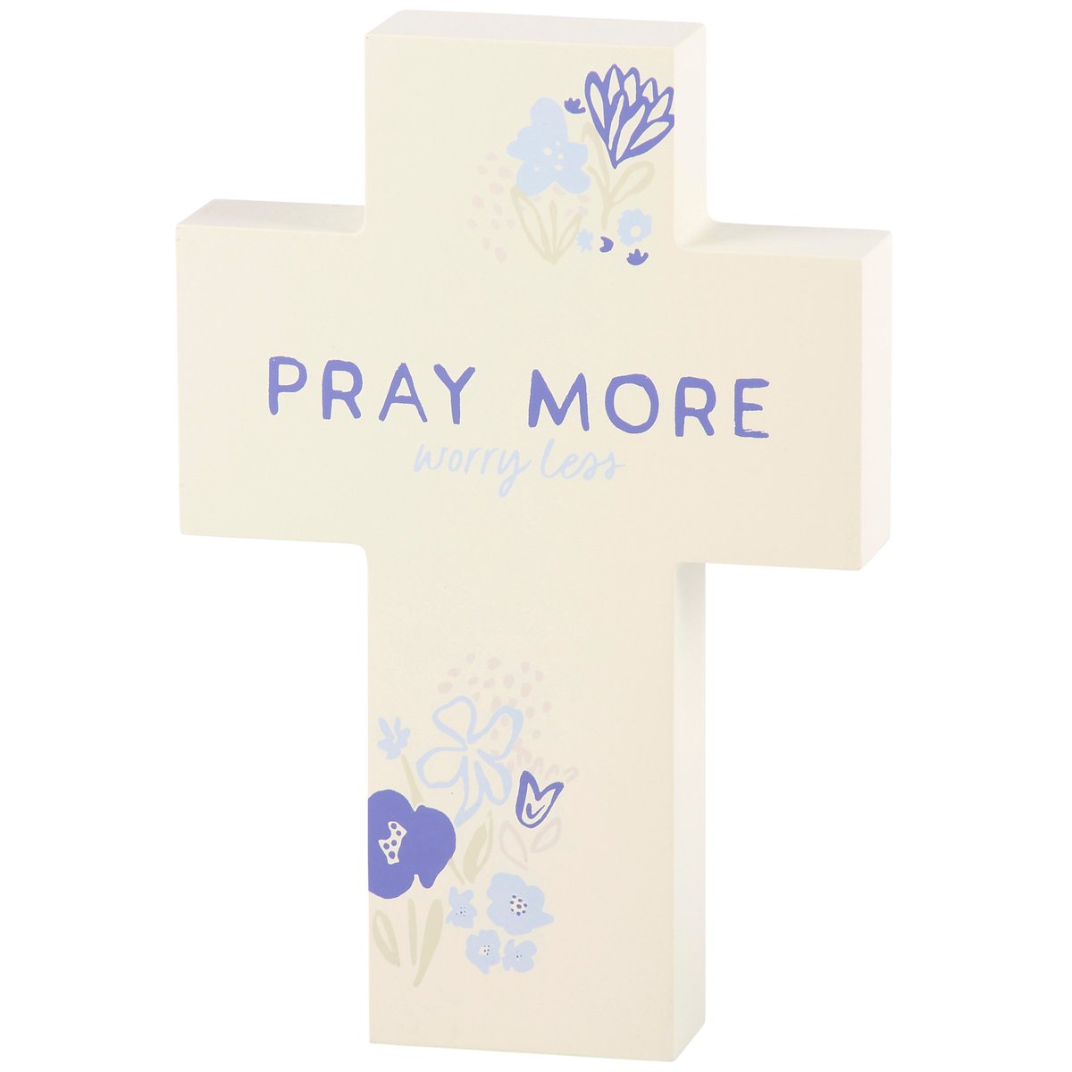 A wooden sitter from our Faith Collection cut in the shape of a cross displaying calming hand illustrated designs of flowers with an inspirational sentiment that reads "Pray More Worry Less." Inspirational sitter features coordinating cream color on the sides and back. Our Pray More Worry Less chunky sitter is designed to free-stand alone on flat surface for display. A faith-themed home accent that can be easily displayed in any home or work space.