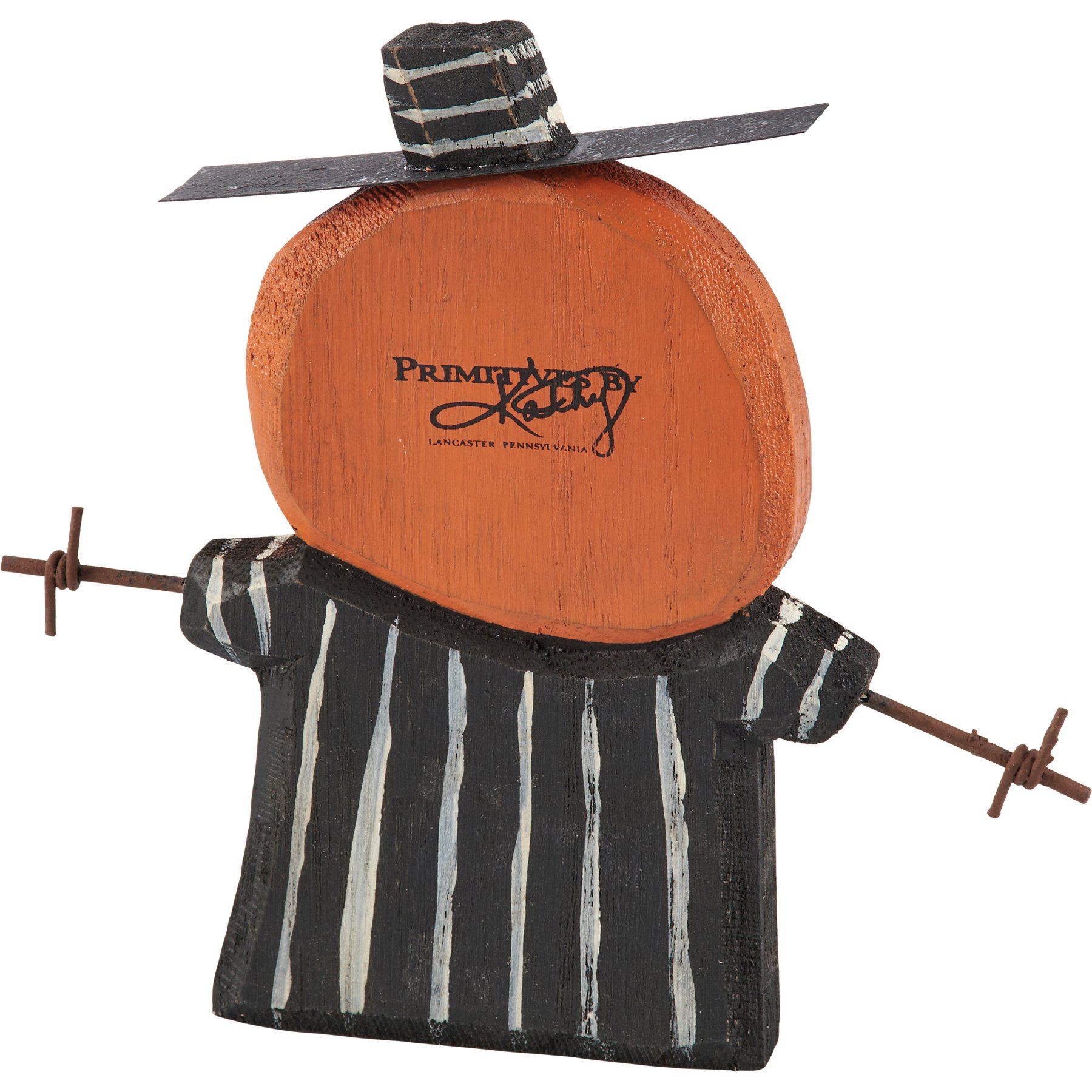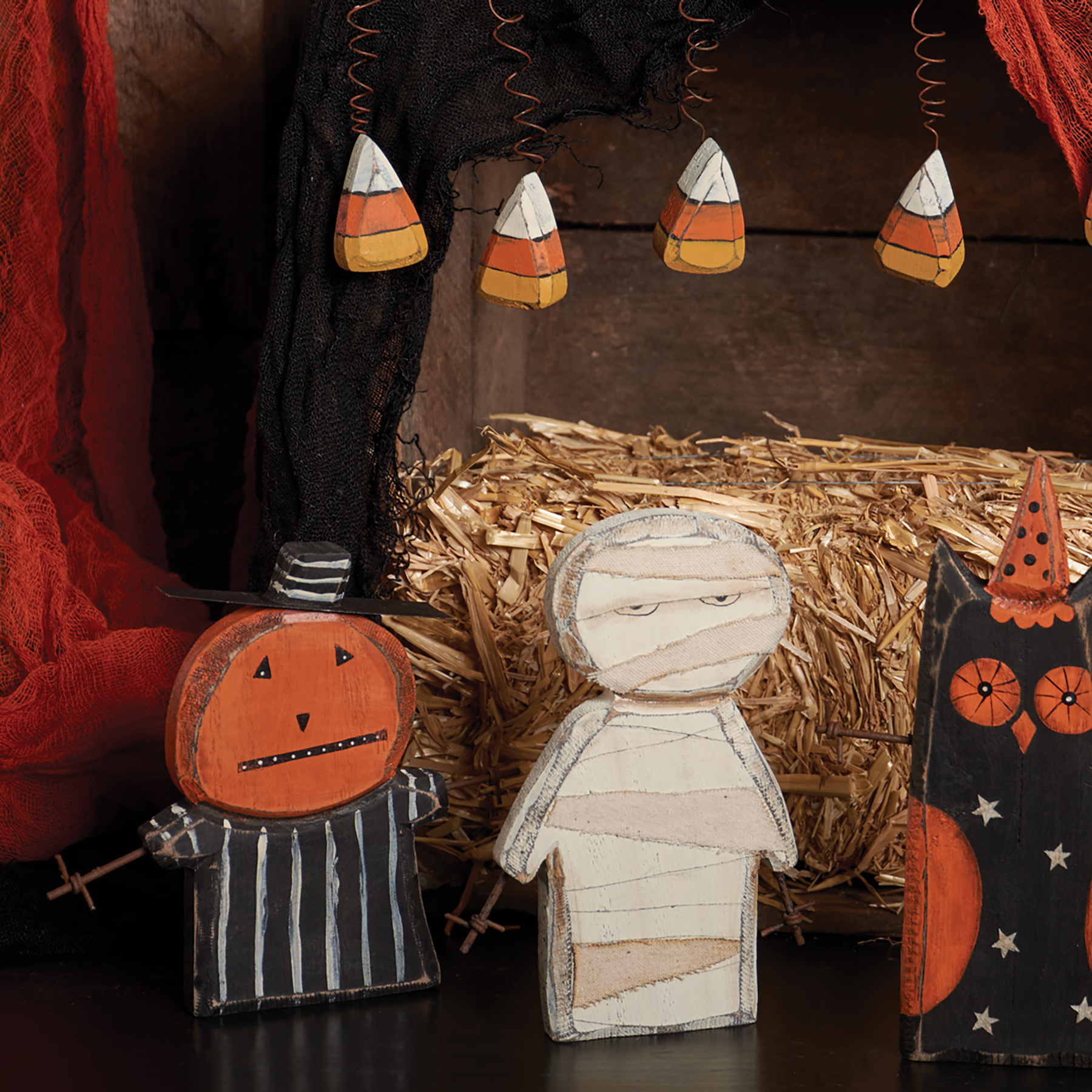 A wooden sitter from our Halloween Collection displaying a pumpkin dressed for Halloween recreated from an original hand carved and painted piece with distressed details. Sitter features metal accents to create a handmade feel. Our Pumpkin Jack chunky sitter is designed to free-stand alone on flat surface. A fun seasonal home accent that adds character to any display.