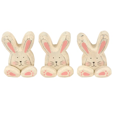 A set of wooden sitters from our Easter & Spring Collection displaying 3 coordinating bunny designs. Each bunny features a cute bunny head piece with separate wooden pieces for feet to add dimension. Bunny sitters are recreated from original hand carved and painted pieces with distressed details. Our Bunny Friends chunky sitter set is designed to free-stand on flat surface for display. A rustic set of Easter home accents that can be easily displayed in any home or work space.