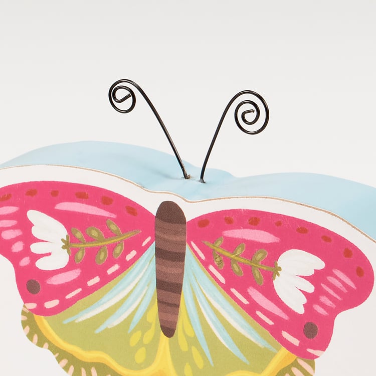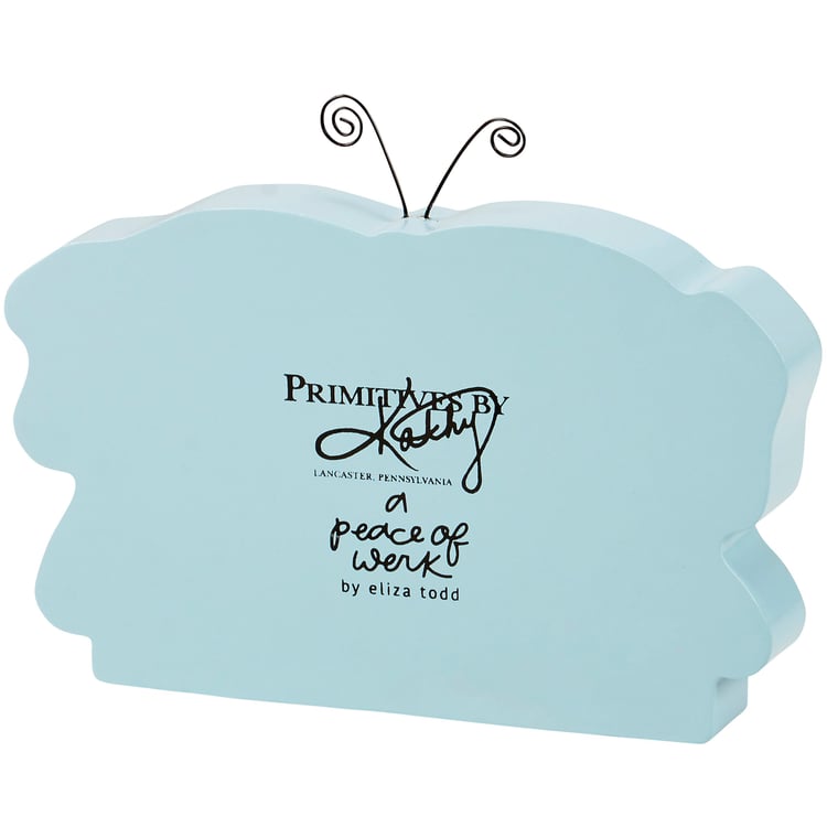 A wooden sitter from our Inspiration & Blooms Collection cut in the shape of a butterfly displaying a hand illustrated butterfly design with floral details above an inspirational sentiment that reads "Small Wings Can Make Big Waves." Sitter features coordinating blue color on sides and back and wire antenna accents on the top. Our Small Wings chunky sitter is designed to free-stand alone on flat surface. An inspirational everyday home accent great for gifting that can be easily displayed in any home or work space.