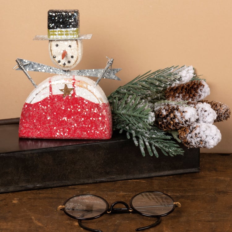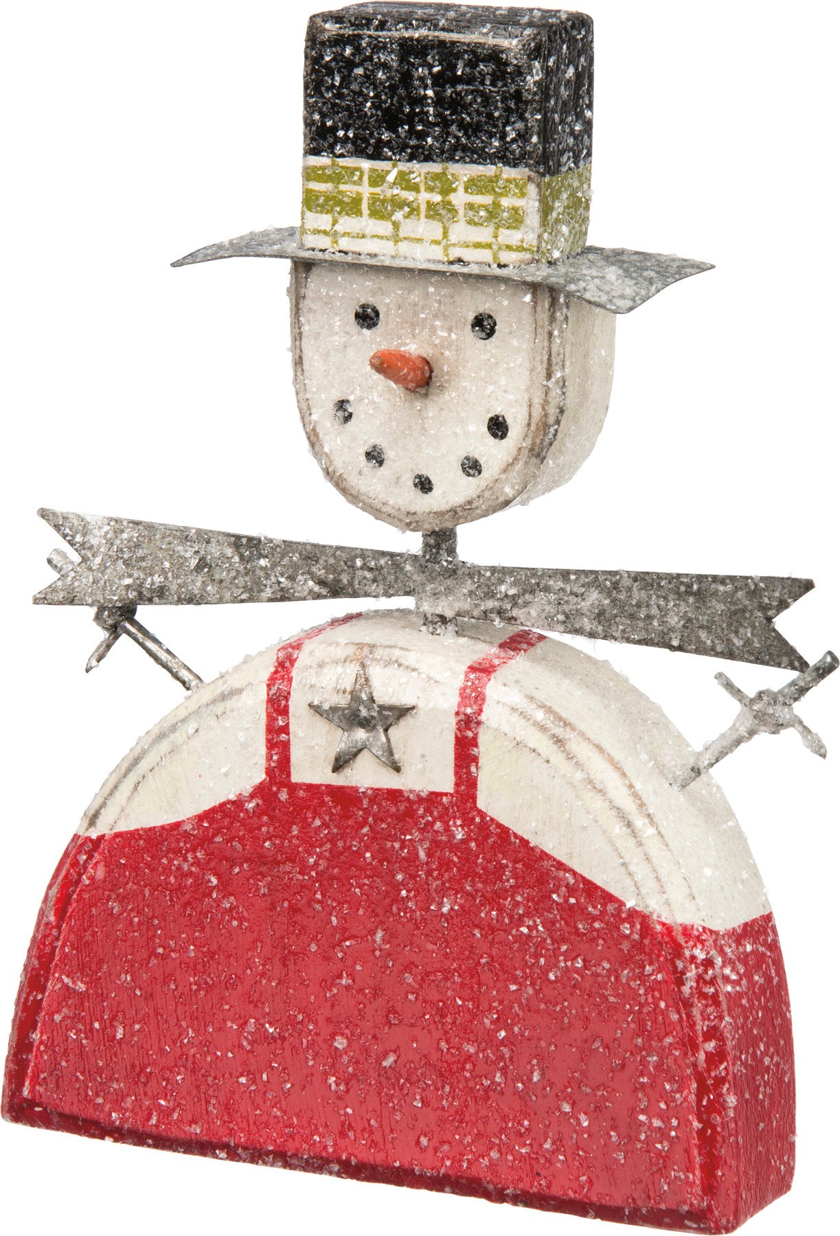 A wooden chunky sitter in a snowman silhouette featuring metal scarf, hat, and arm details, and textured coating for a snowy effect.
