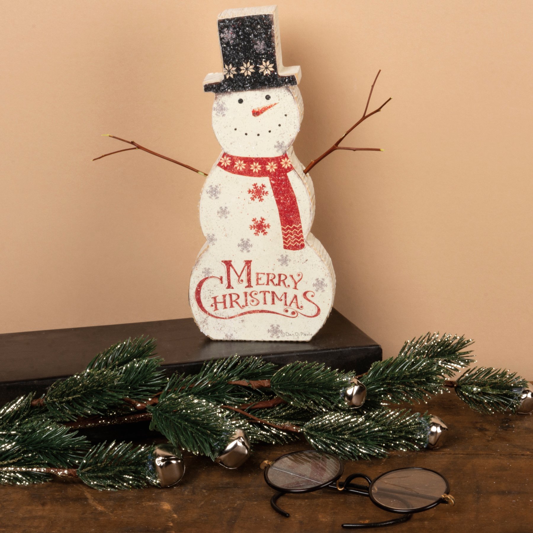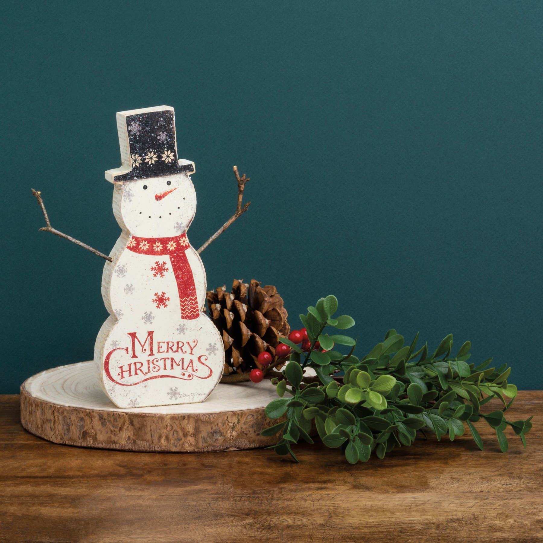 A rustic-inspired wooden snowman chunky sitter for Christmas lending distressed "Merry Christmas" sentiment. Contains back peg to free-stand alone. Complements well with coordinating design pieces for a festive collection. Branch arms not included.