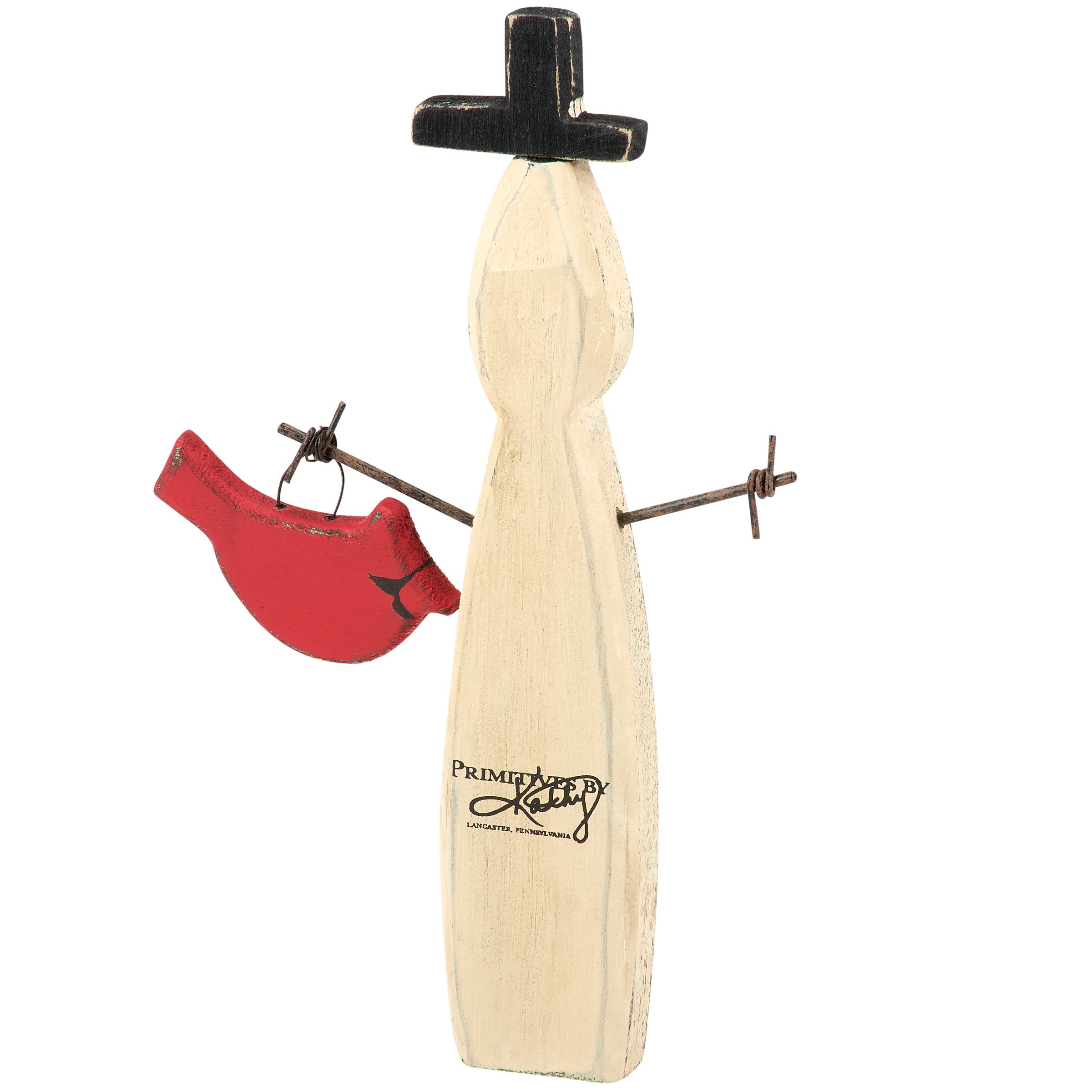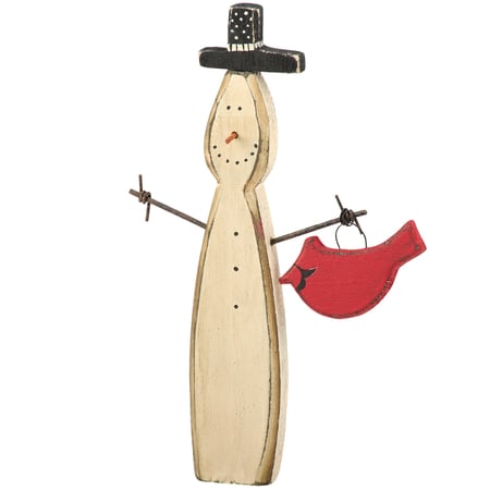 A wooden sitter from our Christmas Collection displaying a charming snowman design recreated from an original hand carved and painted piece with distressed details. This rustic snowman sitter features handmade details including twisted wire for the arms and a painted wooden cardinal hanging from its hand. Our Snowman And Cardinal chunky sitter is designed to free-stand on a flat surface for display. A rustic Christmas home accent that can be easily displayed in any home or work space.