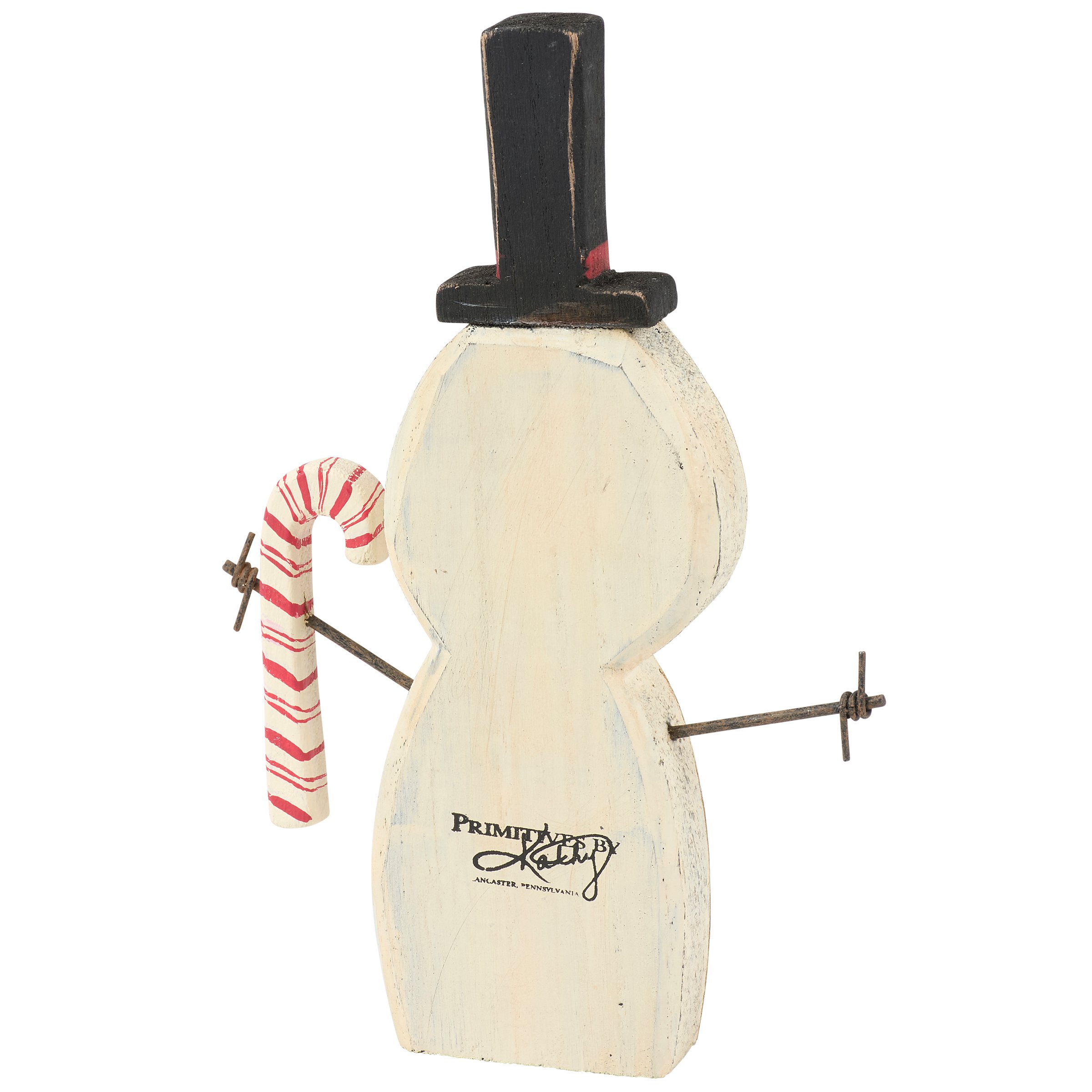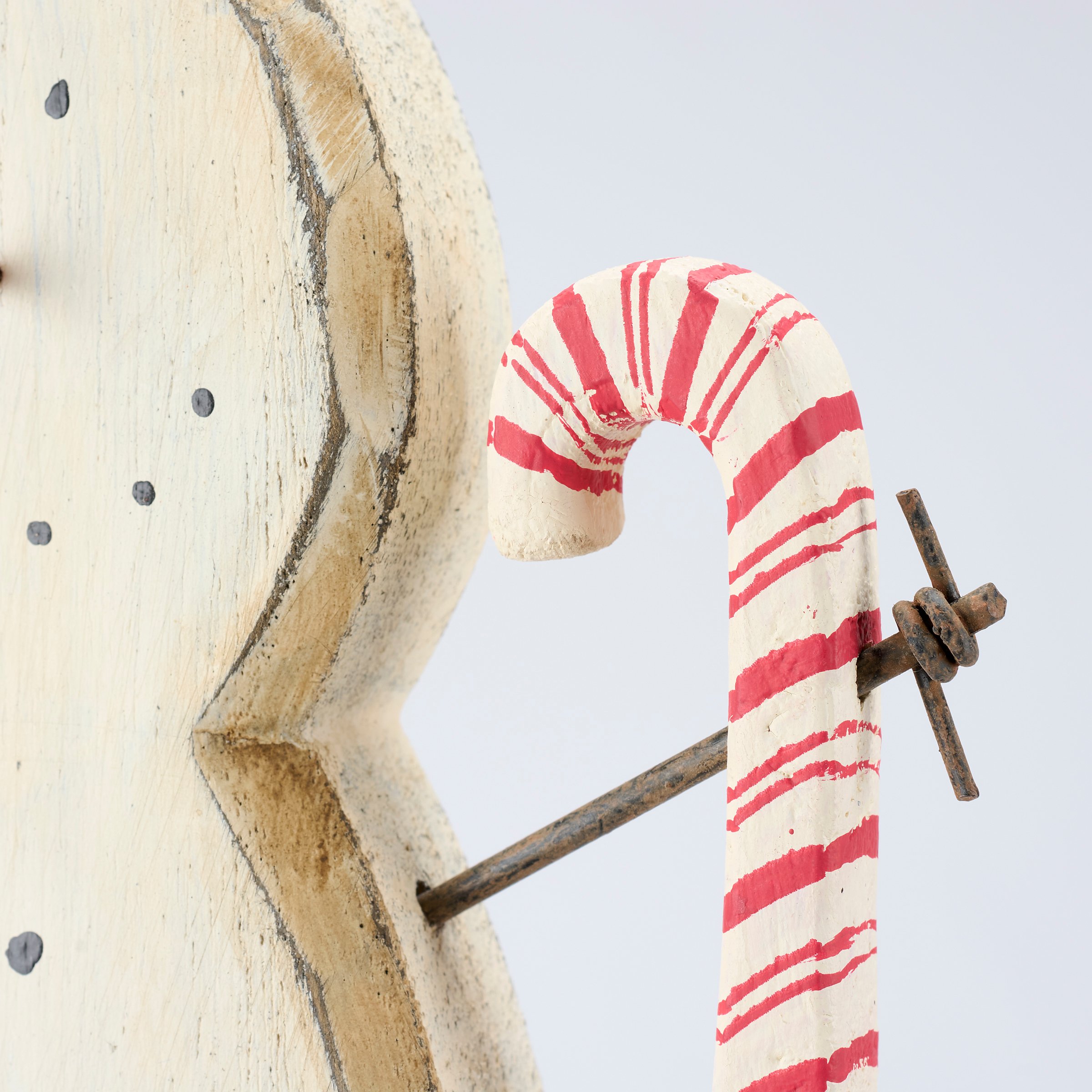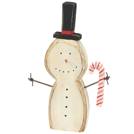 A wooden sitter from our Christmas Collection displaying a charming snowman design recreated from an original hand carved and painted piece with distressed details. This rustic snowman sitter features handmade details including twisted wire for the arms and a painted wooden candy cane in its hand. Our Snowman Candy Cane chunky sitter is designed to free-stand on a flat surface for display. A rustic Christmas home accent that can be easily displayed in any home or work space.