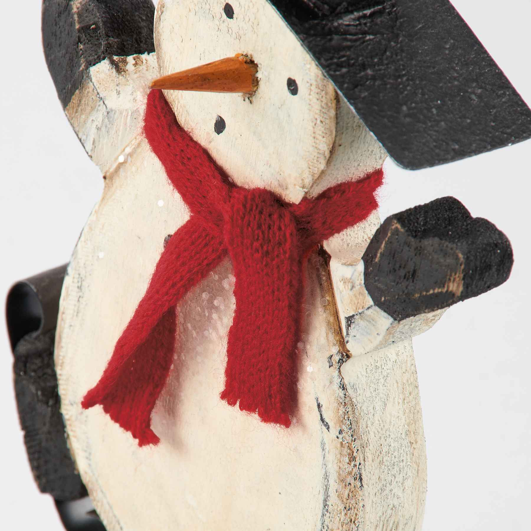 A wooden sitter from our Christmas Collection displaying a snowman ice skating recreated from original hand carved and painted pieces with distressed details. Sitter features knit scarf detail with glitter and metal accents to create a handmade feel. Our Snowman Skate chunky sitter is designed to free-stand alone on flat surface. A fun seasonal home accent that adds character to any display.