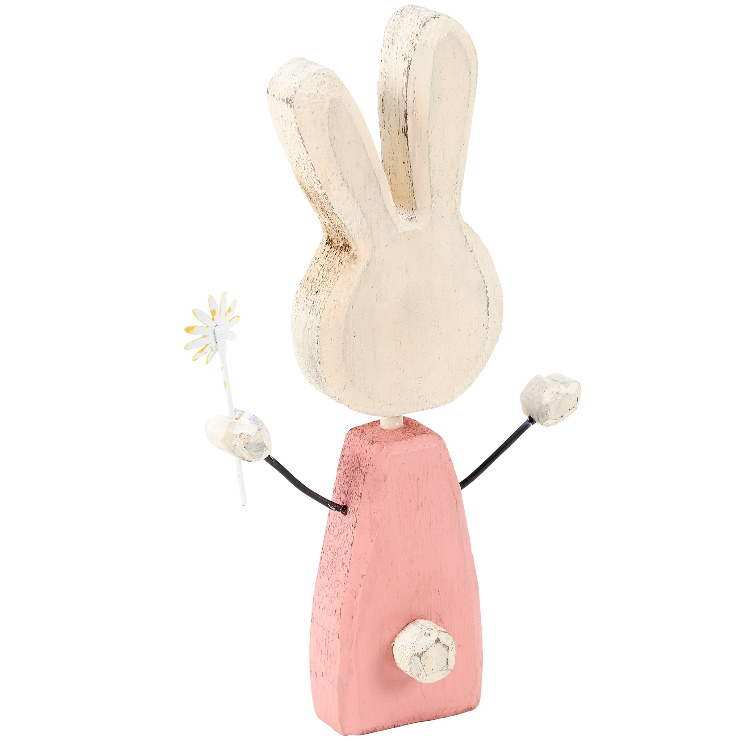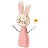 A wooden sitter from our Easter & Spring Collection displaying a delightful bunny wearing a flower dress and holding a sunflower recreated from an original hand carved and painted piece with distressed details. Sitter features wire and painted accents to create a handmade feel. Our Sunny Bunny chunky sitter is designed to free-stand alone on flat surface. A fun seasonal home accent that adds character to any display.