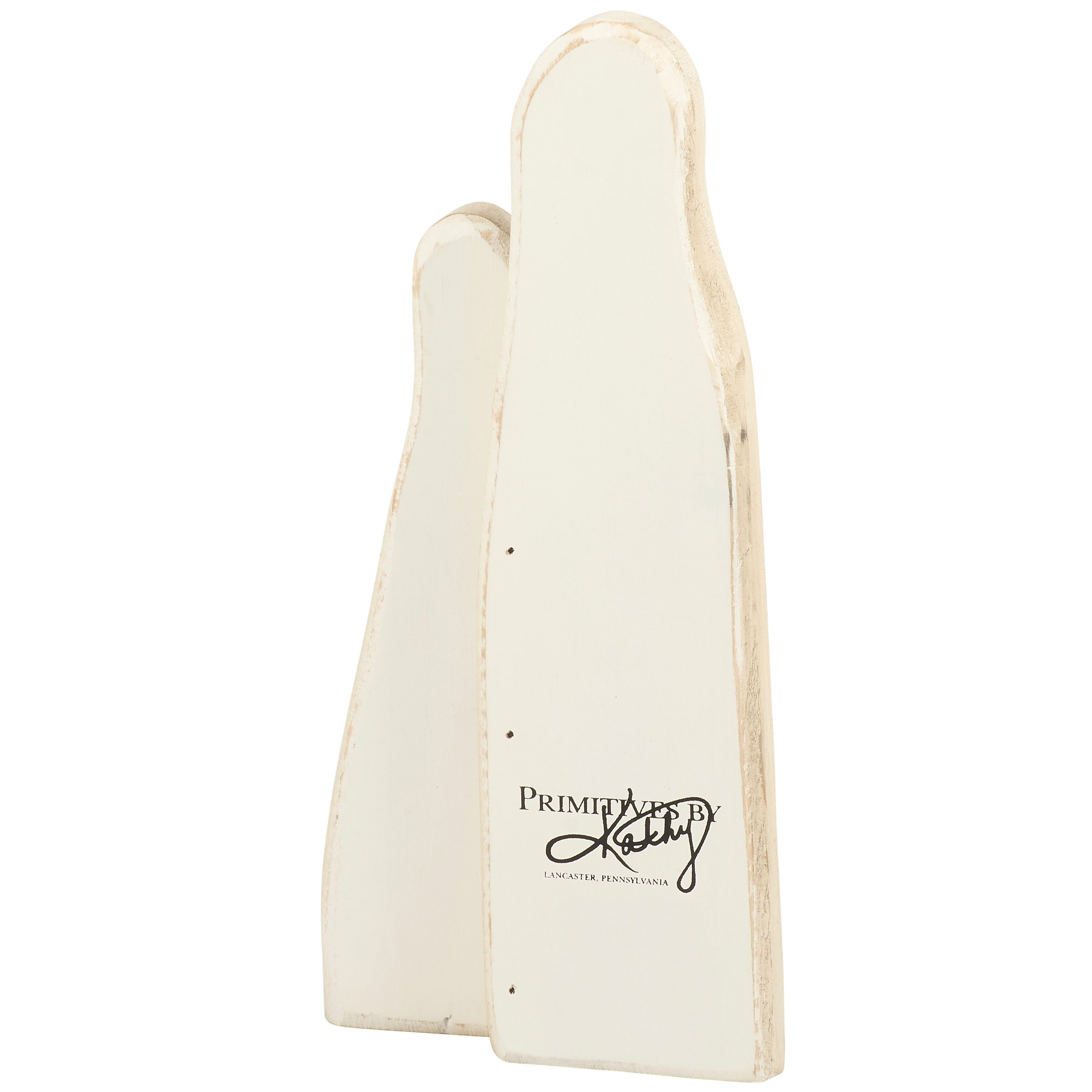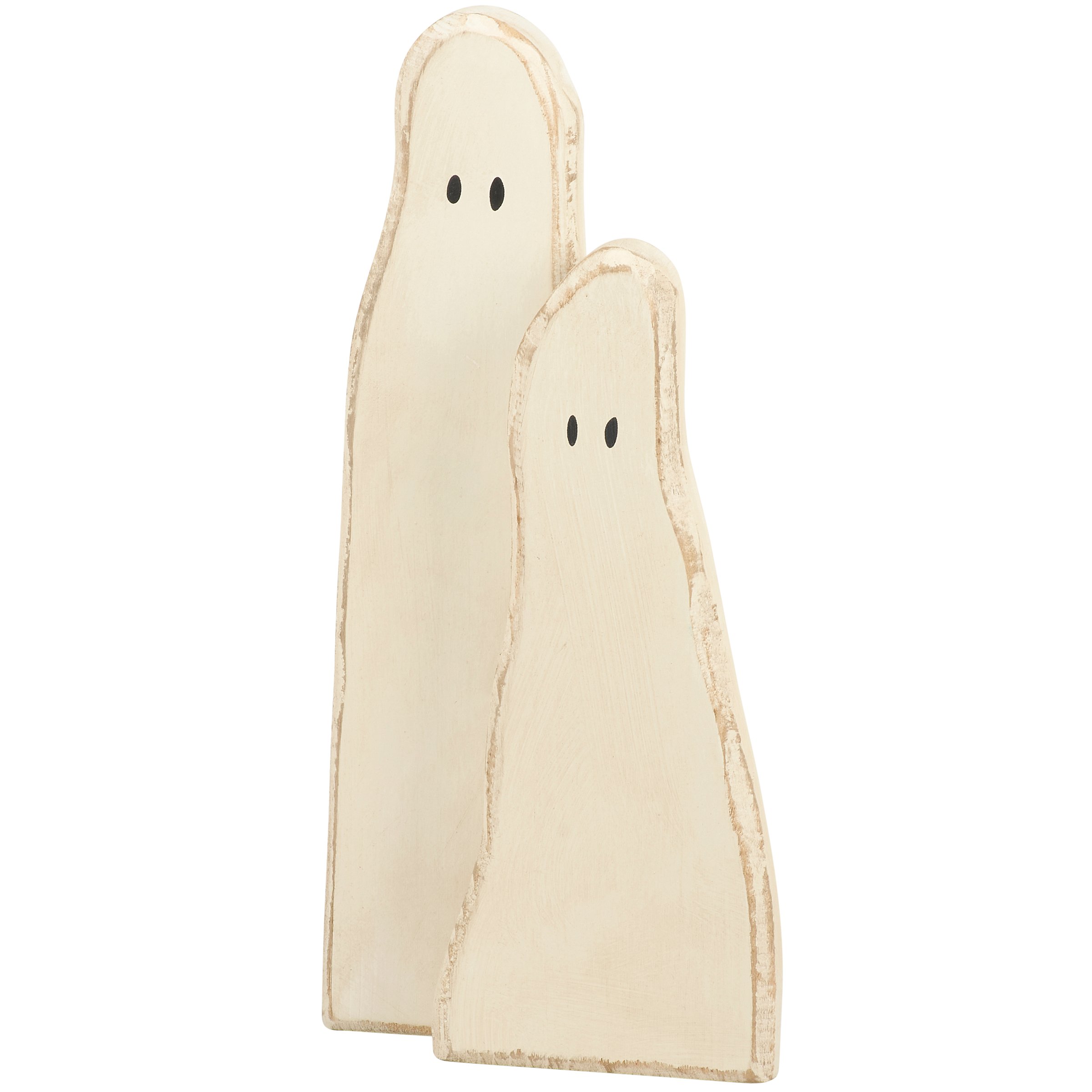 A wooden sitter from our Halloween Collection displaying a fun design of a tall ghost standing behind another ghost that is recreated from an original hand carved and painted piece. This rustic ghost sitter features handmade details including painted eyes and a distressed finish. Our Tall Ghost Duo chunky sitter is designed to free-stand on a flat surface for display. A rustic Halloween home accent that can be easily displayed in any home or work space.