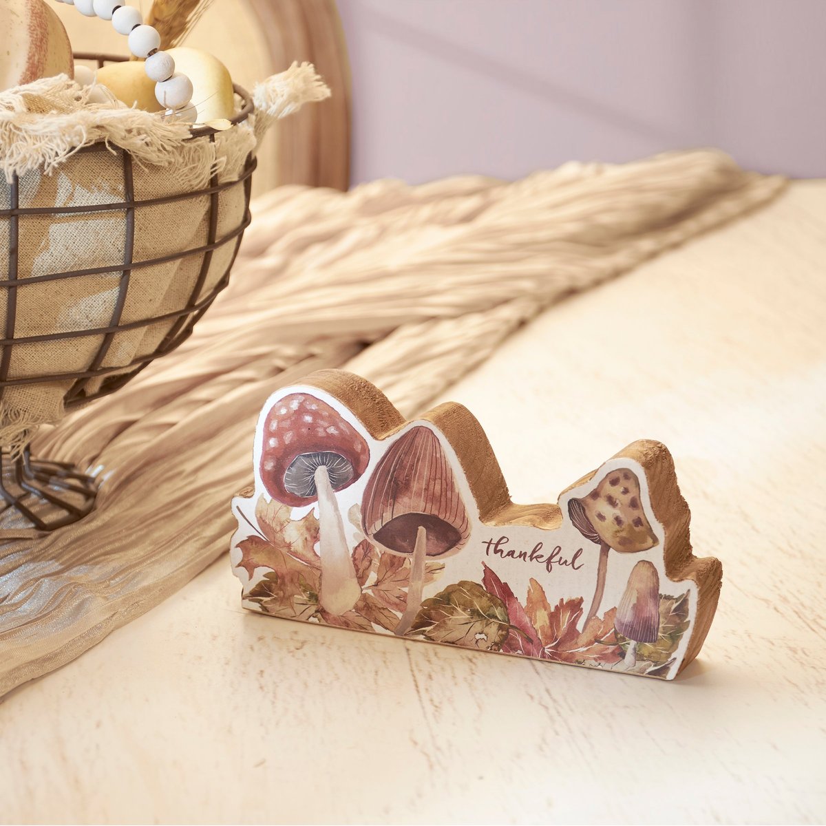 A wooden sitter from our Fall & Harvest Collection cut in the shape of the displayed hand painted design featuring autumn leaves and mushrooms with "Thankful" sentiment. Sitter features coordinating natural wood on sides and back. Our Thankful chunky sitter is designed to free-stand alone on flat surface. A rustic seasonal home accent with a variety of display options.