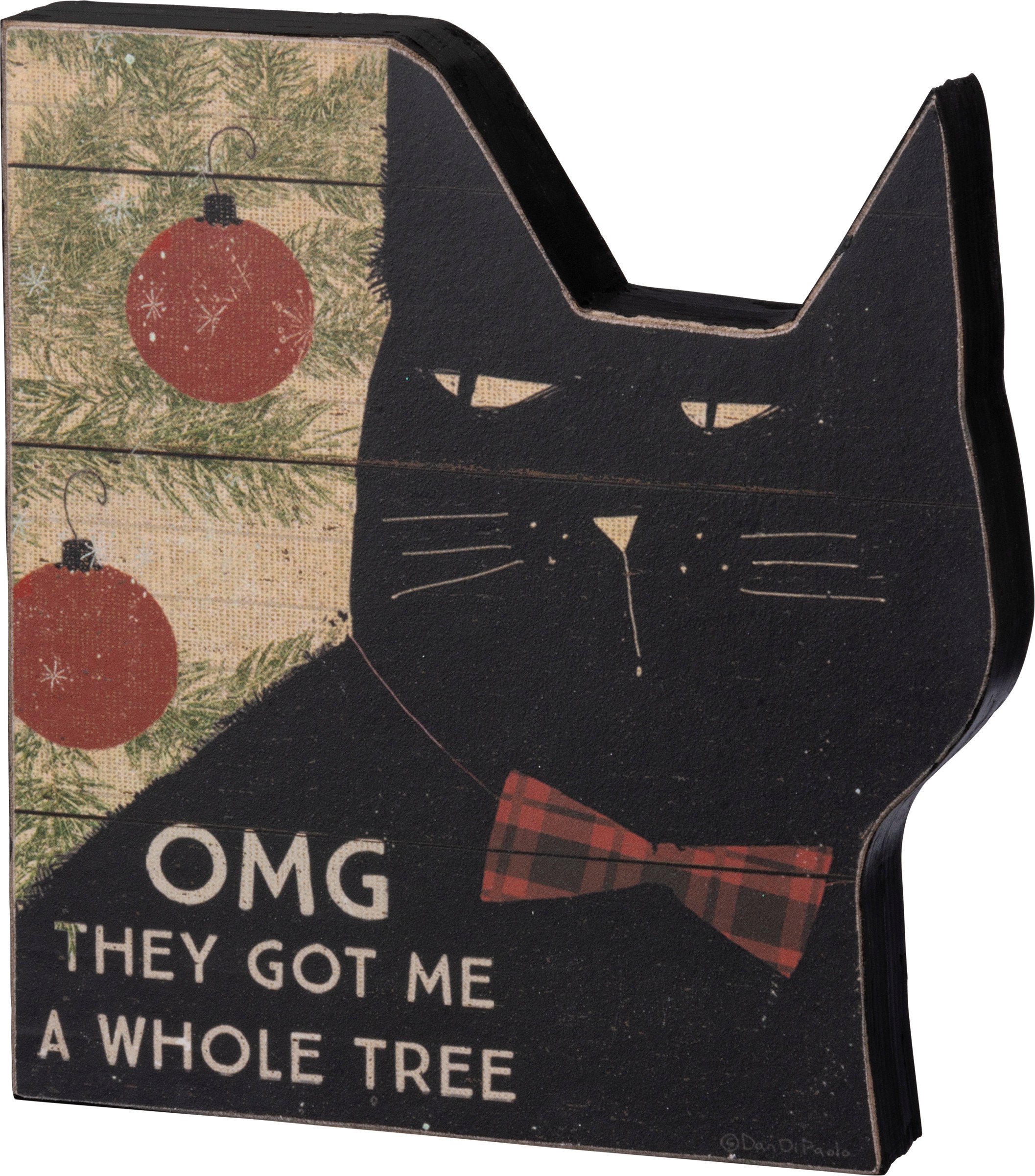 A wooden sitter cut in the shape of a sassy cat wearing a holiday bowtie staring at tree ornaments with a fun pet inspired sentiment that reads "OMG - They Got Me A Whole Tree." Christmas cat sitter features distressed details with coordinating black color on sides and back. Our They Got Me A Whole Tree chunky sitter is designed to free-stand alone on flat surface. A pet-themed seasonal home accent that can easily blend into any display.