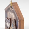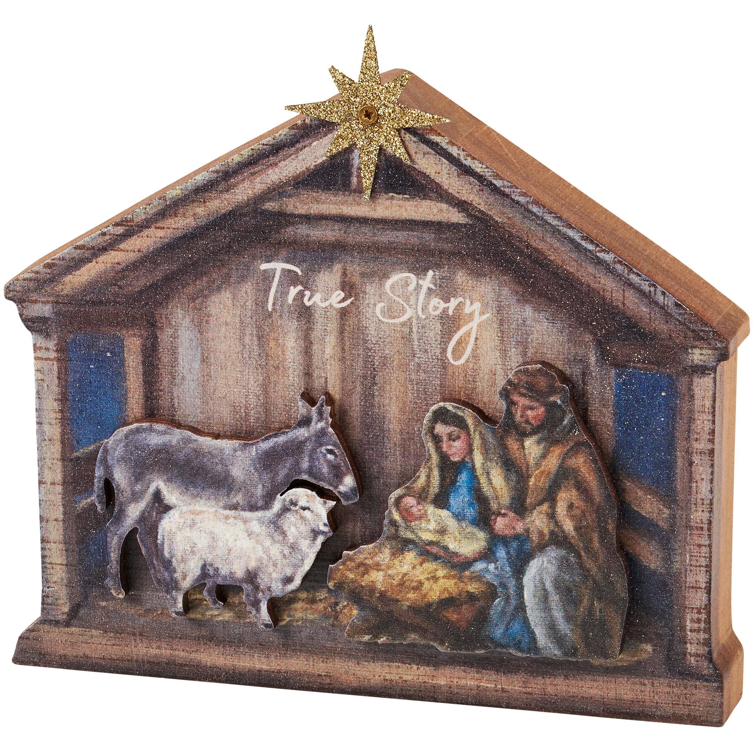 A wooden sitter from our Christmas Collection cut in the shape of the displayed nativity design featuring pop out pieces for added dimension and a sentiment that reads "True Story." Design is replicated from original artwork painted onto burlap canvas, giving the art a unique depth and texture. Seasonal sitter features coordinating natural wood on sides and back as well as a metal star attached to the top with glitter detail. Our True Story Nativity chunky sitter is designed to free-stand alone on flat surface. A nativity-themed home accent great for gifting that can be easily displayed in any home or work space.