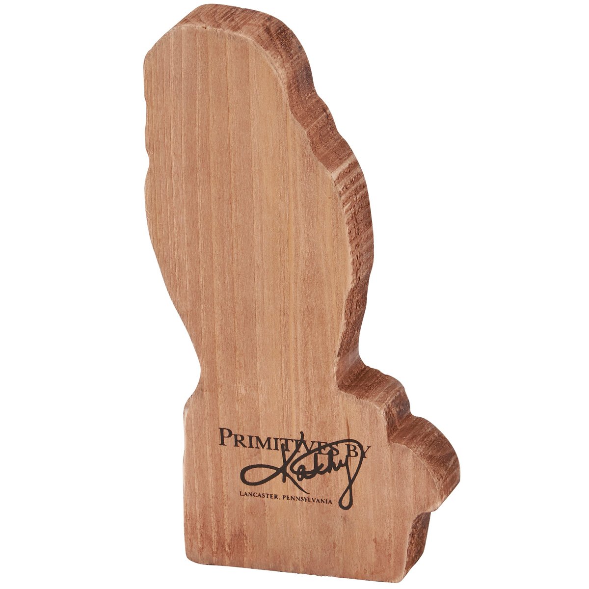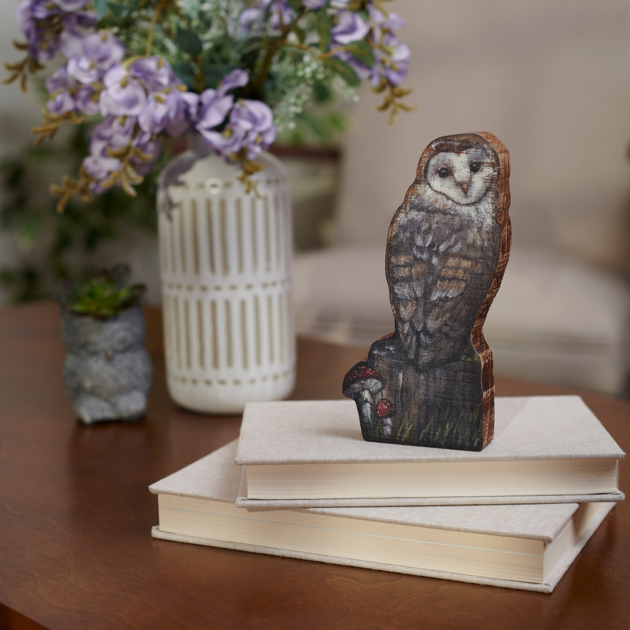 A wooden sitter from our Easter & Spring Collection cut in the shape of the displayed hand painted design featuring a woodland owl on a tree stump. Design is replicated from original artwork painted onto burlap canvas, giving the art a unique depth and texture. Seasonal sitter features distressed details and coordinating natural wood on sides and back. Our Woodland Owl chunky sitter is designed to free-stand alone on flat surface. A rustic seasonal home accent that can be easily displayed in any home or work space.