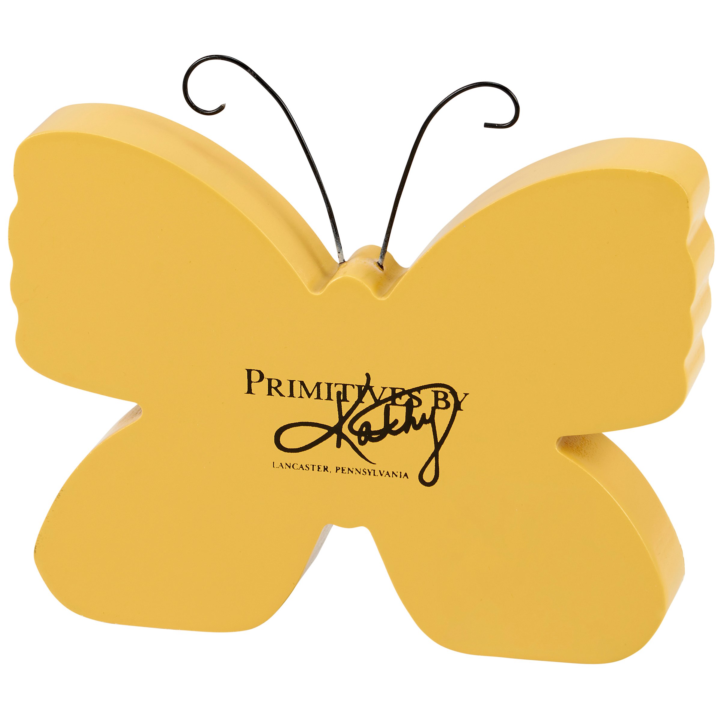 A wooden sitter from our Garden Collection cut in the shape of a butterfly displaying a hand painted yellow butterfly with floral details in the design and wire antenna accents on the top. Sitter features coordinating yellow color on sides and back. Our Yellow Butterfly chunky sitter is designed to free-stand alone on flat surface. A charming home accent with a variety of display options.