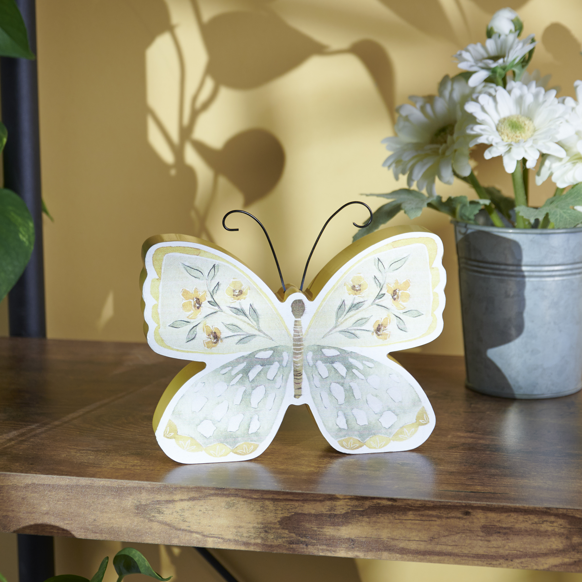 A wooden sitter from our Garden Collection cut in the shape of a butterfly displaying a hand painted yellow butterfly with floral details in the design and wire antenna accents on the top. Sitter features coordinating yellow color on sides and back. Our Yellow Butterfly chunky sitter is designed to free-stand alone on flat surface. A charming home accent with a variety of display options.