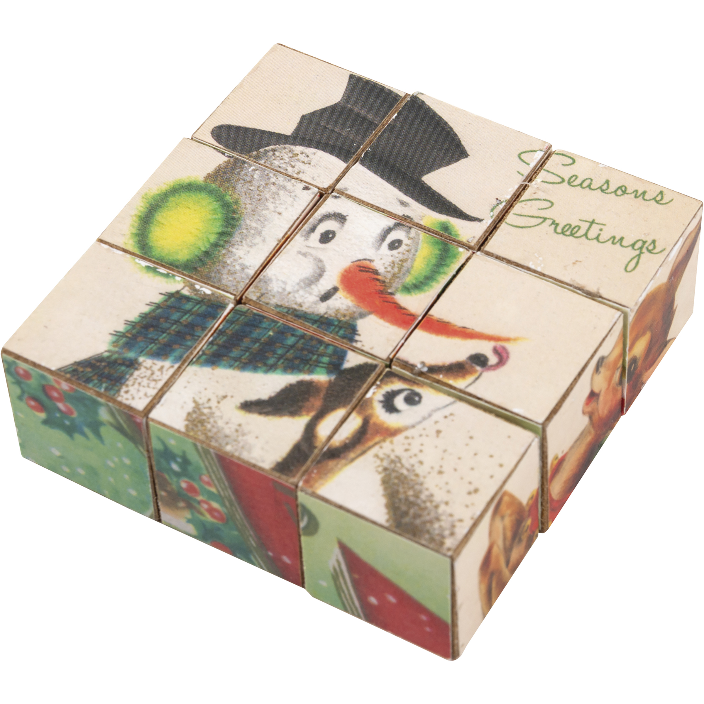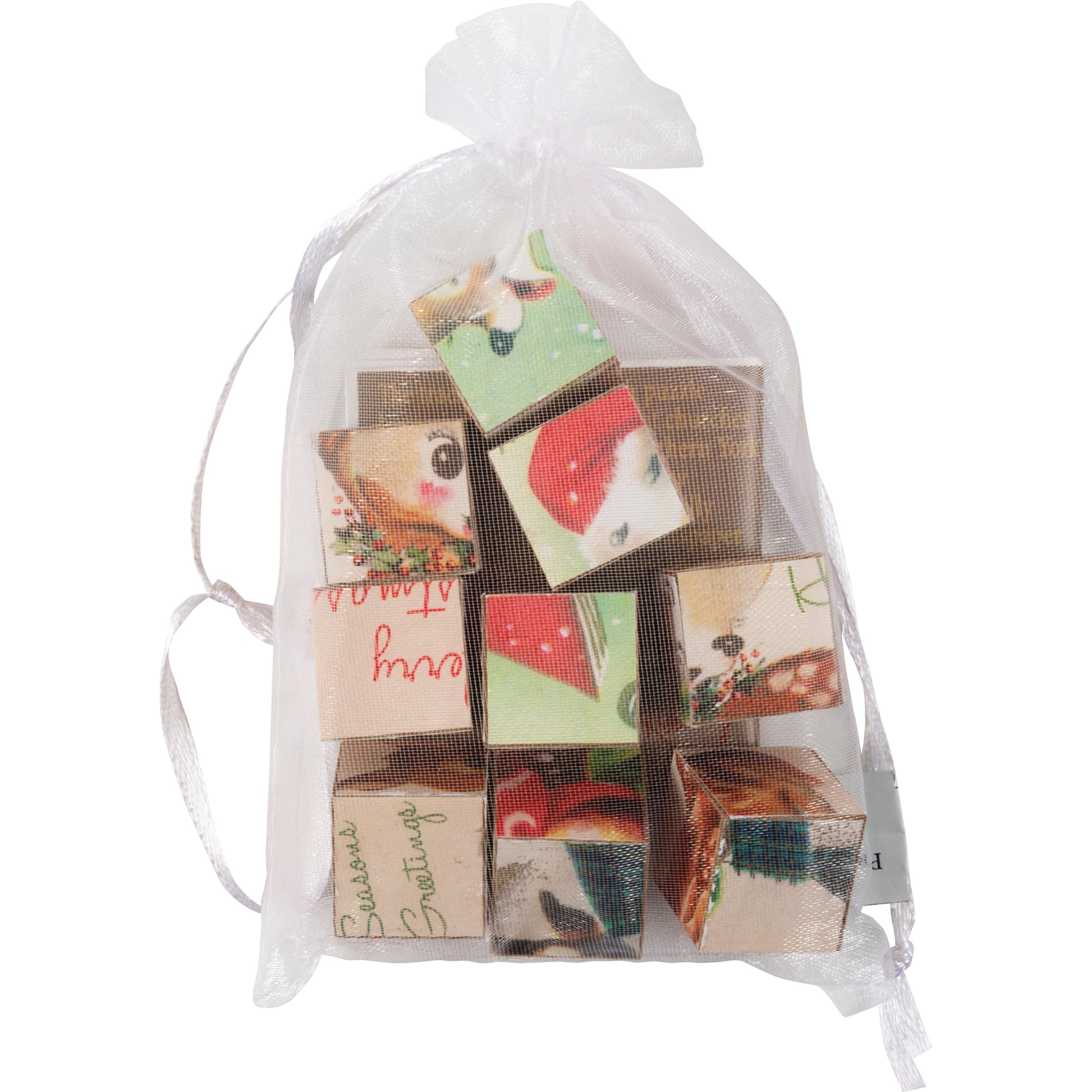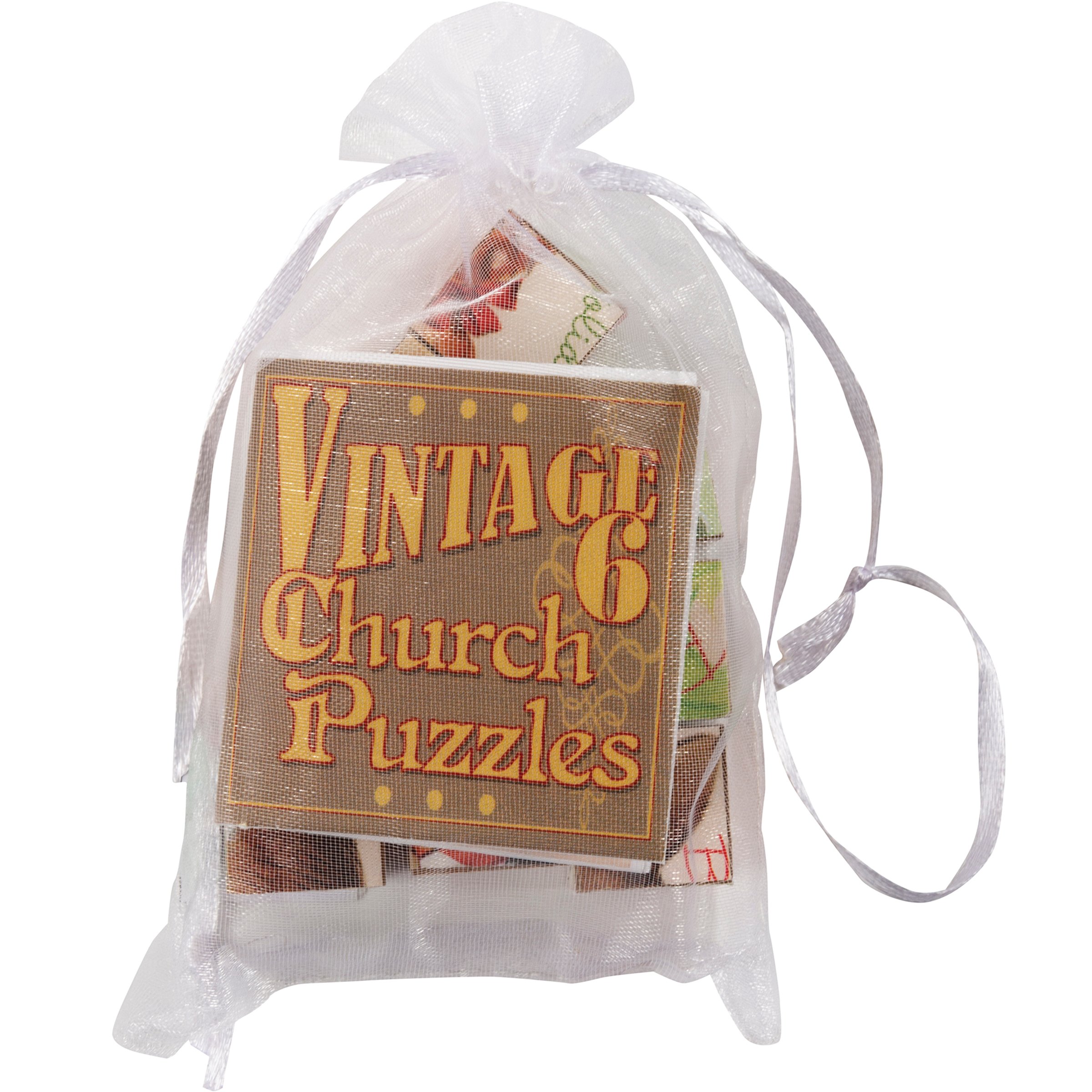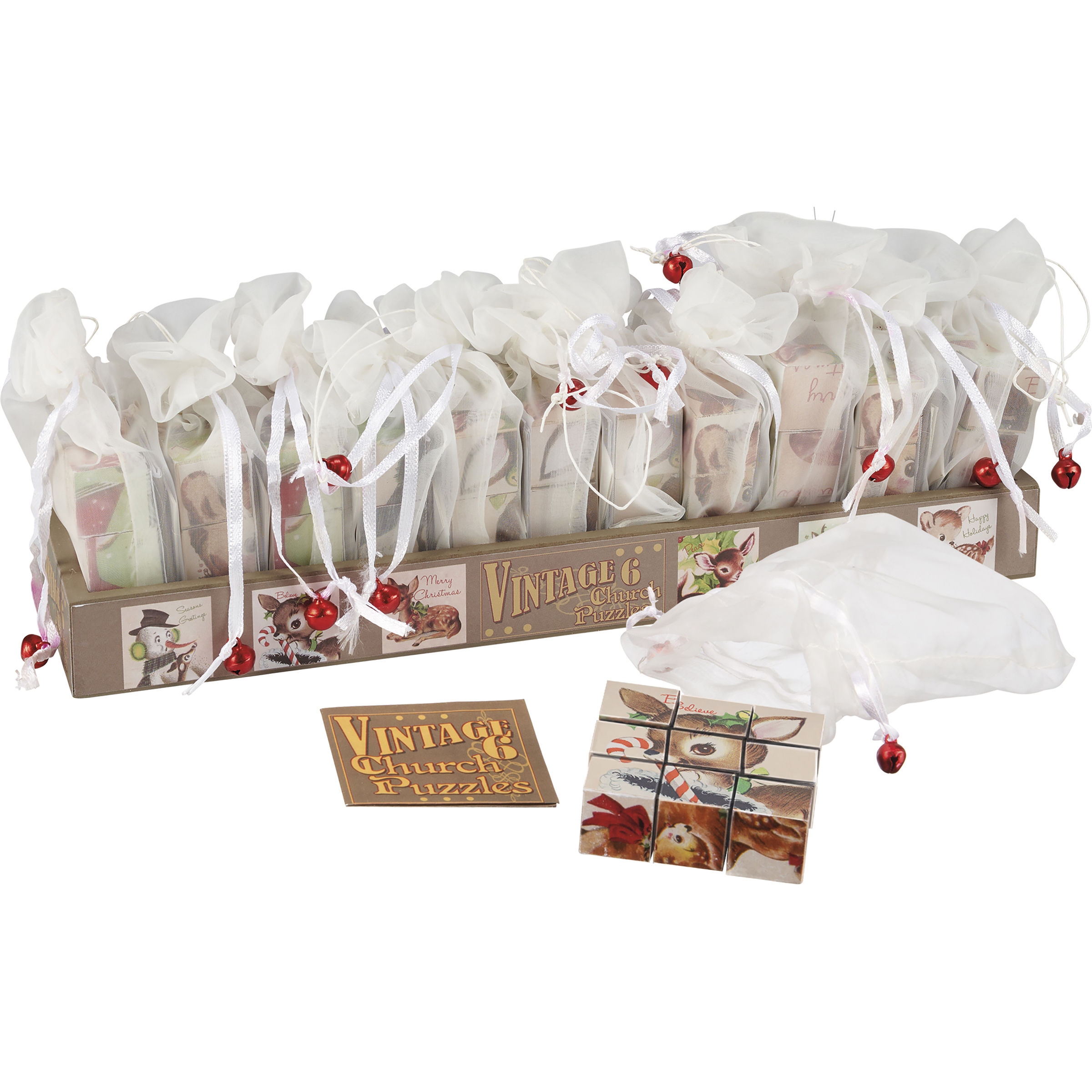 A vintage-inspired Retro Church Puzzle six-in-one set. Each drawstring bag includes 9 blocks that create 6 different puzzles with Christmas deer illustrations. Comes with illustrated counter display.