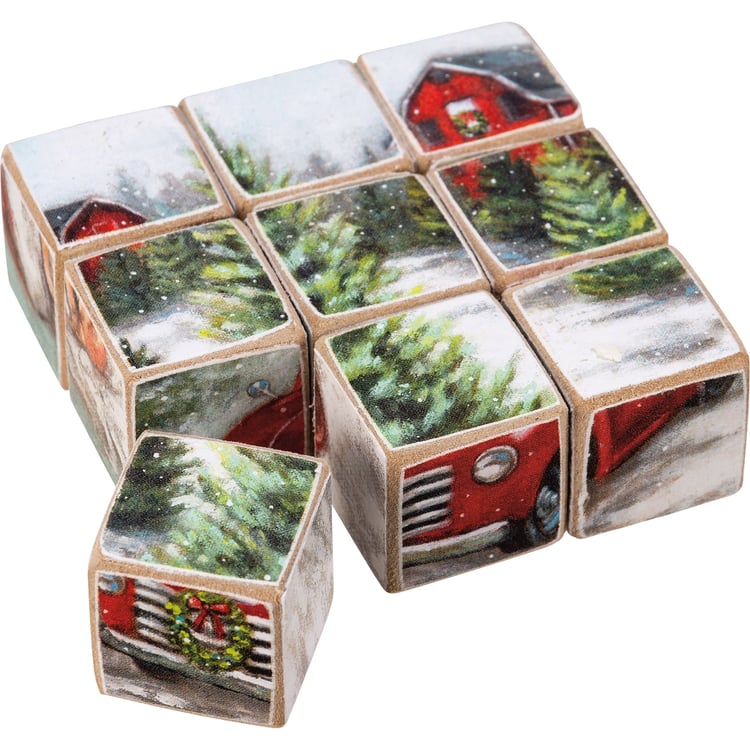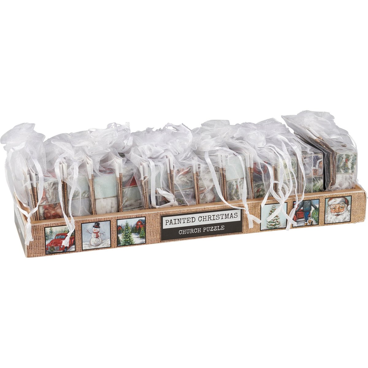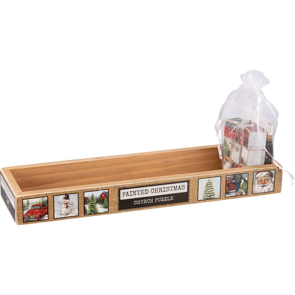 A wooden church puzzle six-in-one set. Each drawstring bag includes nine blocks printed with winter farm scene designs that create six different puzzles. Designs are replicated from original artwork painted onto burlap canvas, giving the art a unique depth and texture. Comes with coordinating display.