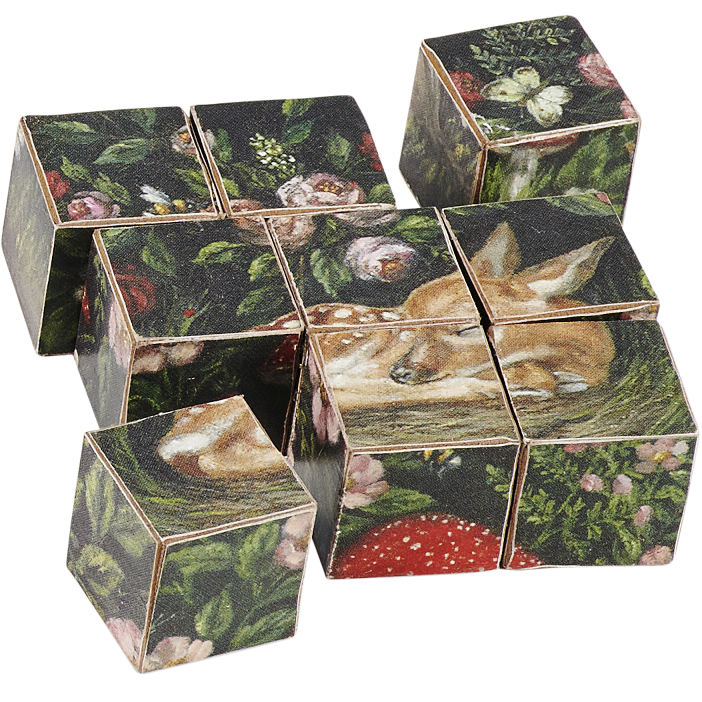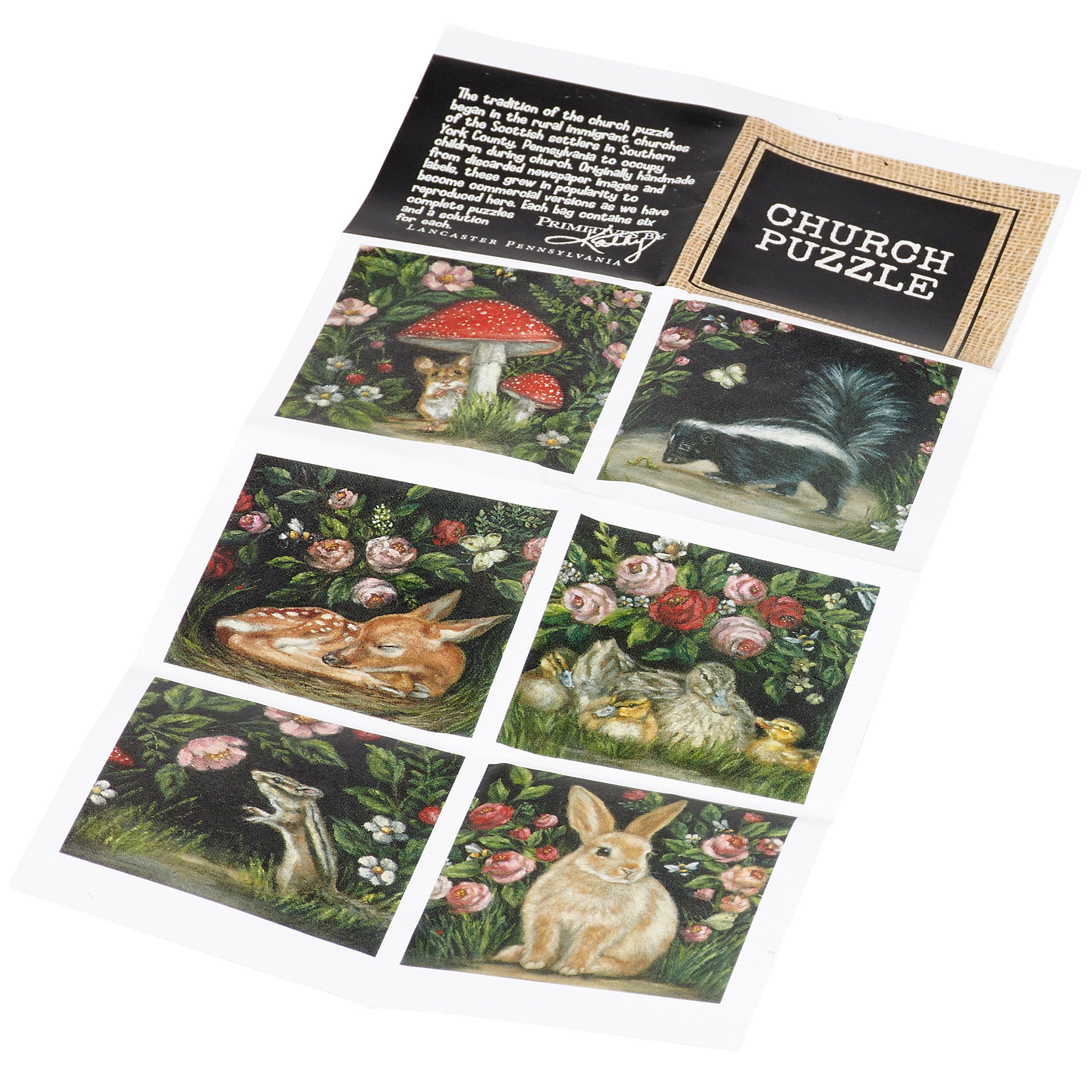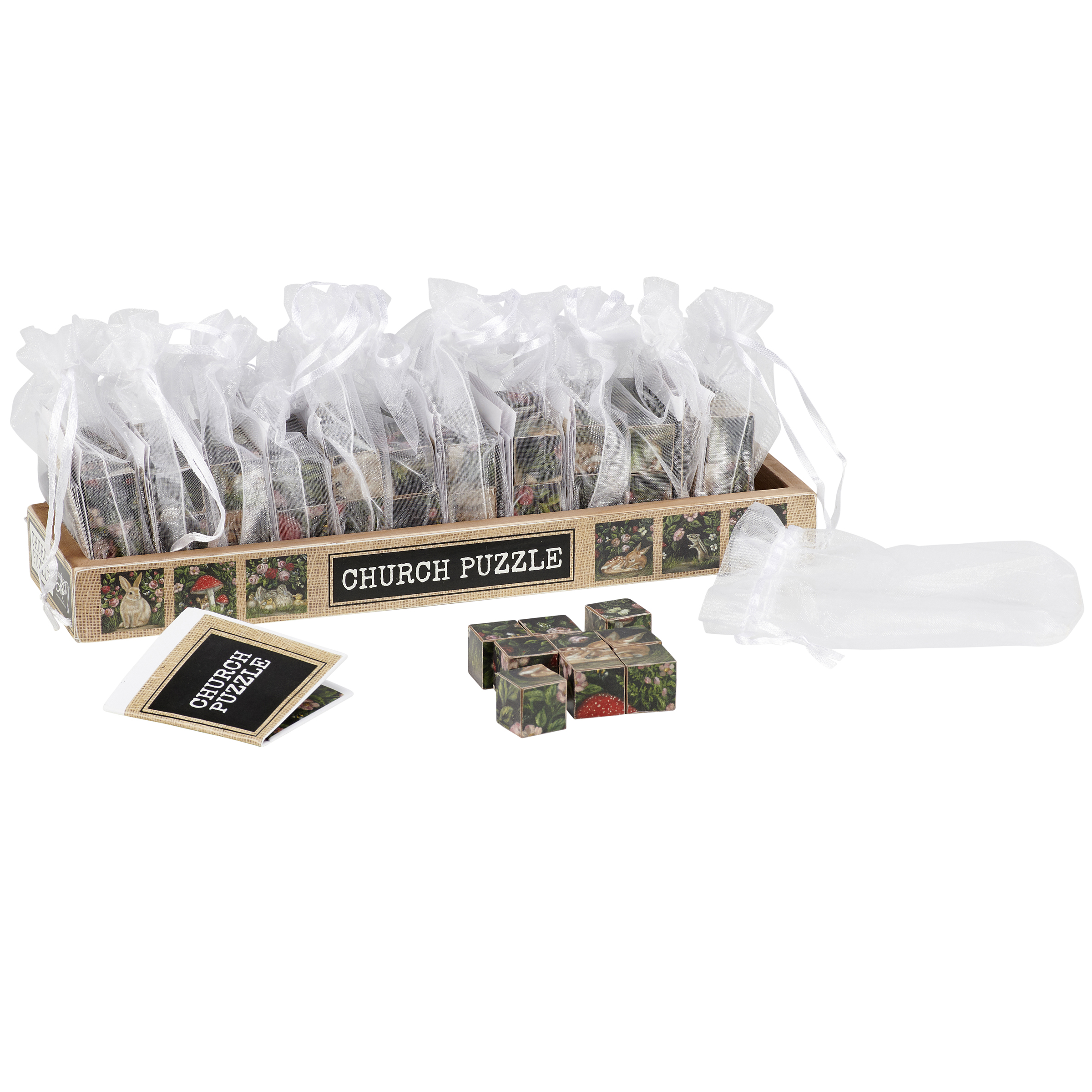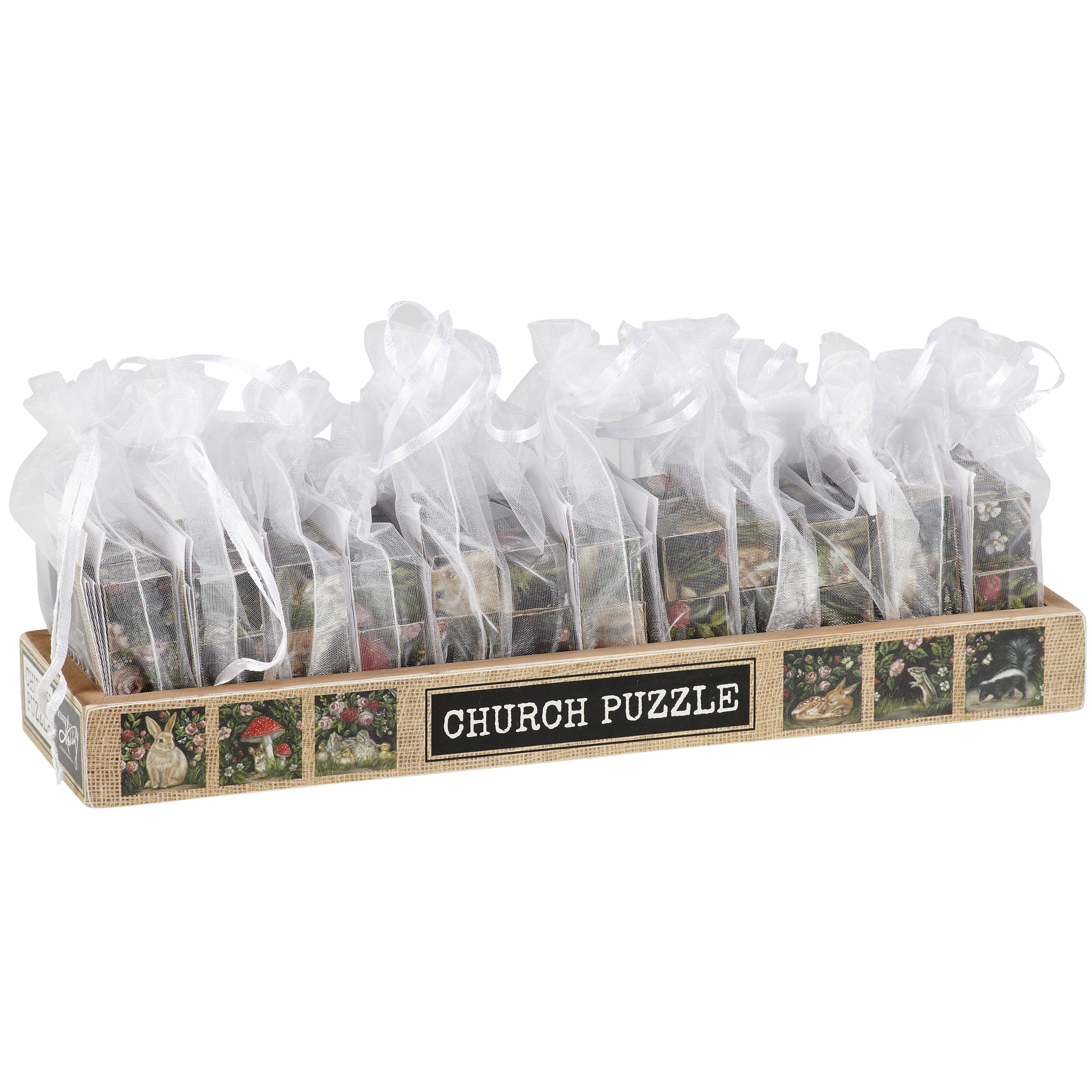 A fun church puzzle from our Easter & Spring Collection featuring 9 wooden blocks that can be pieced together to create 6 different enchanting scenes of woodland animals surrounded by spring florals in a moody color palette. Puzzle designs include bunny, mouse, ducks, fawn, chipmunk, and skunk replicated from original artwork painted onto burlap canvas, giving the art a unique depth and texture. Our Woodland Spring church puzzles are packaged in an elegant drawstring bag with an insert displaying puzzle designs for reference as well as information on the tradition of church puzzles. Counter display pictured holds 12 puzzles and displays puzzle designs on the sides. A charming giftable accessory perfect for everyday moments.