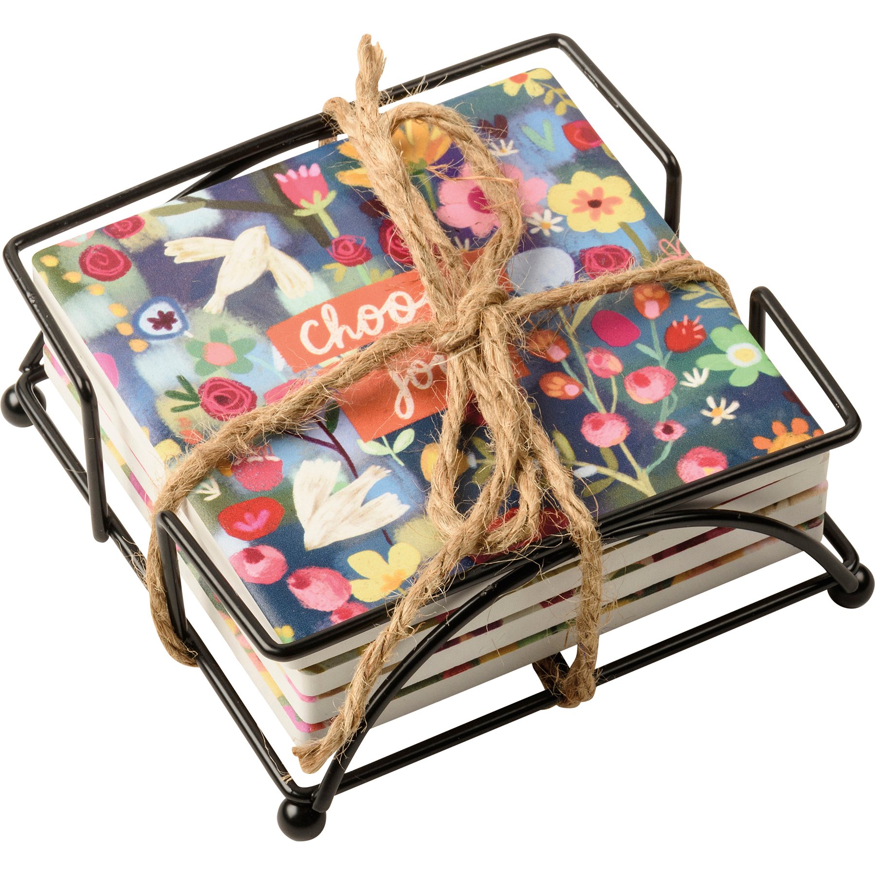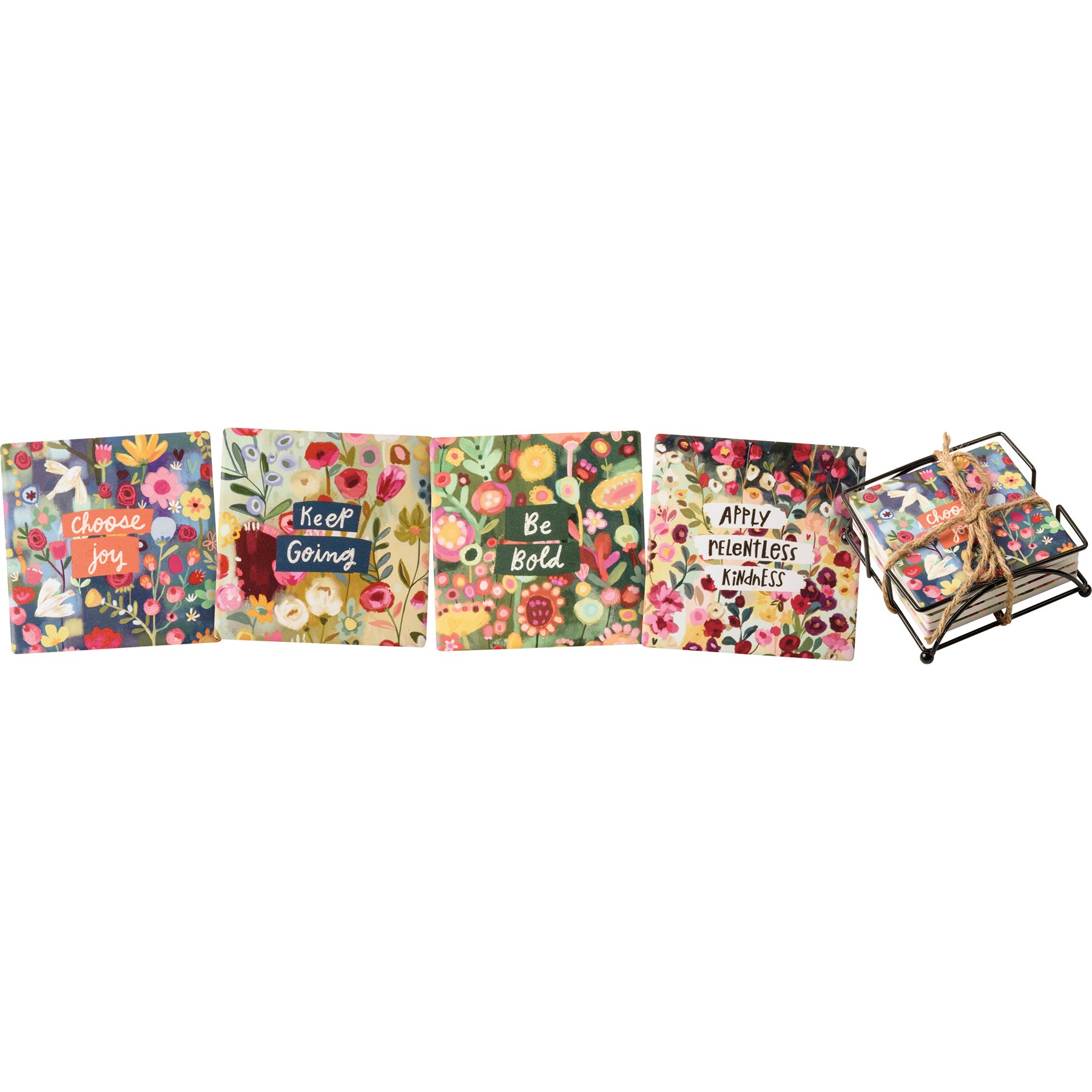 A set of four stoneware coasters with cork bases. Coasters feature vibrant floral designs with "Choose Joy," "Keep Going," "Be Bold," and "Apply Relentless Kindness" sentiments. Wire holder included.