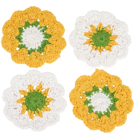 A coordinating set of four cotton coasters from our Cottagecore Collection displaying a charming crochet style for a unique handmade aesthetic. Each crochet coaster features one of two unique daisy designs. Spot clean only. Our Crochet Daisy coaster set comes packaged together with string tied around set making it great for gifting. A set of rustic home accents perfect for adding functional style any room.