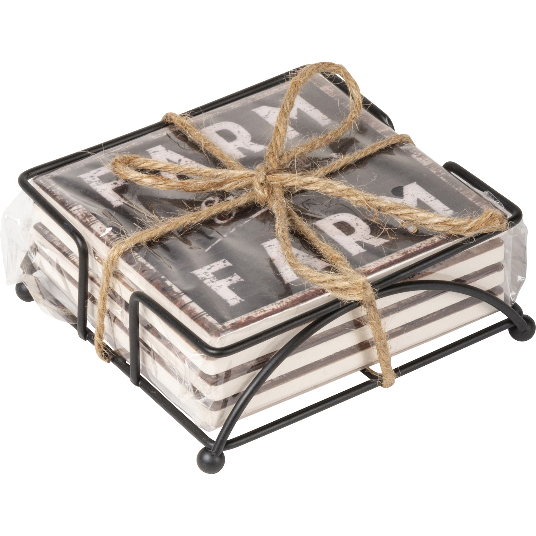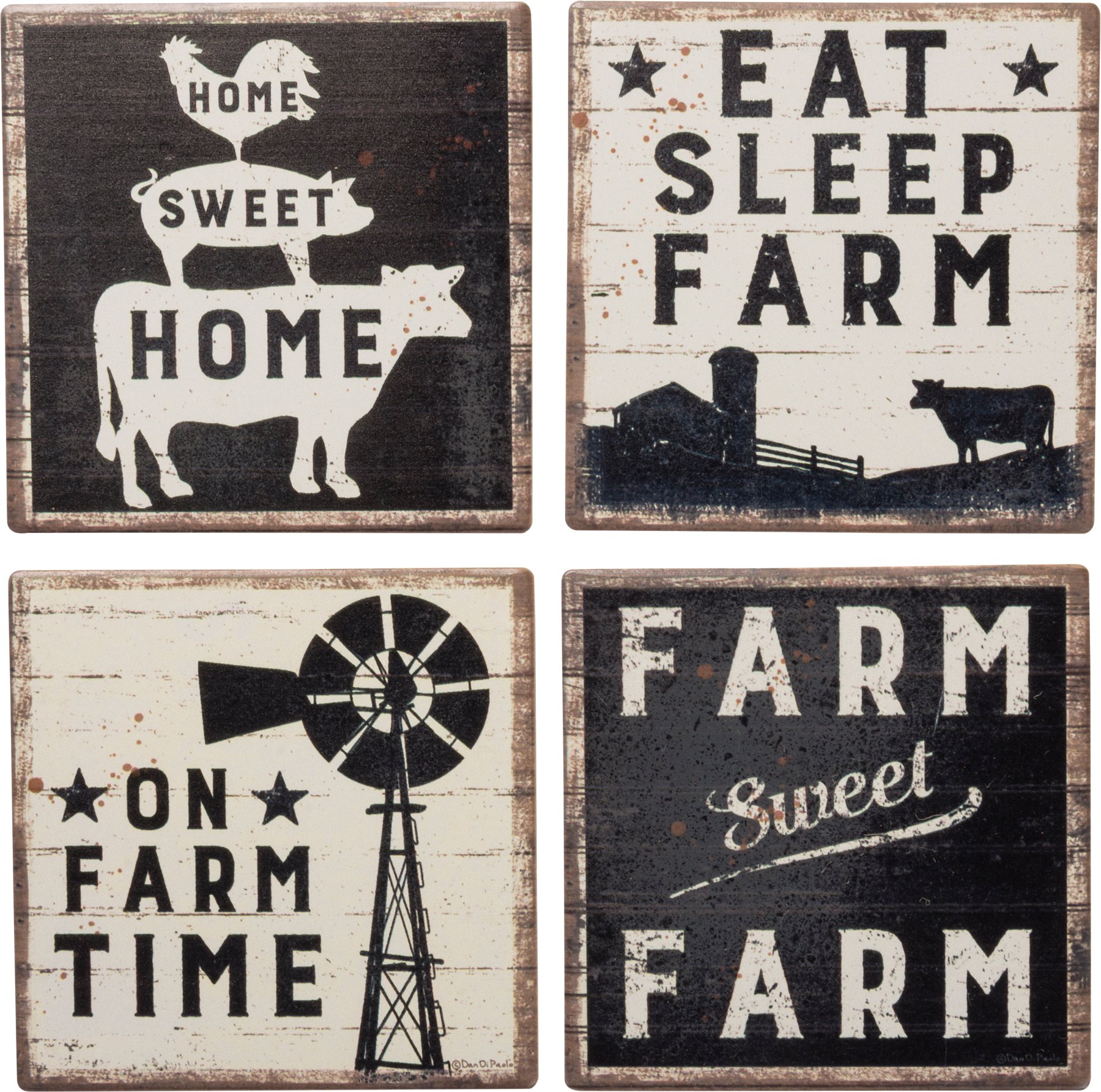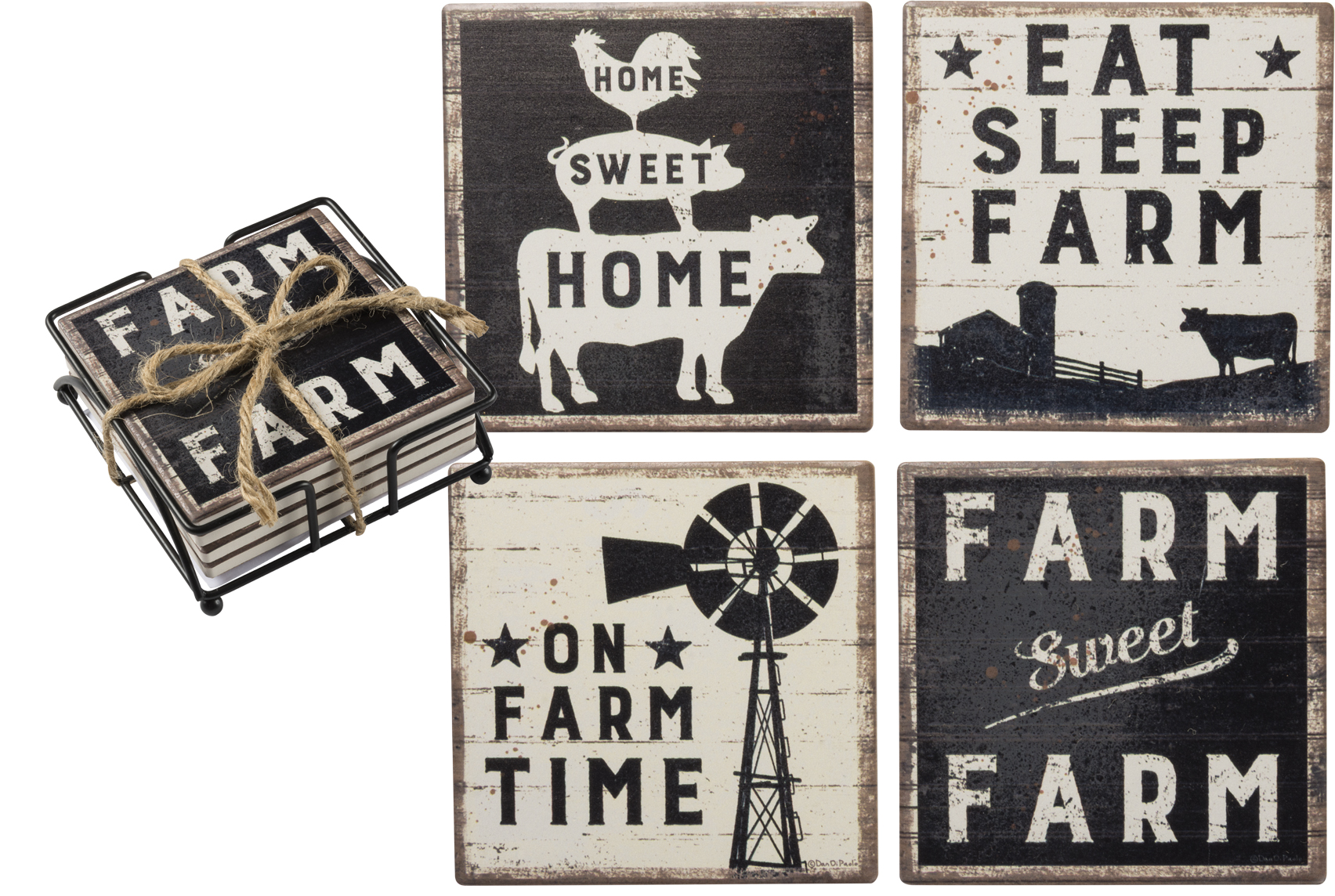 A set of four absorbent stone coasters lending "Farm Sweet Farm," "On Farm Time," "Eat - Sleep - Farm," and "Home Sweet Home" sentiments, all with slatted wood printed backgrounds and varying mill, farm, cow, and stacked animal designs. Complements well with coordinating design pieces for a rustic decor collection. Comes with wire holder.