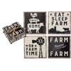 A set of four absorbent stone coasters lending "Farm Sweet Farm," "On Farm Time," "Eat - Sleep - Farm," and "Home Sweet Home" sentiments, all with slatted wood printed backgrounds and varying mill, farm, cow, and stacked animal designs. Complements well with coordinating design pieces for a rustic decor collection. Comes with wire holder.