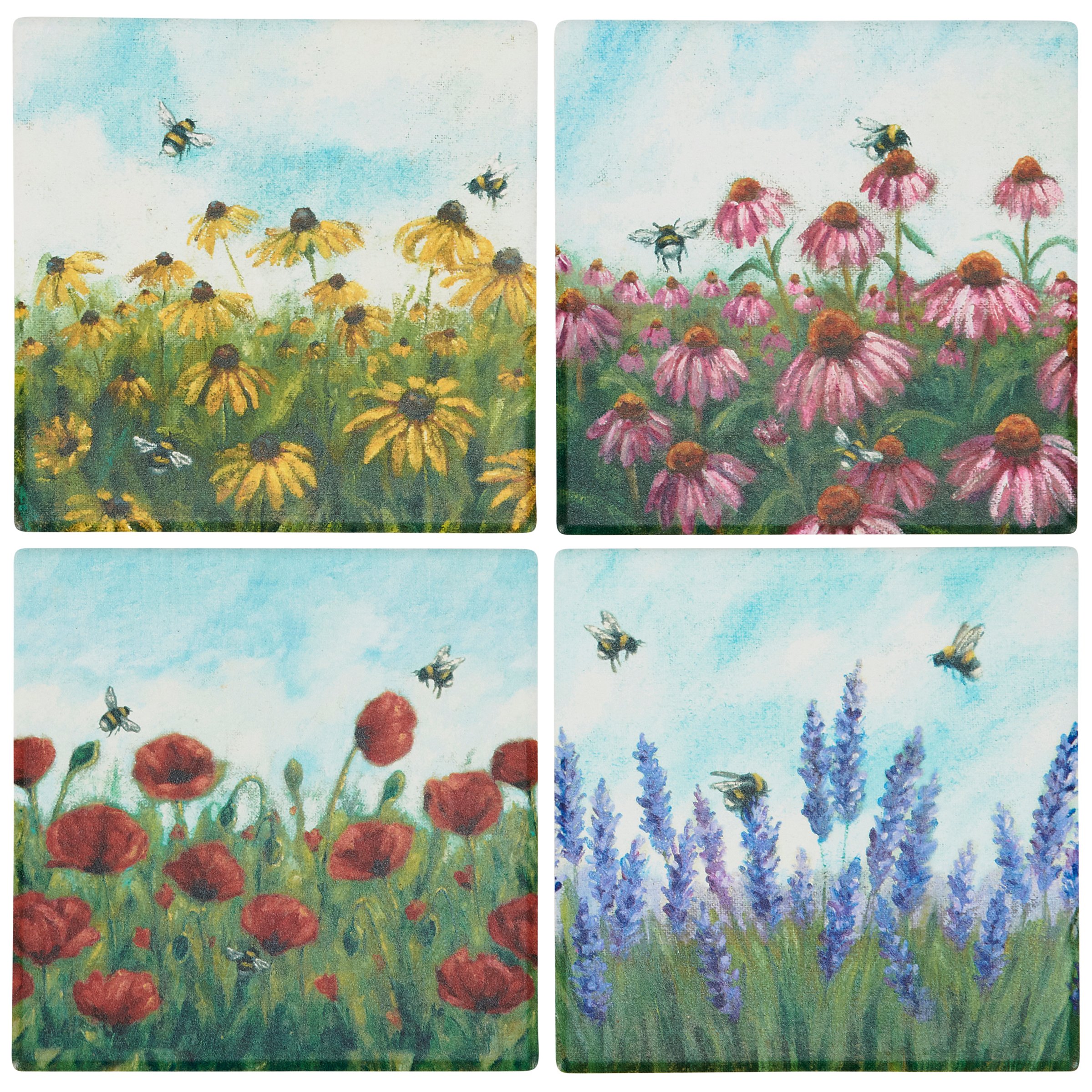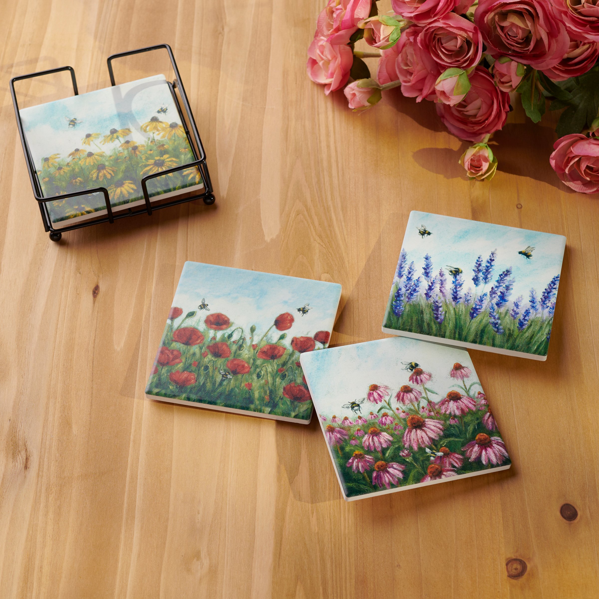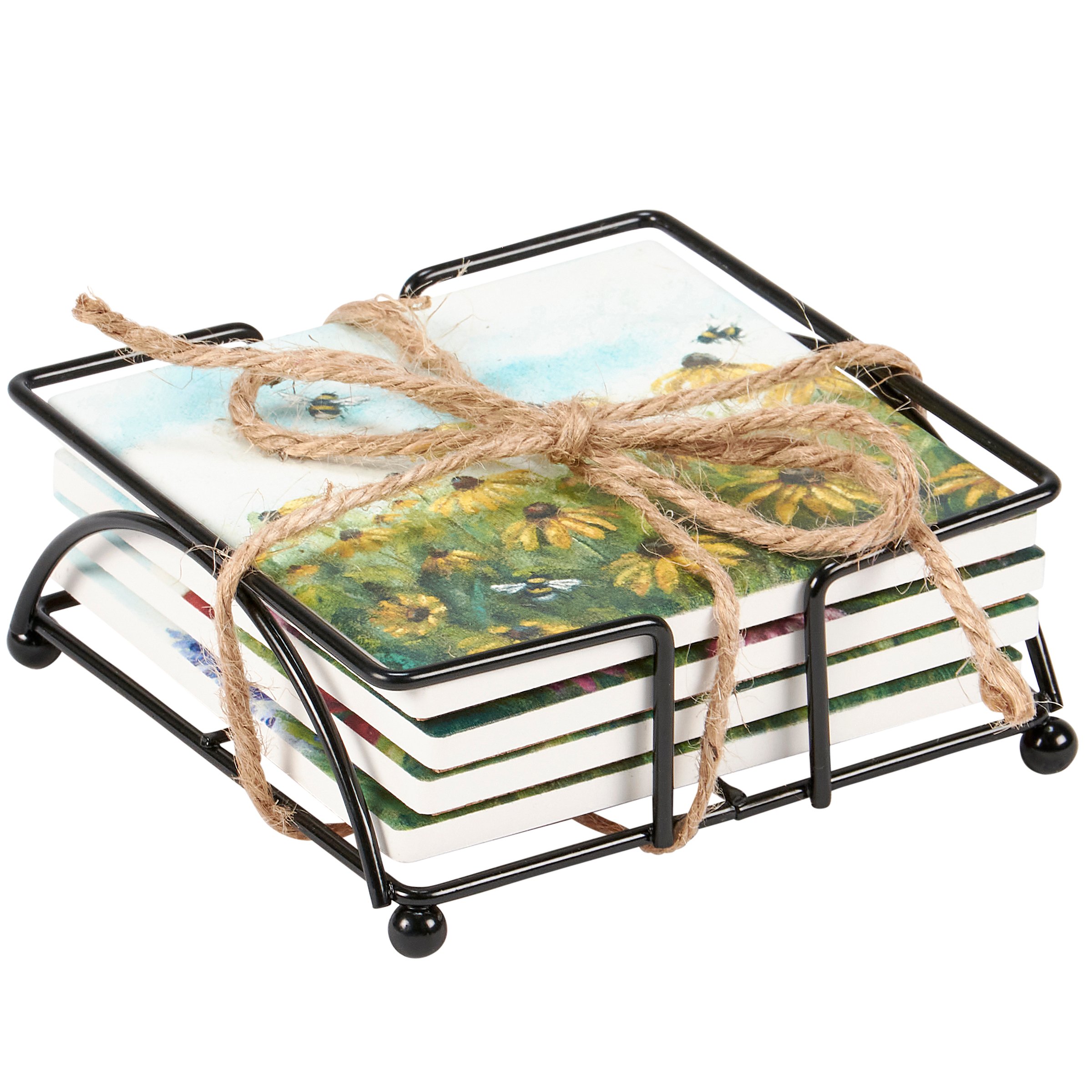 A coordinating set of four stoneware coasters with cork bases from our Garden Collection displaying hand painted designs of spring flowers with bees. Each coaster features individual designs displaying black-eyed susans, pink coneflowers, lavender, and poppies. Our Garden coaster set includes a wire holder to store coasters and comes packaged with jute rope tied around set. A charming everyday home accent perfect for adding functional style any room.