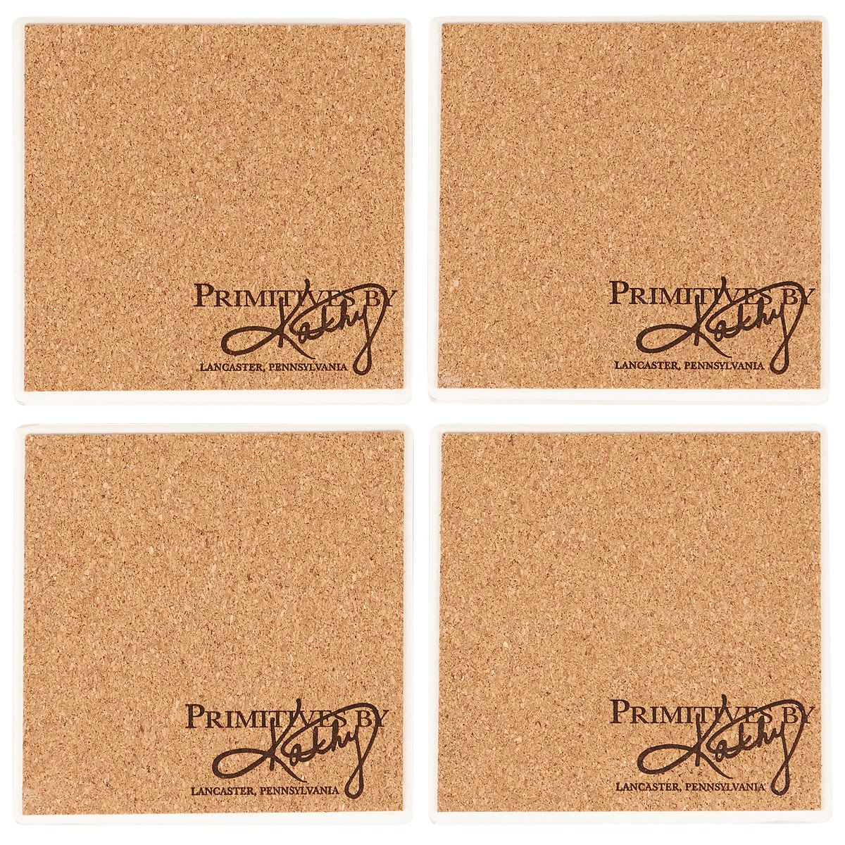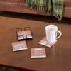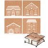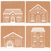 A coordinating set of four stone coasters with cork bases from our Christmas Collection displaying various gingerbread house designs. Each seasonal coaster features individual designs of a house in snow on gingerbread brown background giving the appearance of icing decorated cookies. Our Gingerbread House coaster set includes a decorative wire holder to store coasters and comes packaged with jute rope tied around set. A charming set of seasonal home accents great for gifting and adding functional style to any room.