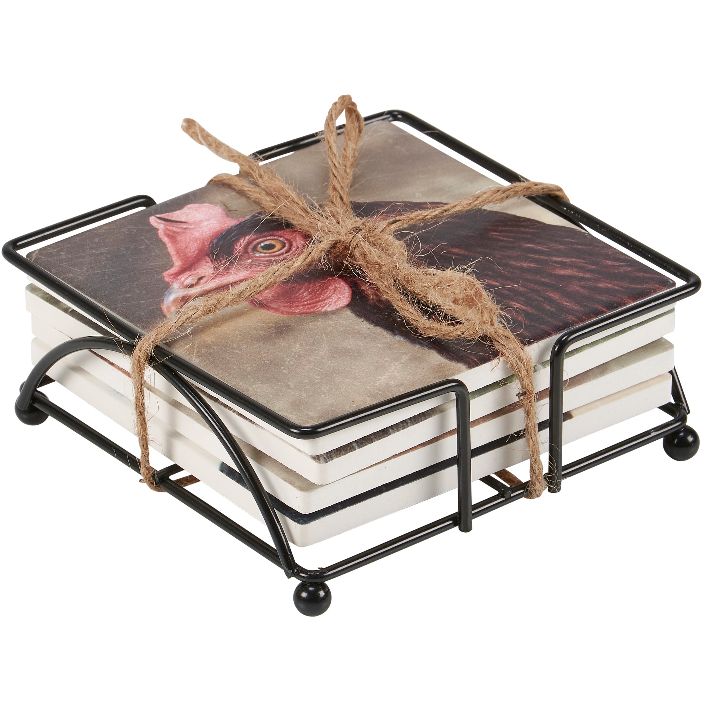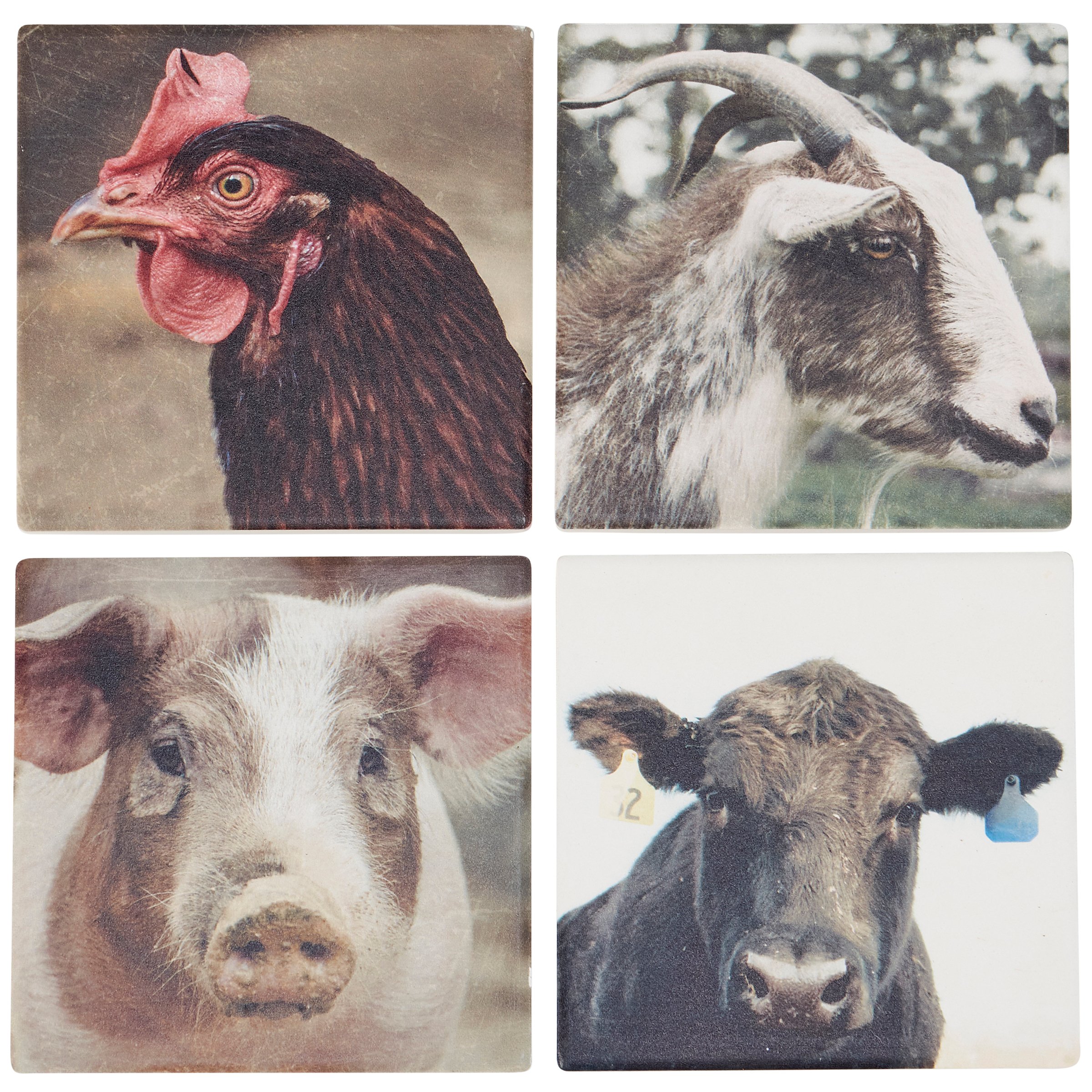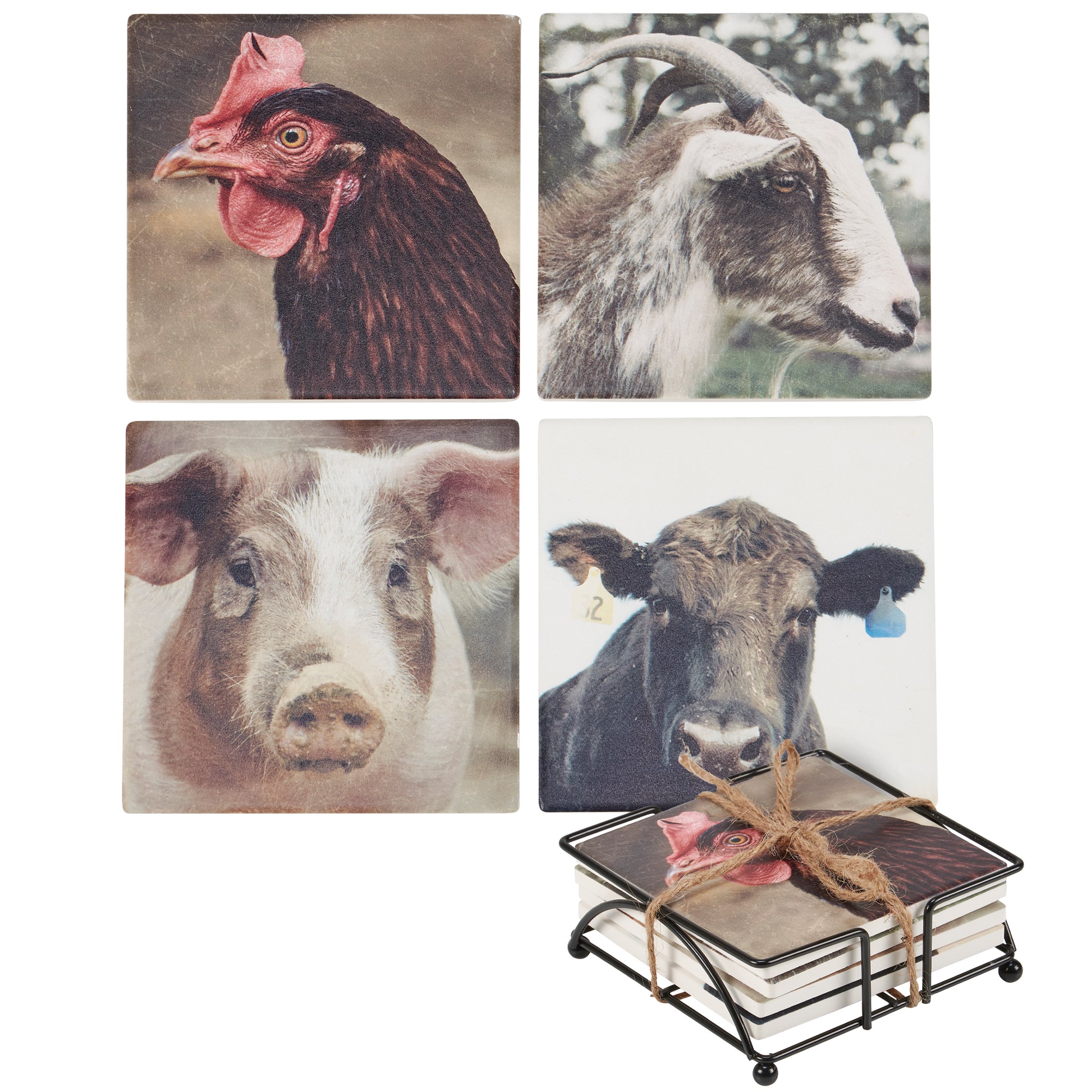 A coordinating set of four stone coasters with cork bases from our Homestead Collection displaying beautiful lifestyle photography of farm animals in everyday moments with distressed details for an aged appearance. Each coaster features individual designs including a chicken, goat, pig, and cow replicated from original photography for added interest. Our Homestead coasters include a decorative wire holder to store coasters and comes packaged with jute rope tied around set. A rustic everyday home accent perfect for adding functional style any room.