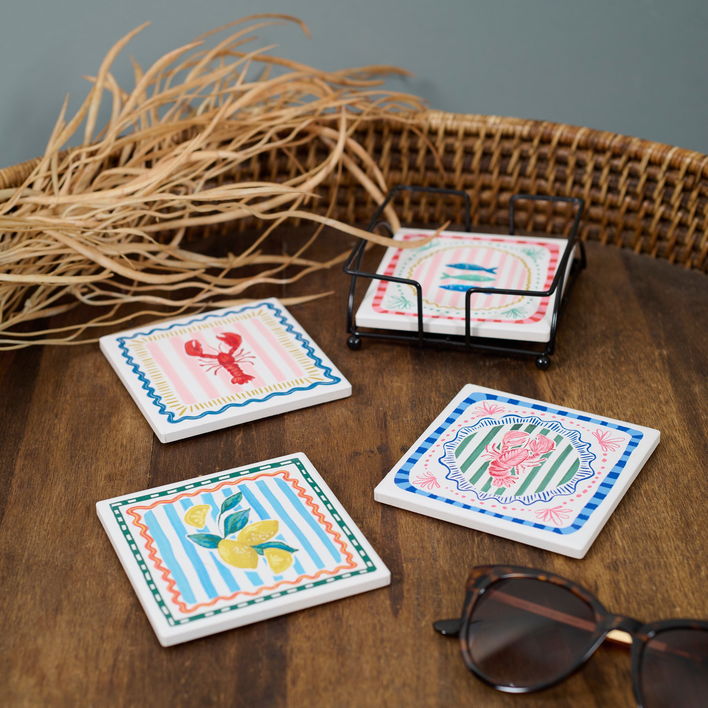 A coordinating set of four stone coasters with cork bases from our Beach Collection displaying colorful seafood themed designs inspired by Italian coastal style. Each tile coaster features individual coastal designs replicated from original hand painted watercolor art including lobsters, lemons, and fish with complementing borders and patterns. Our Italian Coastal coaster set includes a wire holder to store coasters and comes packaged with jute rope tied around set making it great for gifting and easy store display. A set of coastal themed home accents perfect for adding functional style any room.