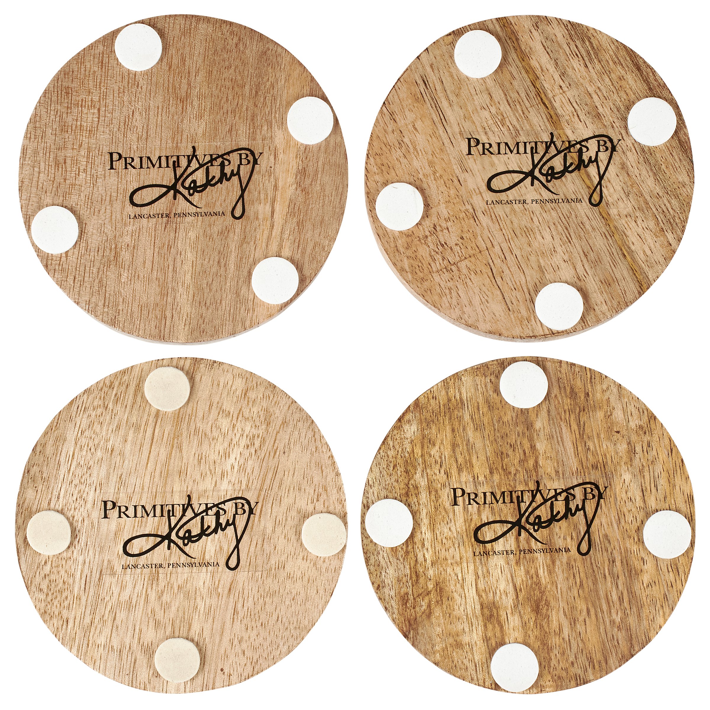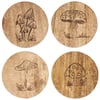 A set of four natural wood coasters from our Cottagecore Collection displaying mushroom designs wood burned for added detail. Each coaster features individual mushroom designs and foam supports to protect surfaces. Our Mushrooms coaster set comes tied together with jute rope. A rustic and functional home accent perfect for everyday use.