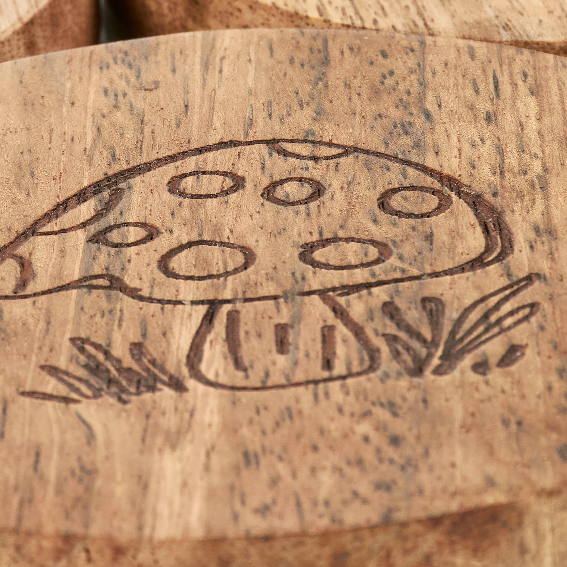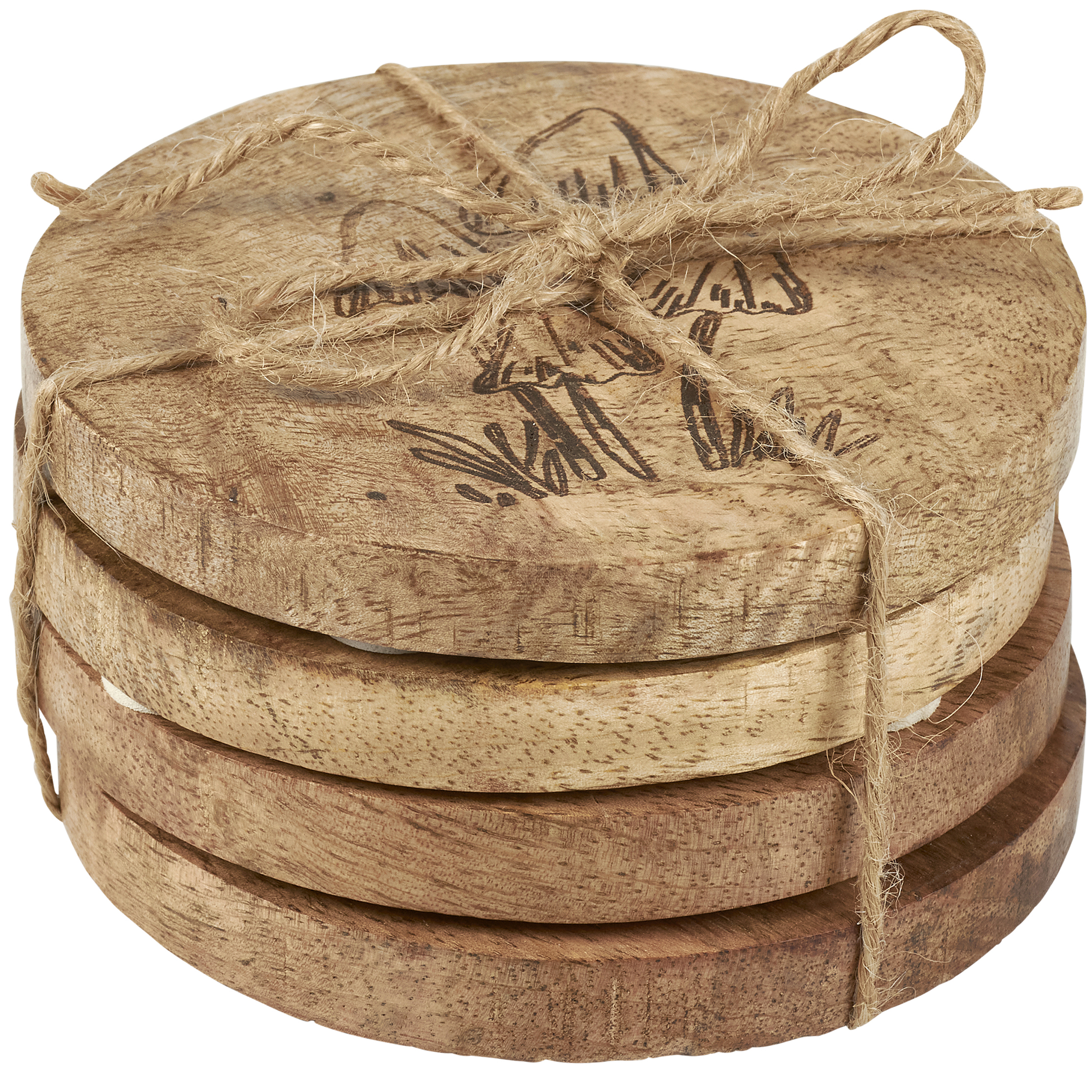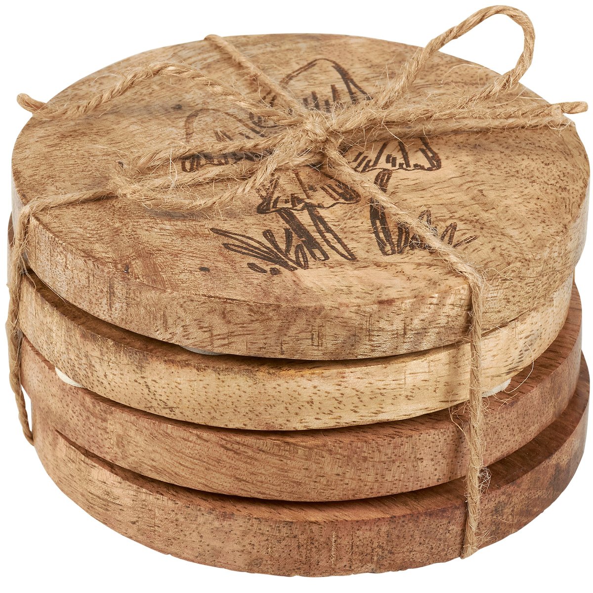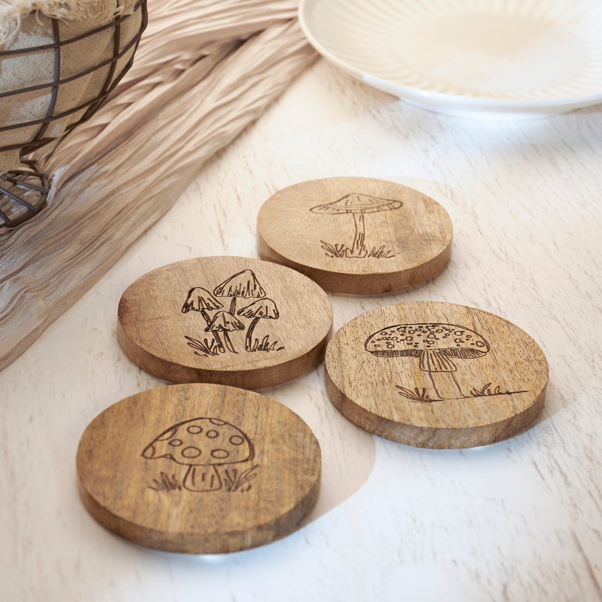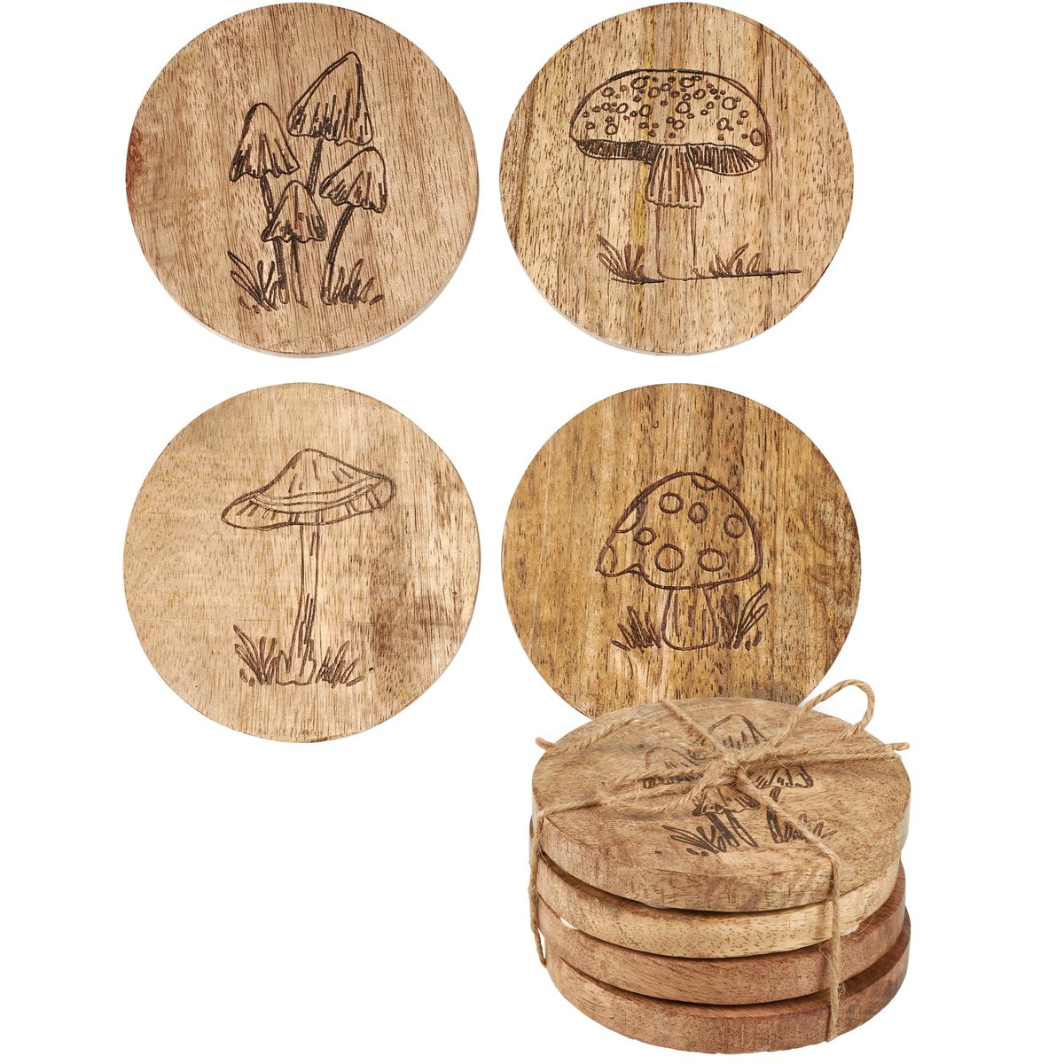 A set of four natural wood coasters from our Cottagecore Collection displaying mushroom designs wood burned for added detail. Each coaster features individual mushroom designs and foam supports to protect surfaces. Our Mushrooms coaster set comes tied together with jute rope. A rustic and functional home accent perfect for everyday use.