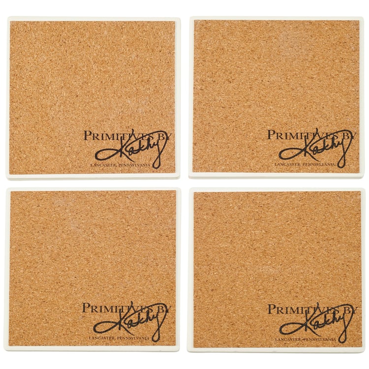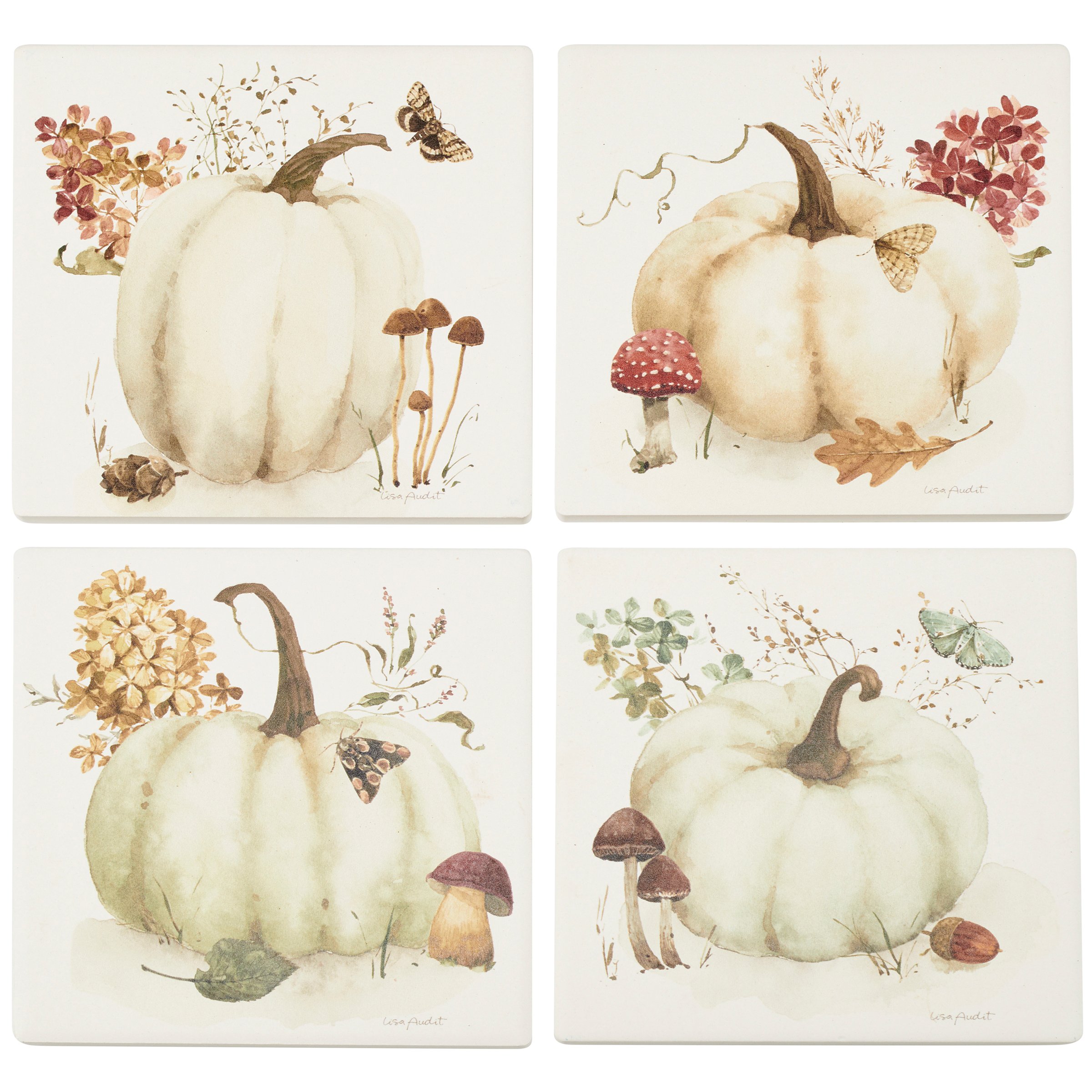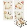 A coordinating set of four stone coasters with cork bases from our Fall & Harvest Collection displaying hand painted autumn scenes of white pumpkins surrounded by fall foliage. Each seasonal coaster features individual designs replicated from original artwork hand painted in a delicate watercolor style. Our Pumpkin coaster set includes a decorative wire holder to store coasters and comes packaged with jute rope tied around set. A charming set of seasonal home accents great for gifting and adding functional style any room.