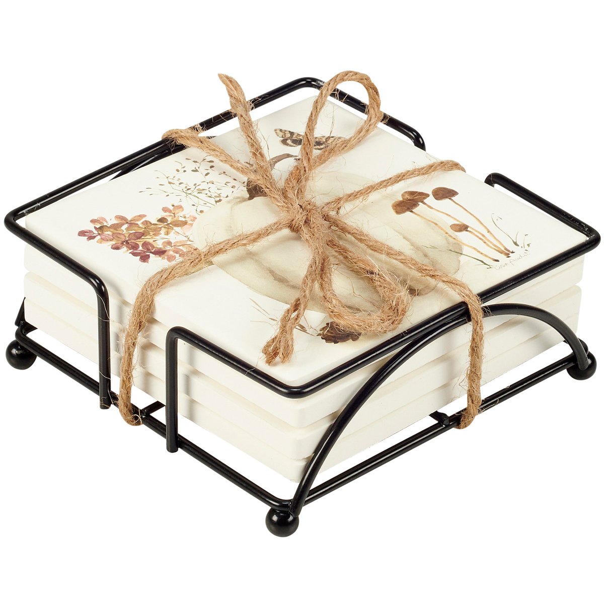 A coordinating set of four stone coasters with cork bases from our Fall & Harvest Collection displaying hand painted autumn scenes of white pumpkins surrounded by fall foliage. Each seasonal coaster features individual designs replicated from original artwork hand painted in a delicate watercolor style. Our Pumpkin coaster set includes a decorative wire holder to store coasters and comes packaged with jute rope tied around set. A charming set of seasonal home accents great for gifting and adding functional style any room.