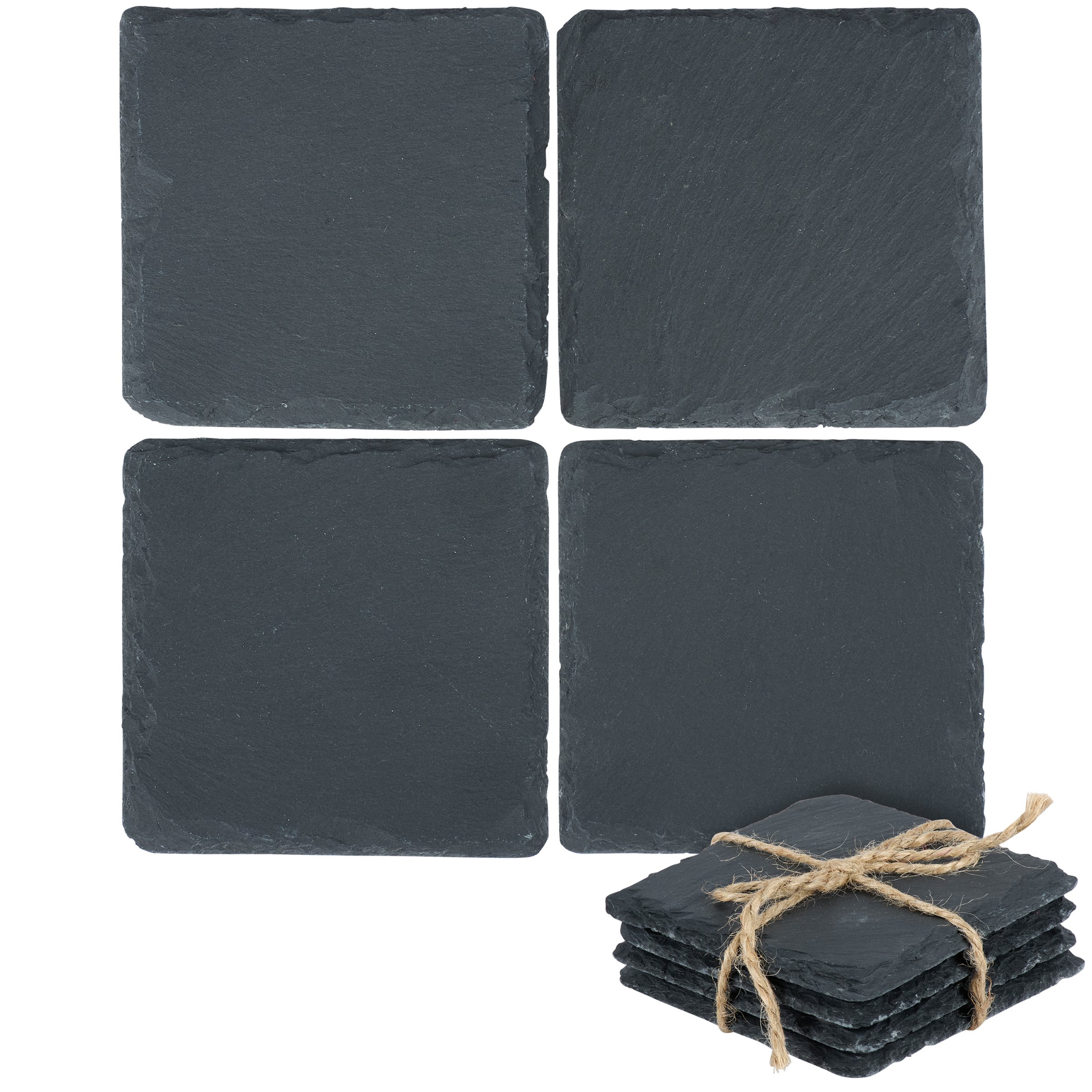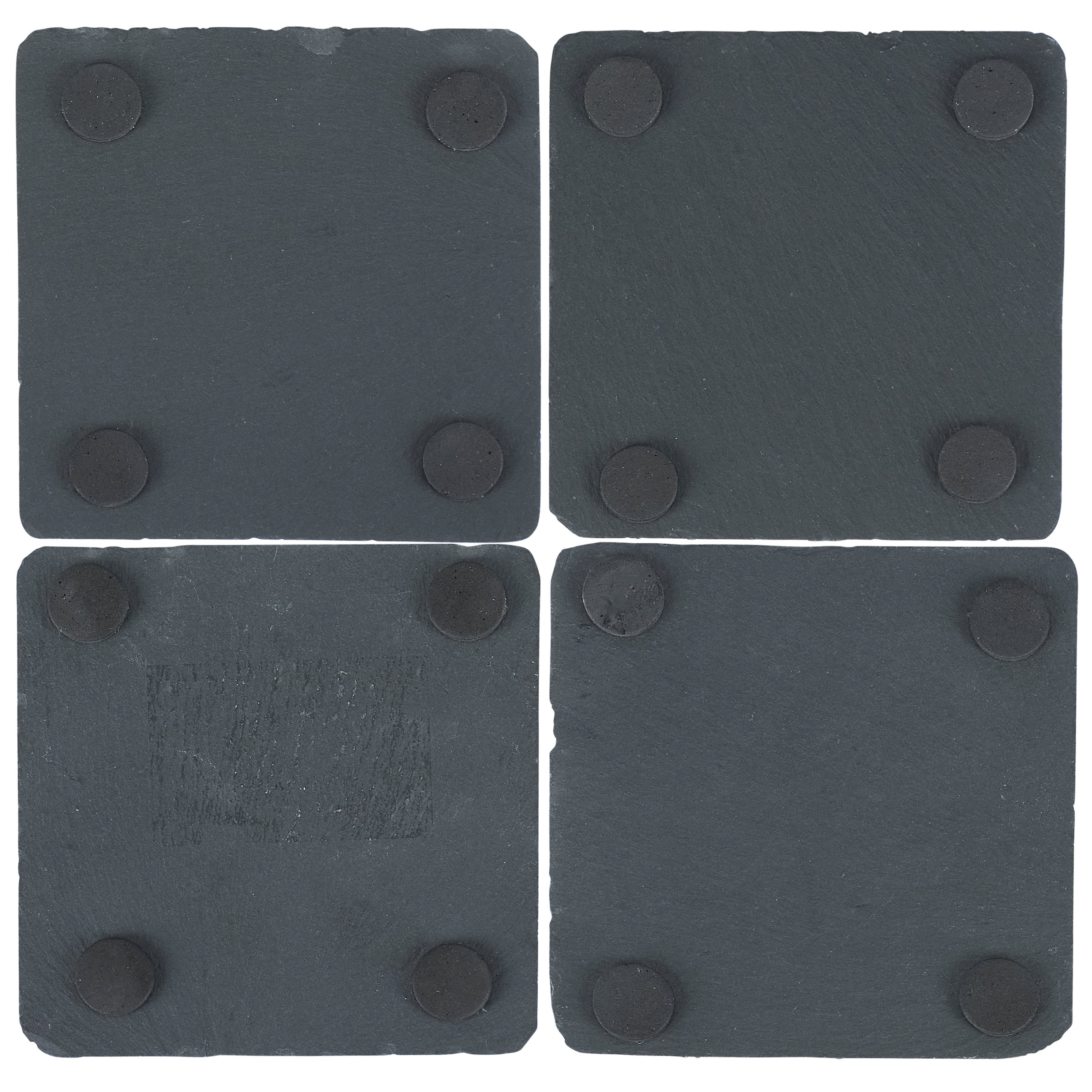 A coordinating set of four slate coasters from our Home Collection displaying a natural rock texture along the edges. Each slate coaster features soft pads attached to the bottom for safe placement on surfaces. Our Slate coaster set comes packaged with jute rope tied around set making it great for gifting and easy store display. A set of slate home accents perfect for adding functional style any room.