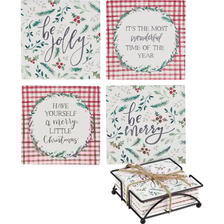 A coordinating set of four stoneware coasters with cork bases from our Christmas Collection displaying hand painted holiday designs in a soft watercolor style. Each coaster features individual designs including Christmas greenery with red gingham and sentiments that read "Be Jolly - It's The Most Wonderful Time Of The Year - Have Yourself A Merry Little Christmas - Be Merry." Our The Holidays coaster set includes a wire holder to store coasters and comes packaged with jute rope tied around set. A lovely and functional seasonal home accent perfect for any room.
