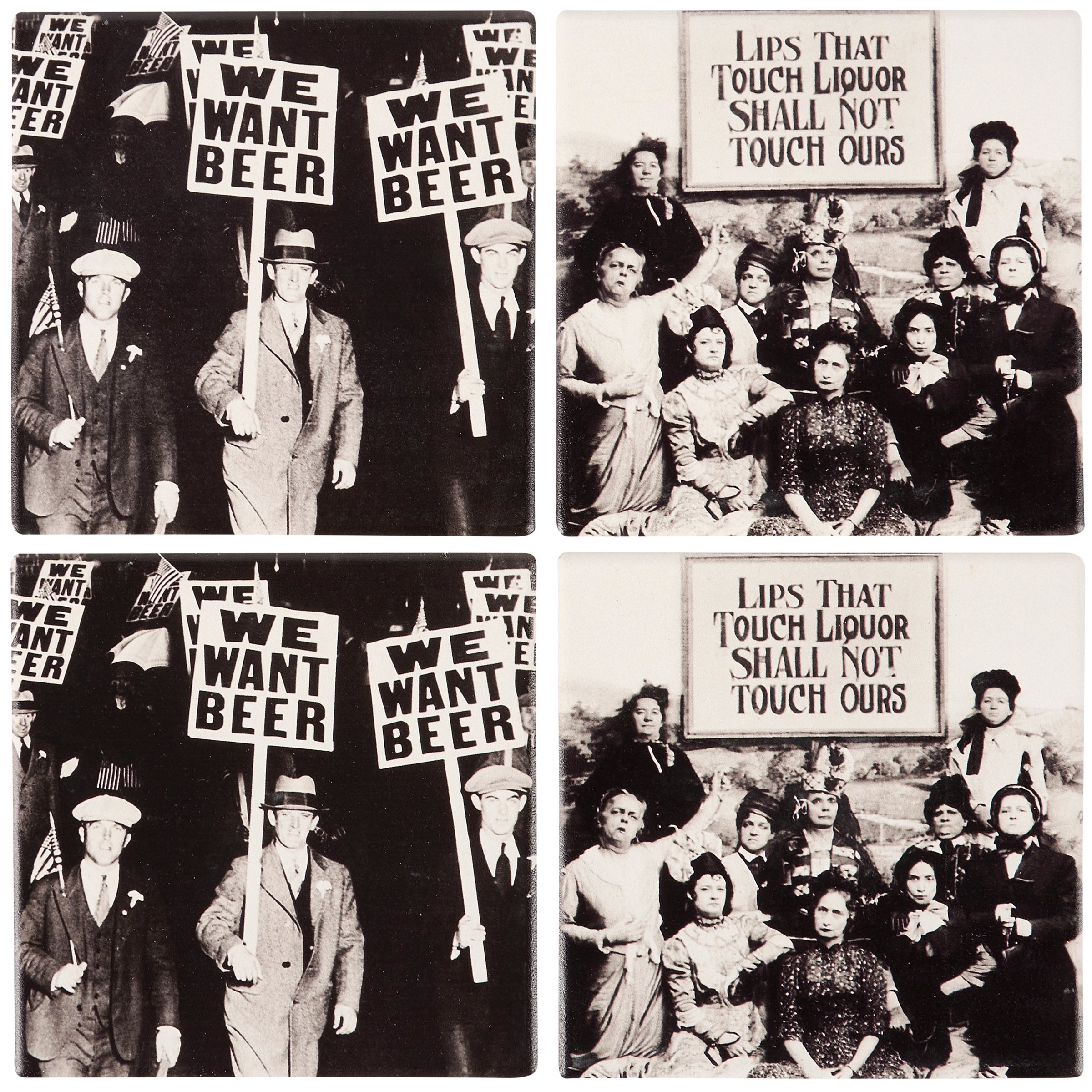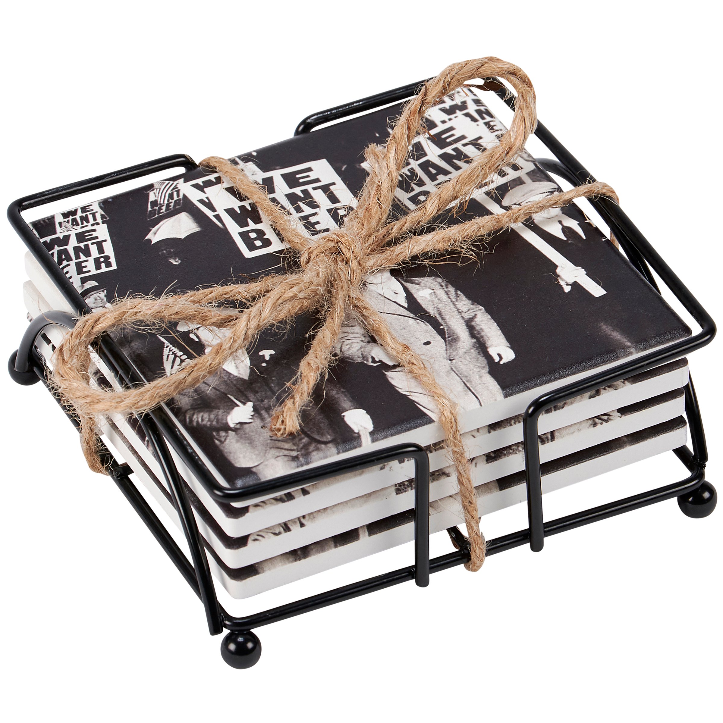 A coordinating set of four stoneware coasters with cork bases from our Art Deco Collection displaying vintage photos of protestors from the prohibition era. Coasters feature two of each vintage design. Our We Want Beer coaster set includes a wire holder to store coasters and comes packaged with jute rope tied around set. A set of vintage beer-themed home accents perfect for adding functional style any room.