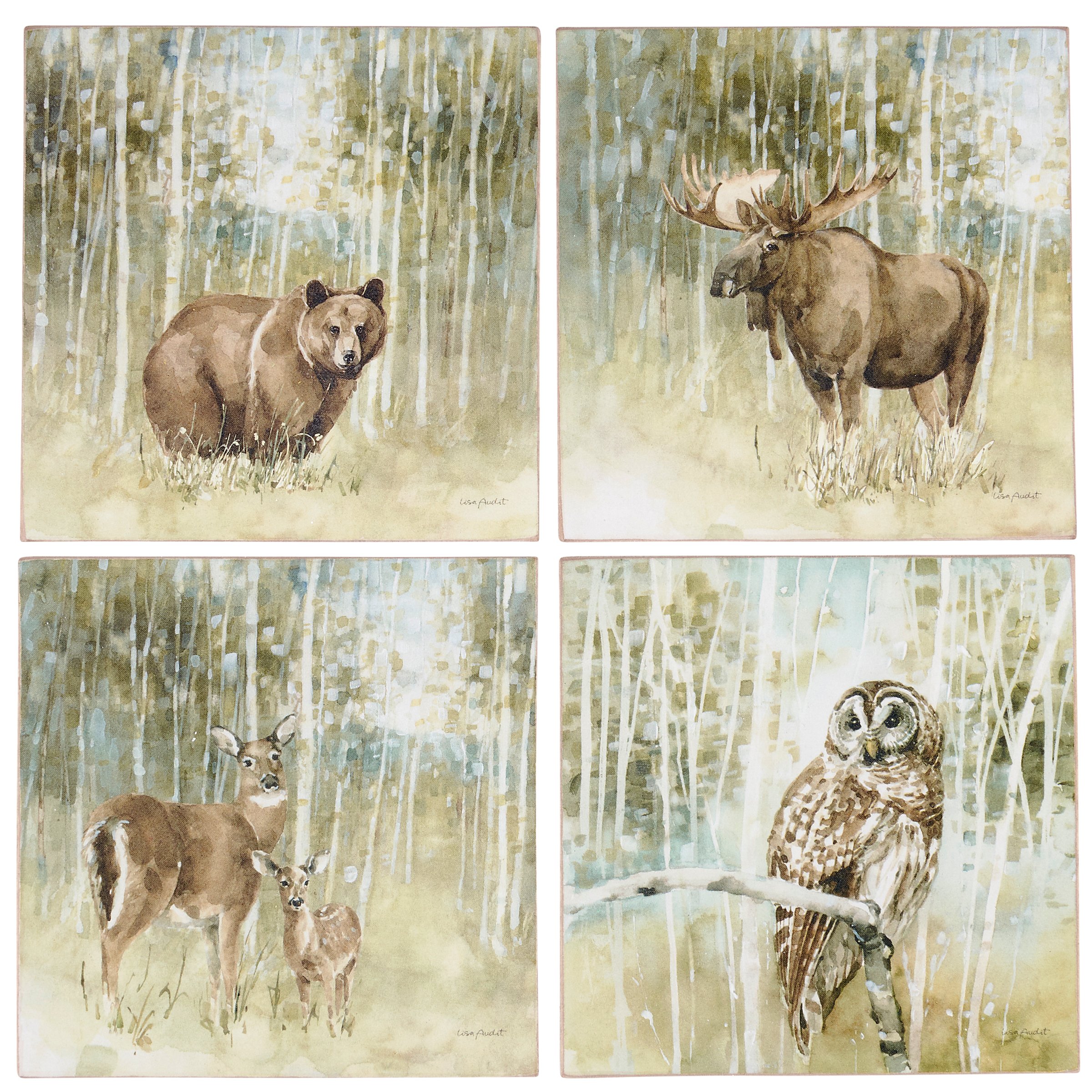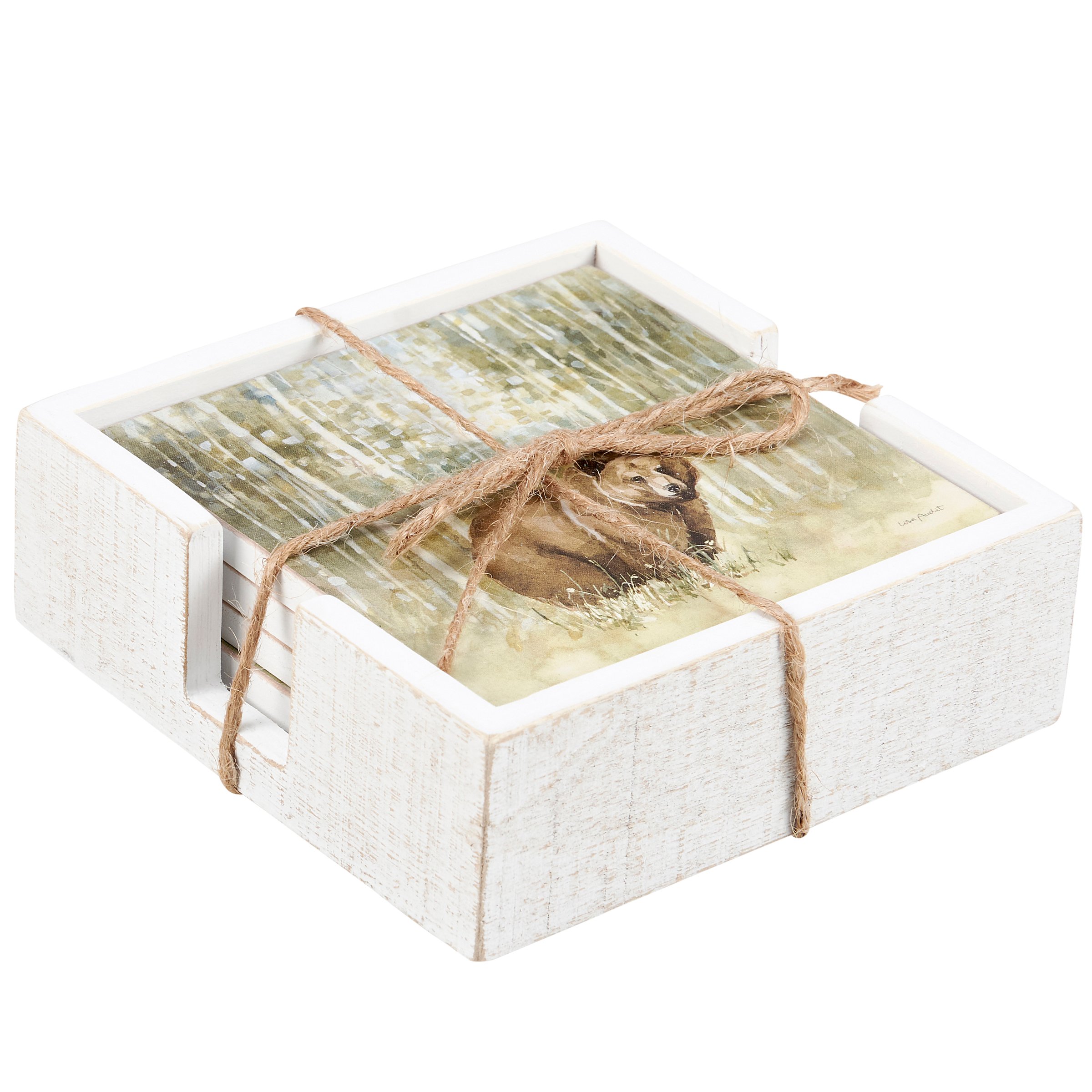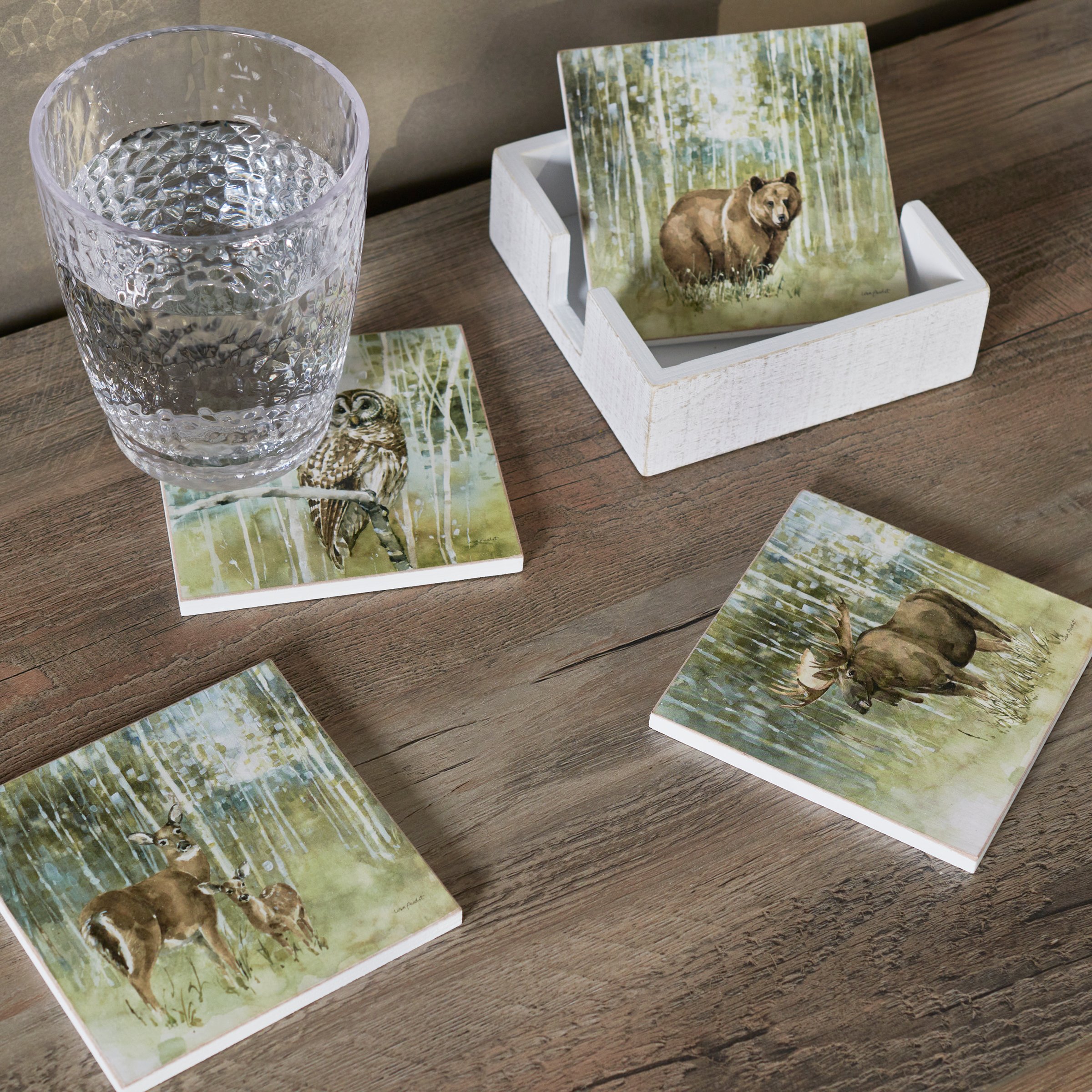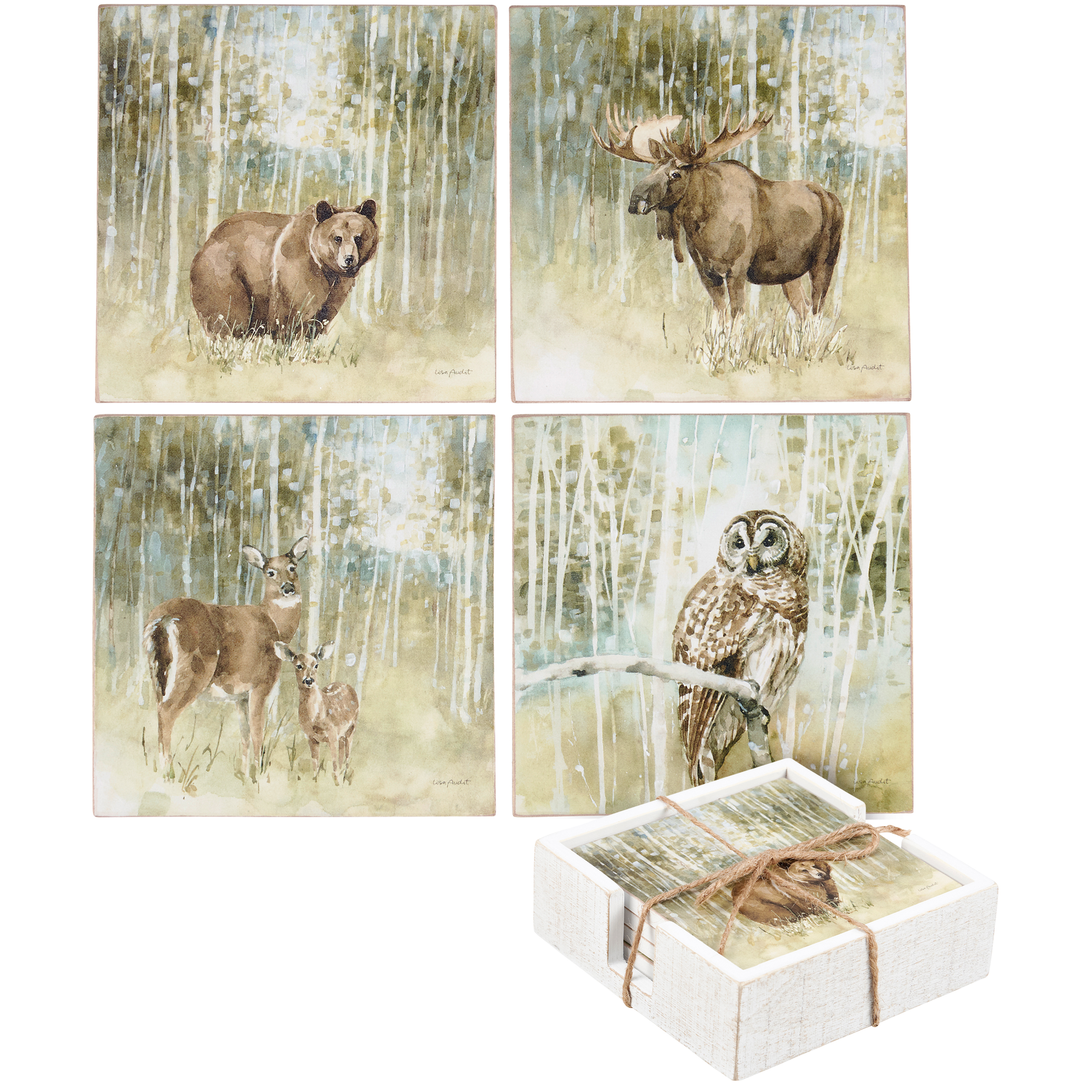 A coordinating set of four wooden coasters from our Lake & Cabin Collection displaying vivid hand painted scenes of woodland animals surrounded by trees. Each coaster features individual designs including a bear, moose, deer, and owl in a forest inspired color palette. Our Woodland Animals coaster set includes a white wooden holder to store coasters and comes packaged with jute rope tied around set. A rustic everyday home accent perfect for adding functional style any room.