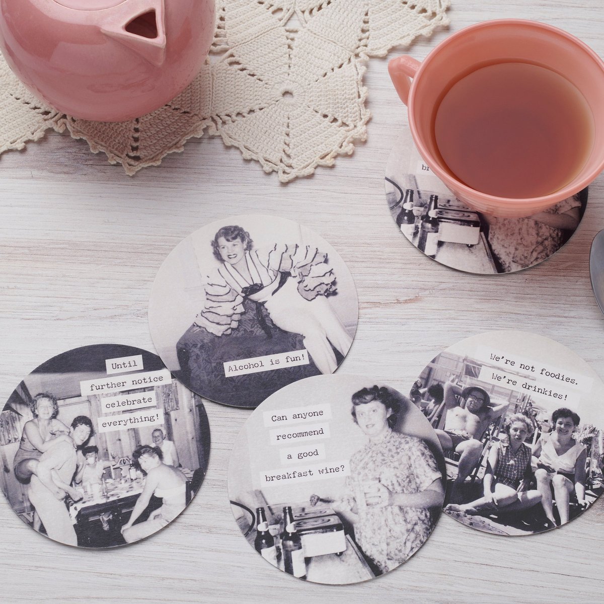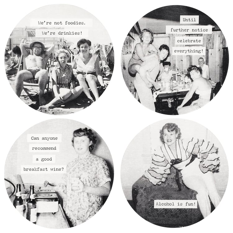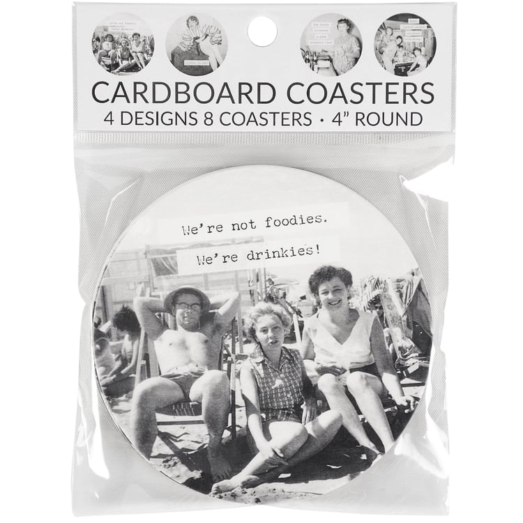 This coordinating set of 8 absorbent paper coasters from our Trash Talk By Annie Collection displays 4 double-sided designs featuring vintage black and white photos complemented with humorous sentiments that will make sure guests want to put their drinks on them. Hilarious coaster set includes 2 of each design with sentiments that read "We're Not Foodies. We're Drinkies! - Until Further Notice Celebrate Everything! - Can Anyone Recommend A Good Breakfast Wine? - Alcohol Is Fun!" Coaster set is packaged in a polybag with header card displaying product details and hole for easy rack display. Our Let's Drink coaster set calls back to a vintage style with sassy sentiments that entertain guests and evoke the feeling of being at a fun bar when at home. Paper coasters are durable enough to be reused as functional home accents, but also disposable after using as party decor.