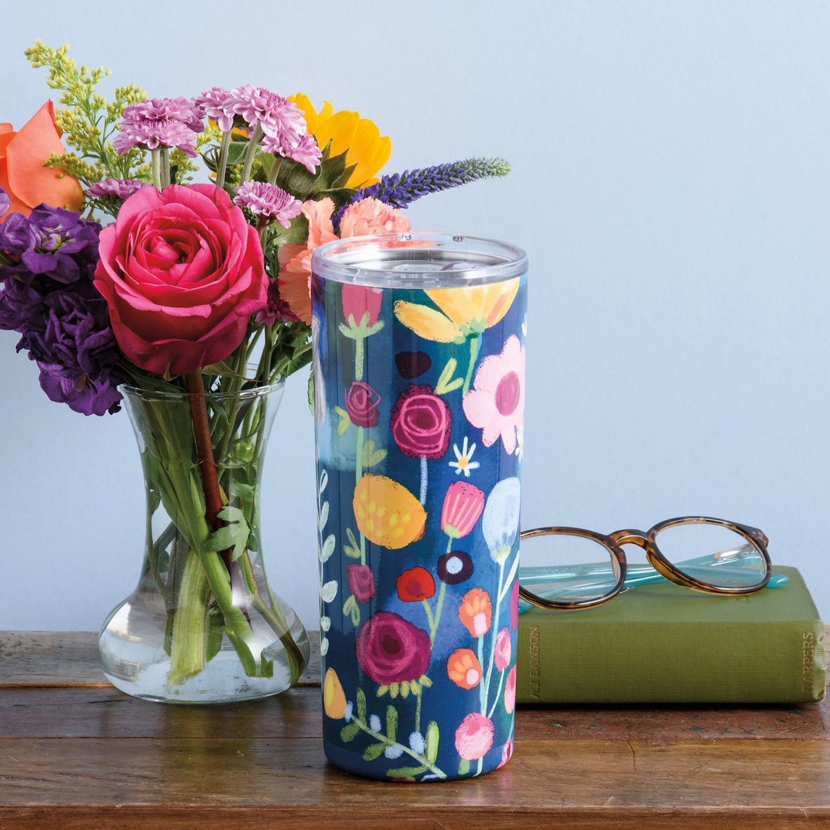 A stainless steel coffee tumbler featuring blue accents and various floral designs. Holds 20 ounces. Insulated coffee tumbler keeps beverages hot for 4 hours and cold for 6 hours. Includes plastic lid. Hand-wash only. BPA free.