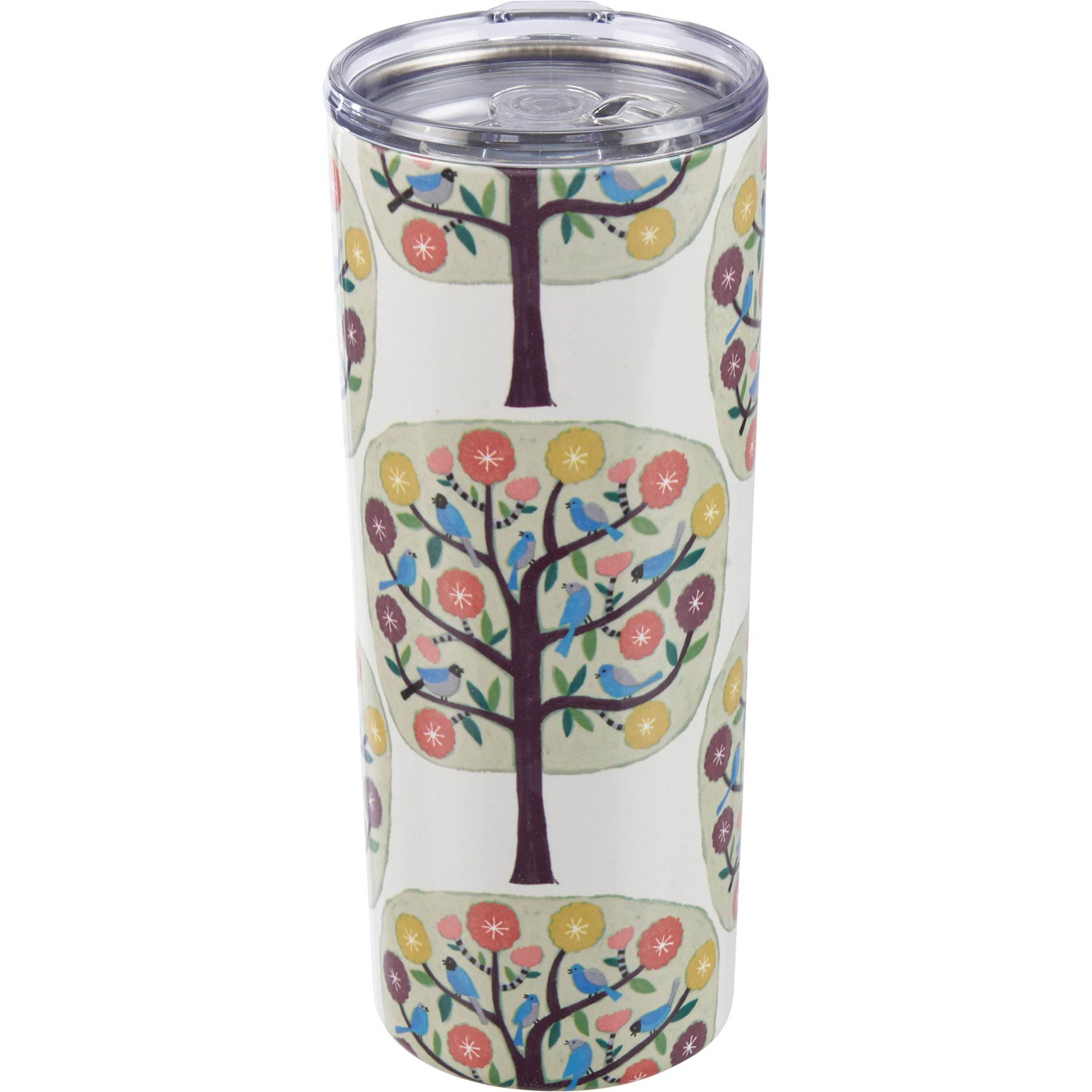 A 20 oz stainless steel coffee tumbler from our Primitive Collection displaying a full wrap-around design of colorful trees with birds on branches in a whimsical hand illustrated style. Our Cream Floral Trees coffee tumbler is insulated to keep beverages hot for 4 hours or cold for 6 hours and includes a plastic lid with rubber seal. Hand-wash only; do not microwave. BPA free. A lovely everyday accessory perfect for on-the-go or at home.