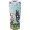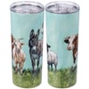 An insulated stainless steel coffee tumbler with a full wrap-around farm animal design. Design is replicated from original artwork painted onto burlap canvas, giving the art a unique depth and texture. Plastic lid features rubber seal. Holds 20 oz. Insulated coffee tumbler keeps beverages hot for 4 hours and cold for 6 hours. Hand-wash only. BPA free. Our Farm Animal travel mug can be found with our Drinkware & Accessories.