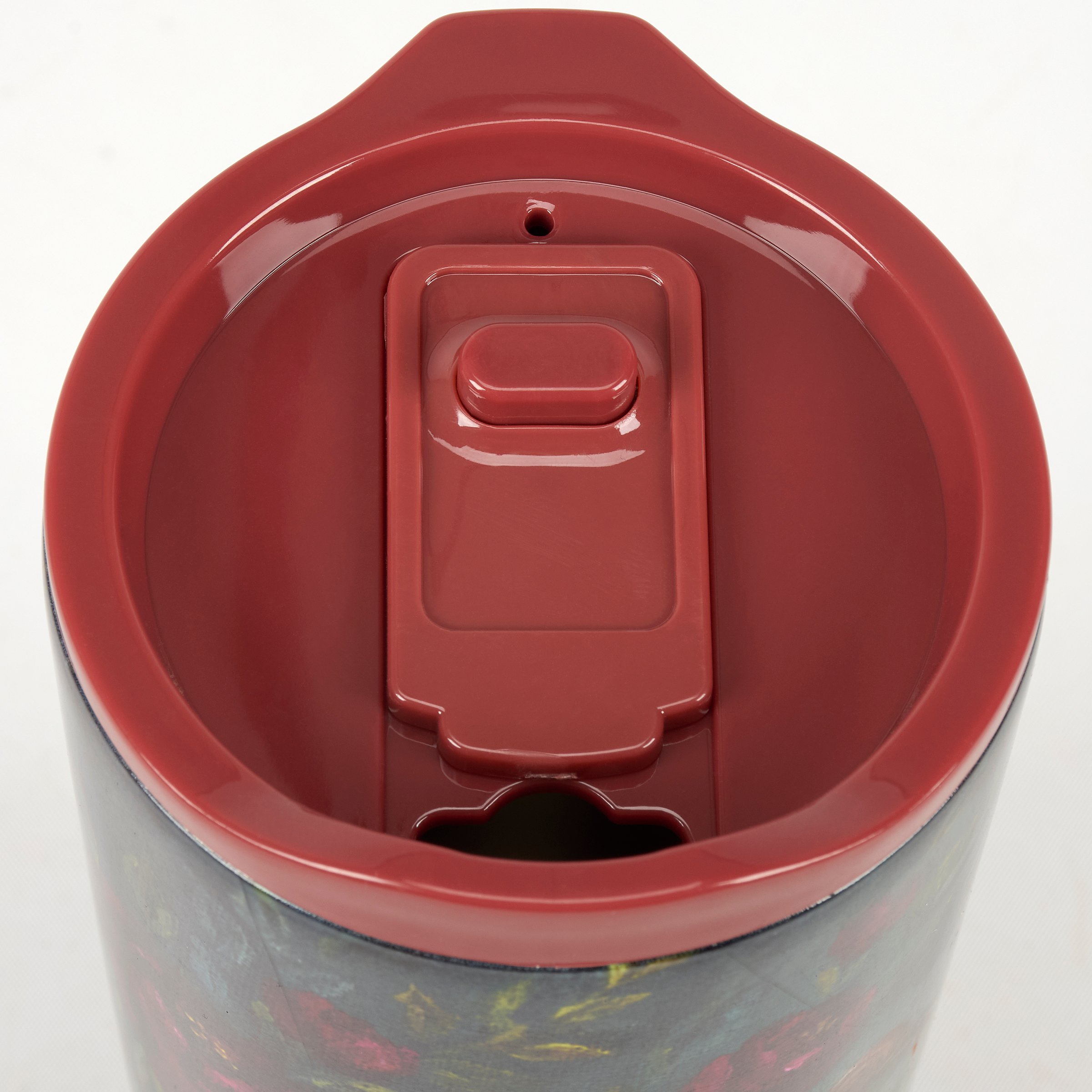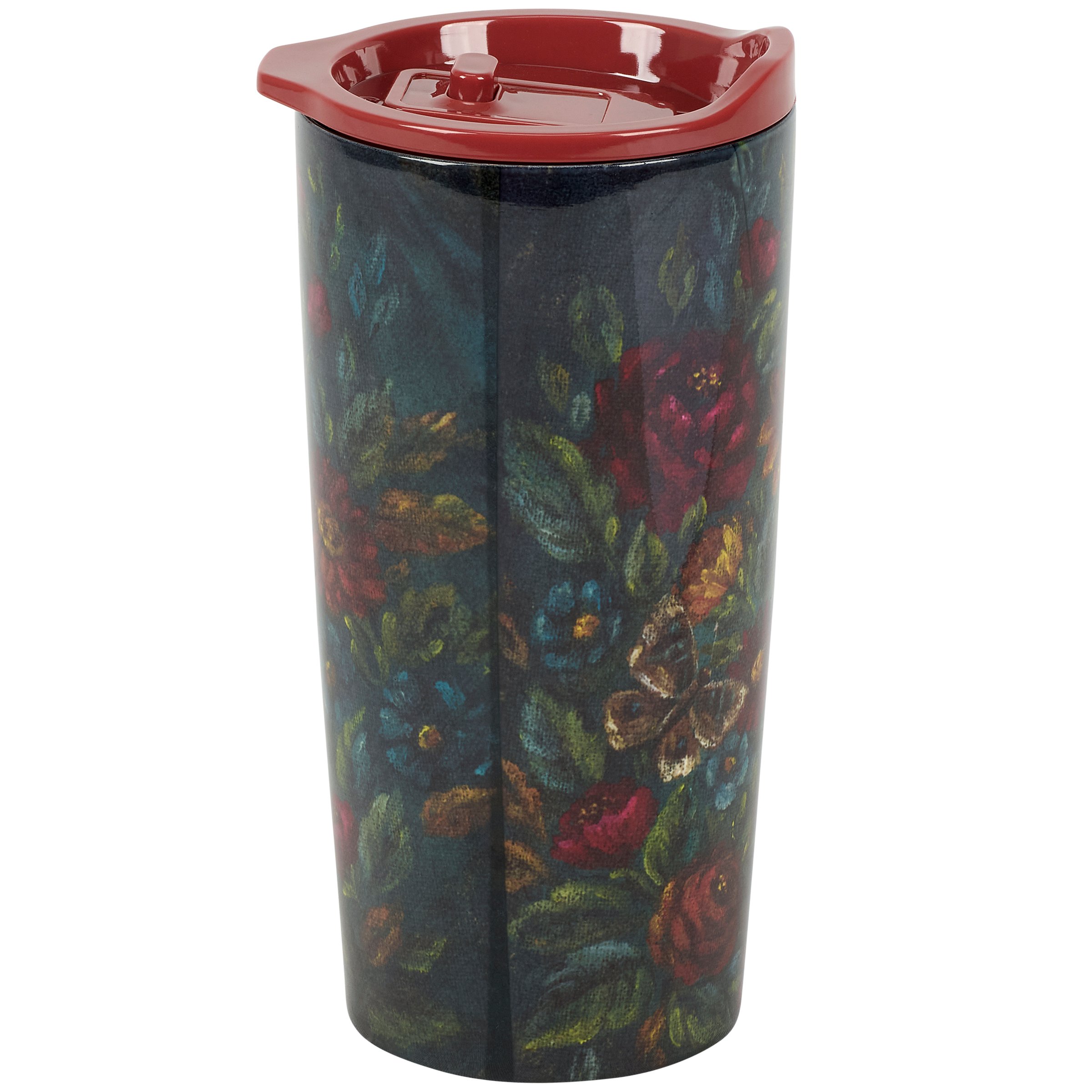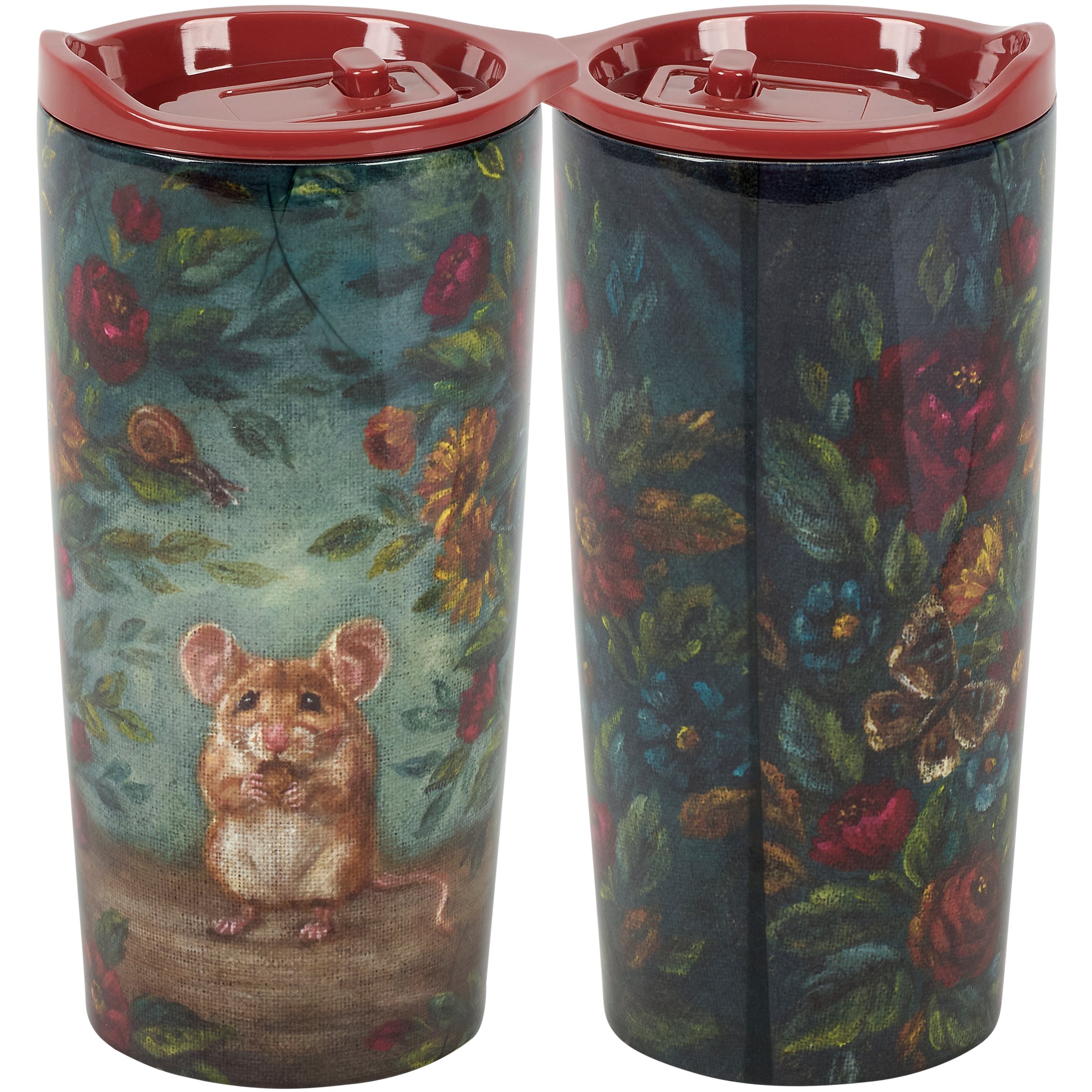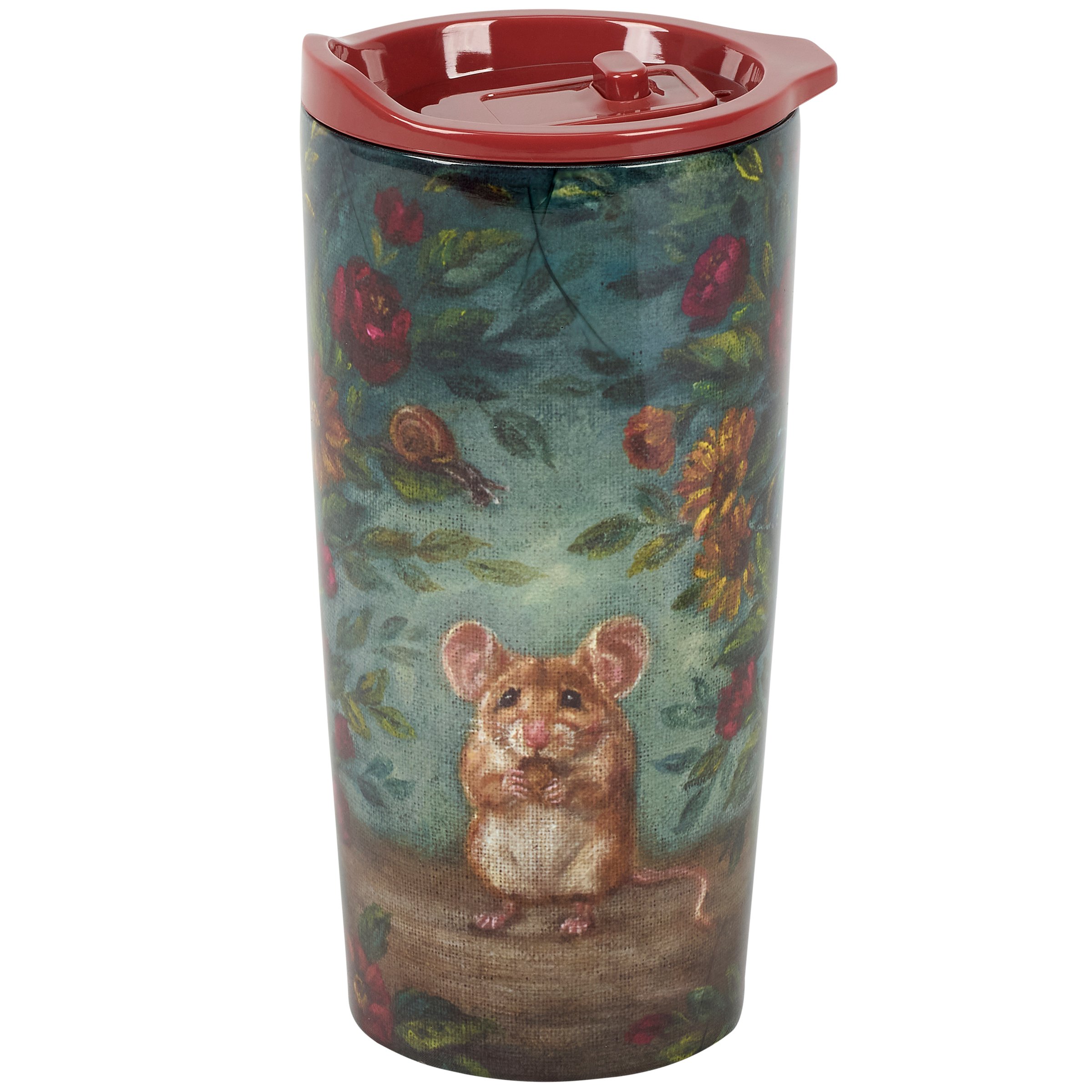 A 20 oz stainless steel coffee tumbler from our Fall & Harvest Collection featuring a full wrap-around design displaying a charming scene of a field mouse surrounded by fall florals in a jewel tone color palette. Fall mouse design is replicated from original artwork painted onto burlap canvas, giving the art a unique depth and texture. Our Field Mouse coffee tumbler is insulated to keep beverages hot for 4 hours or cold for 6 hours and includes a coordinating red plastic lid with a push button spout. Stainless steel tumbler is hand wash only; not microwave safe. A stylish fall-themed gift perfect for on-the-go or at home.
