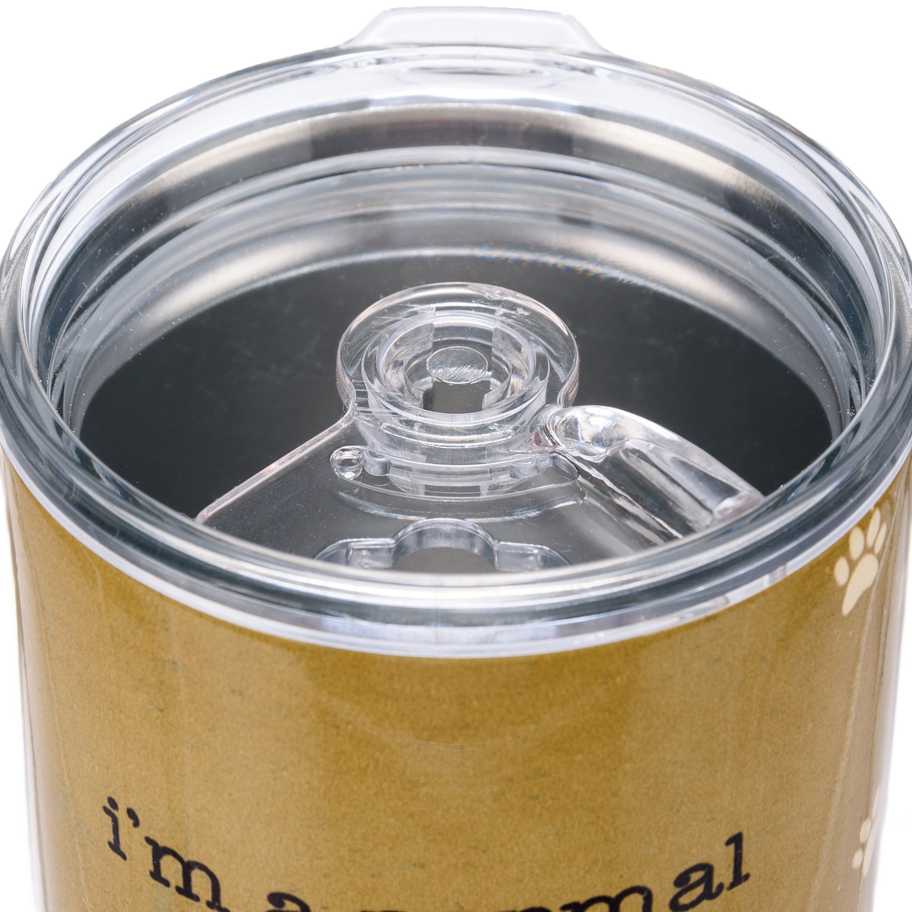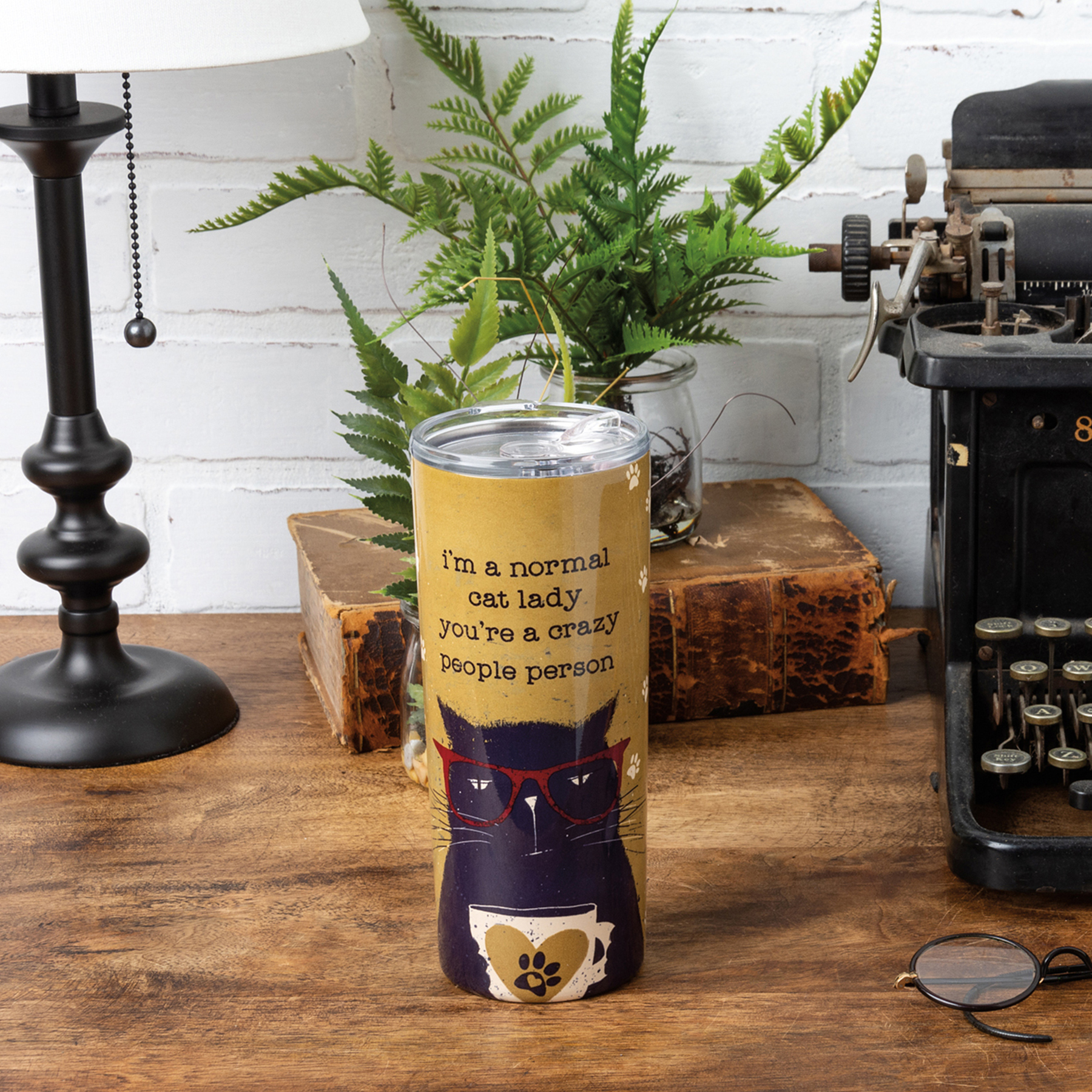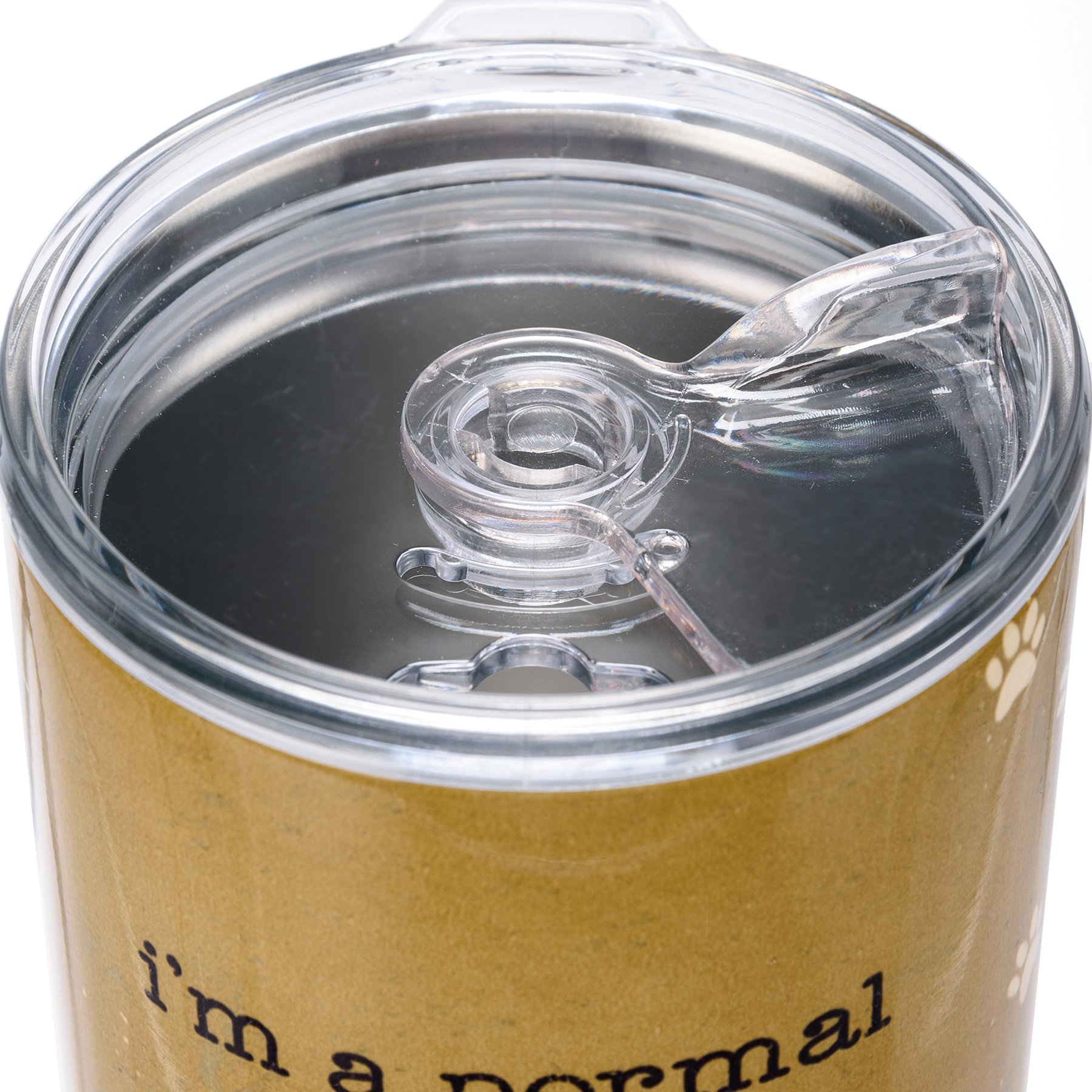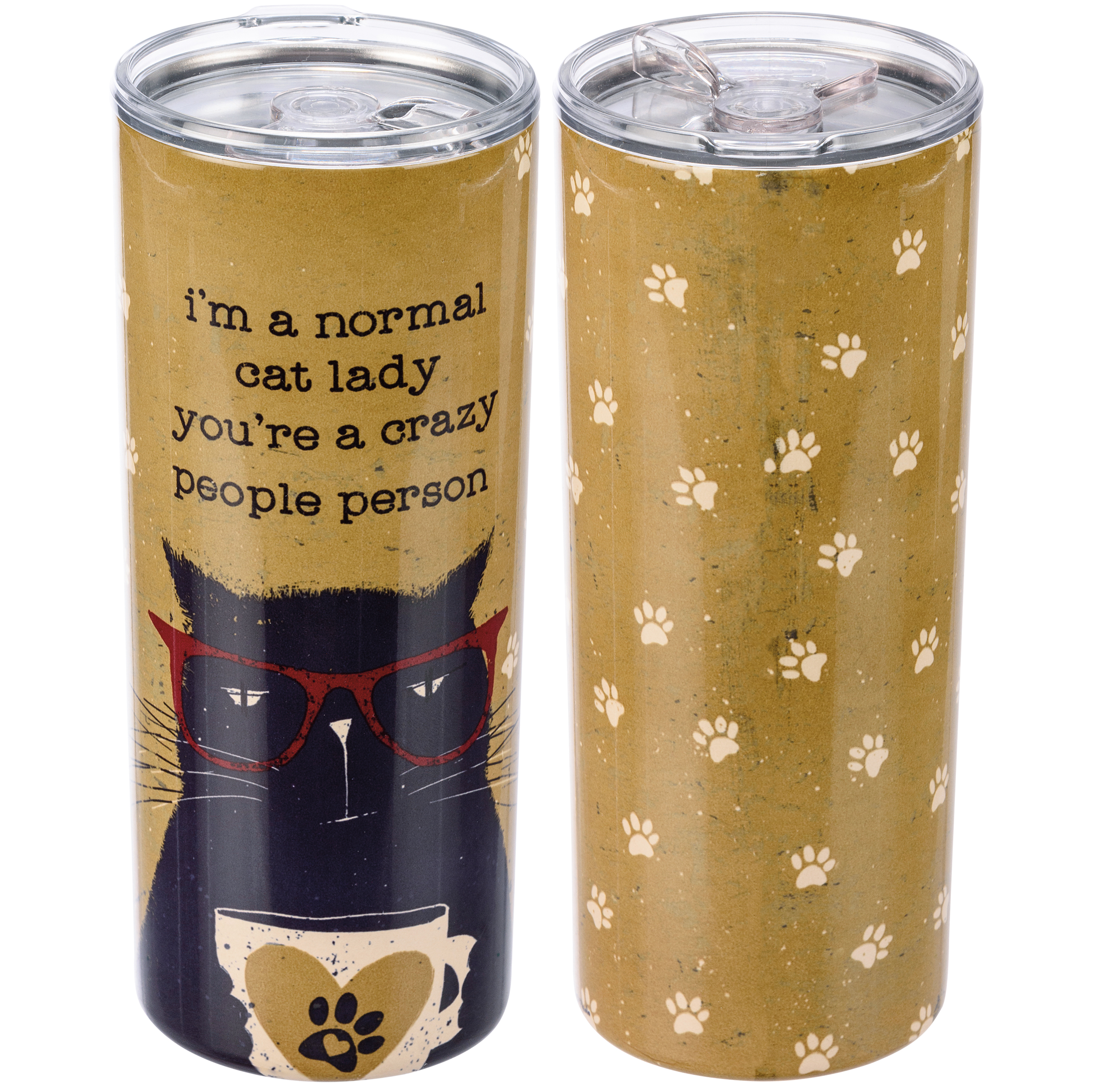 An insulated stainless steel coffee tumbler with a full wrap-around rustic cat and paw print design and sassy "I'm A Normal Cat Lady You're A Crazy People Person" sentiment. Plastic lid features rubber seal. Holds 20 oz. Insulated coffee tumbler keeps beverages hot for 4 hours and cold for 6 hours. Hand-wash only. BPA free. Our I'm A Normal Cat Lady travel mug can be found with our Drinkware & Accessories.