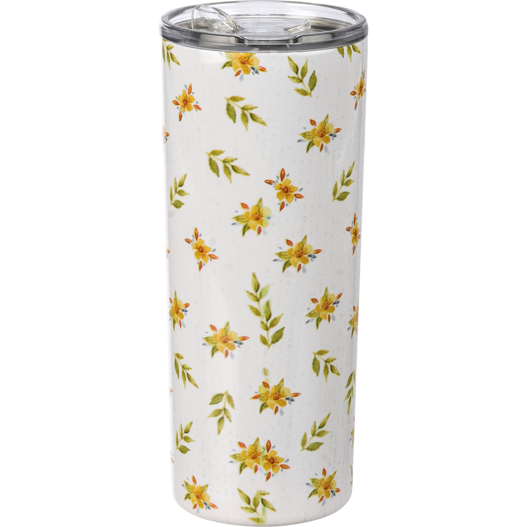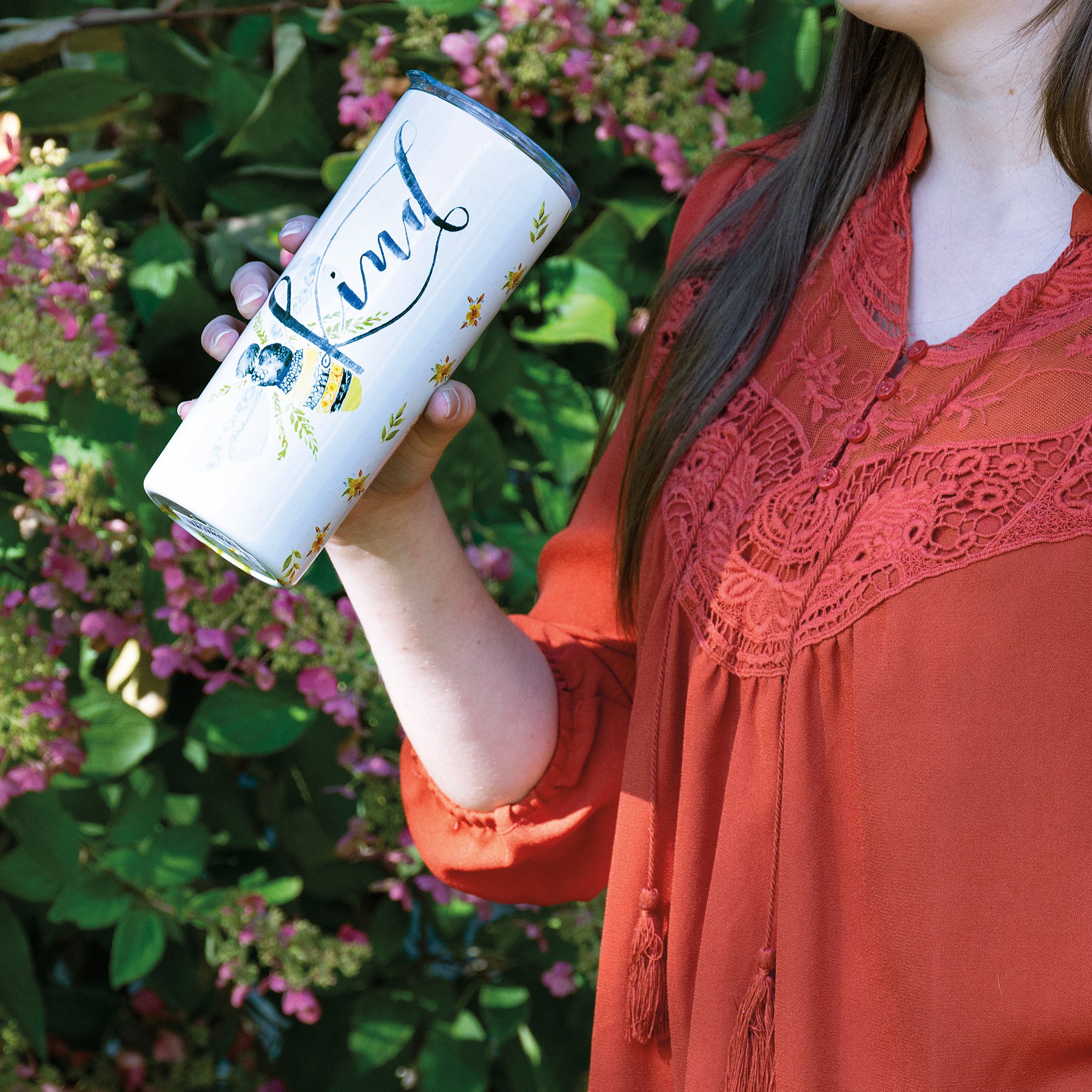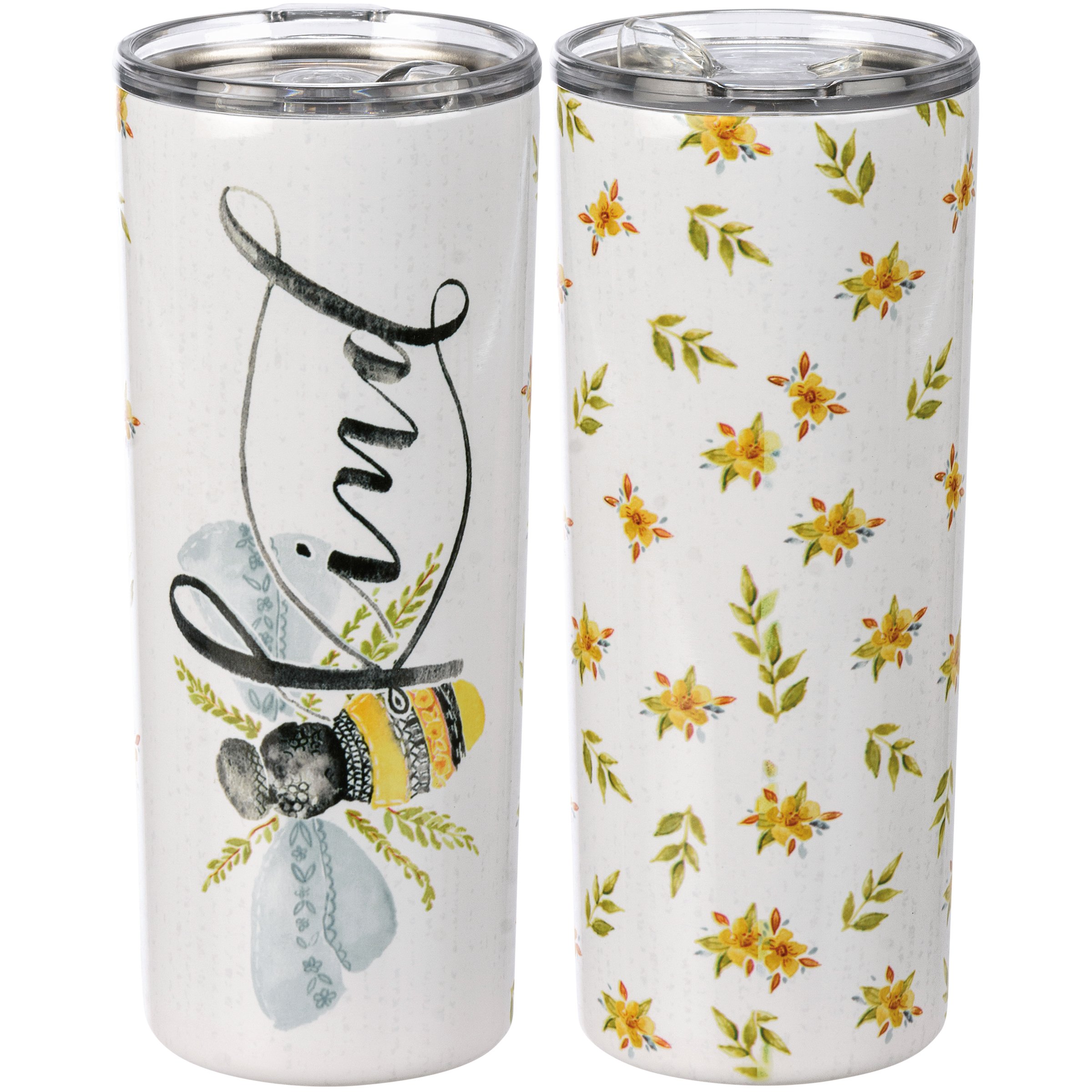 A stainless steel coffee tumbler featuring full wrap-around watercolor floral designs and central bee design with hand lettered "Kind" sentiment. Holds 20 ounces. Insulated coffee tumbler keeps beverages hot for 4 hours and cold for 6 hours. Includes plastic lid. Hand-wash only. BPA free.