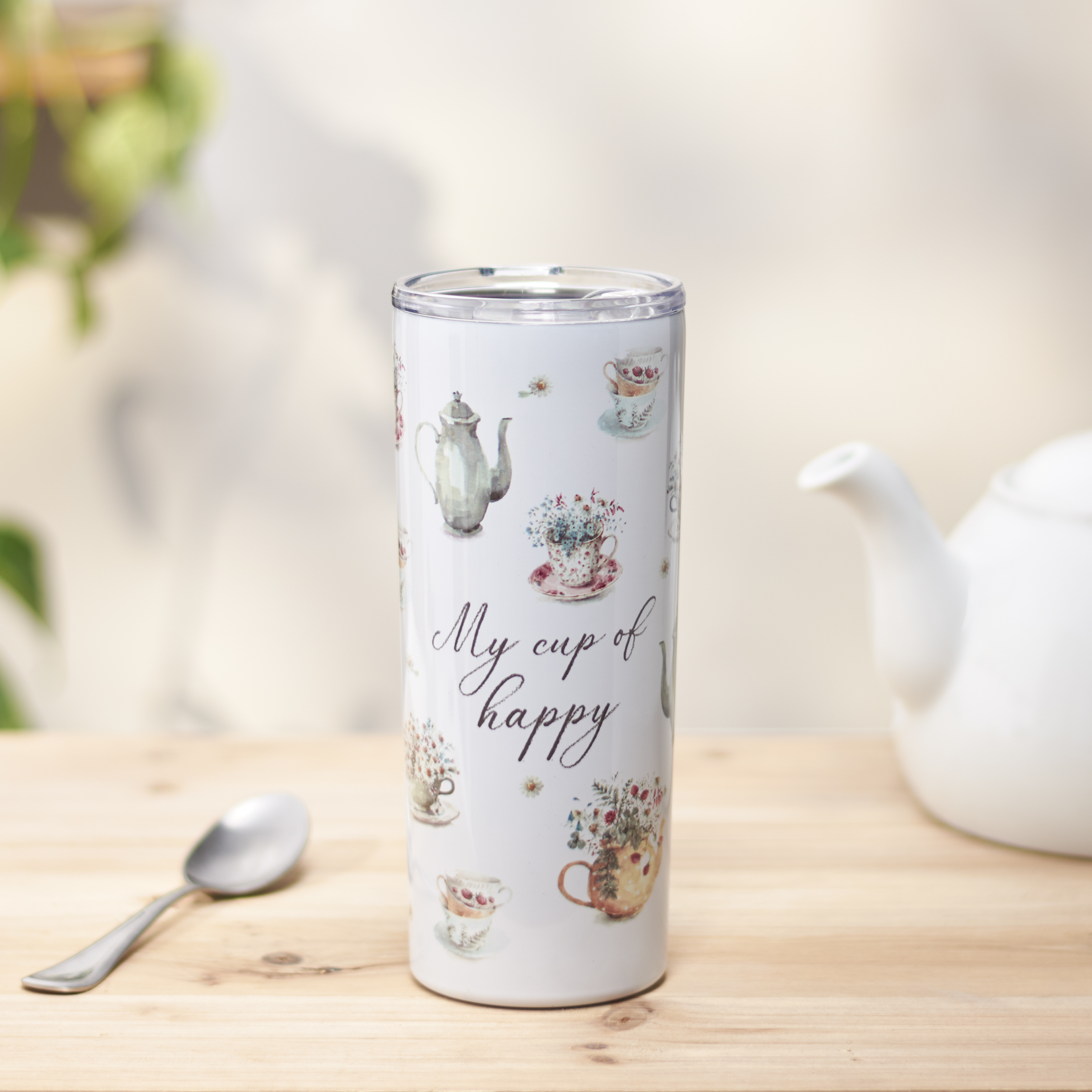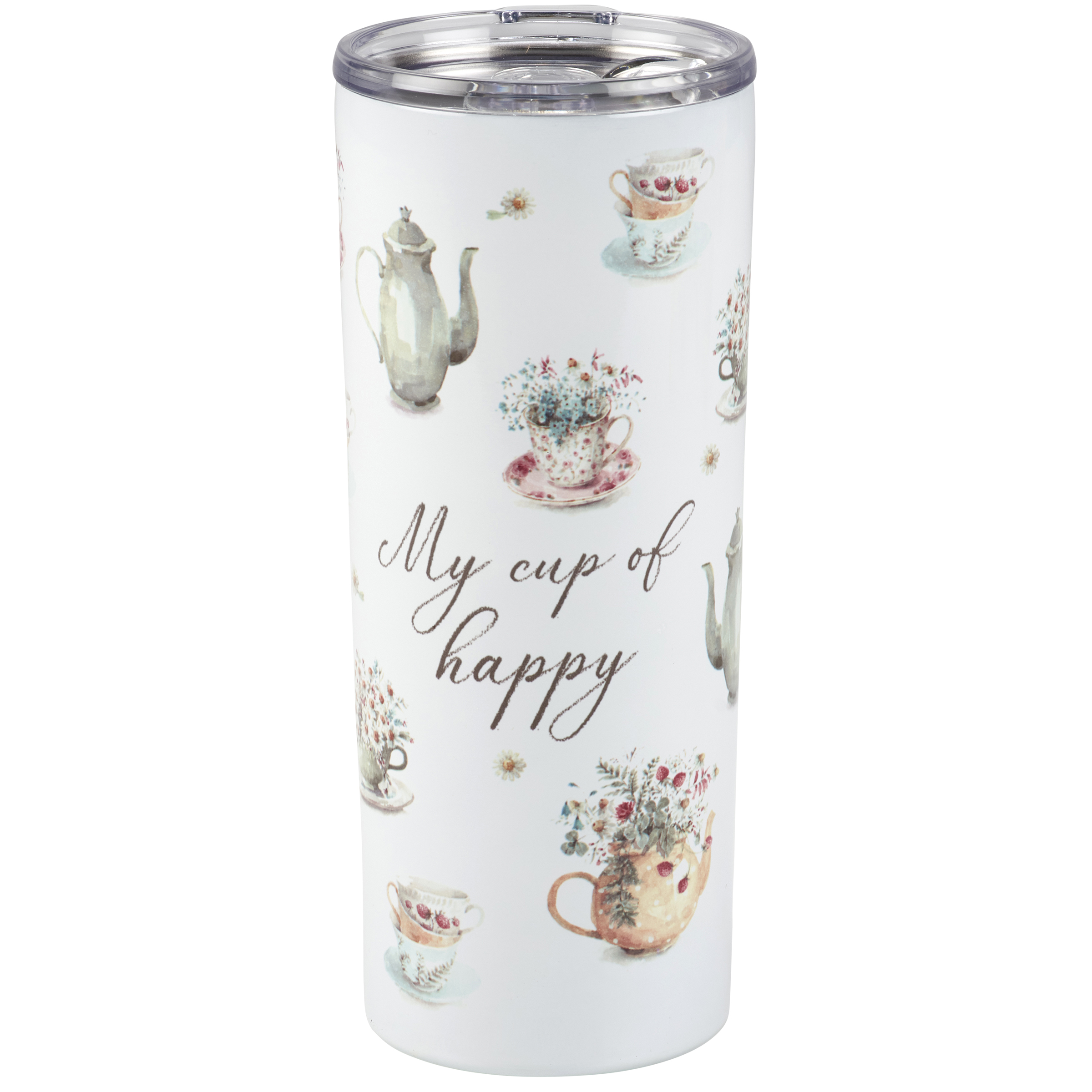 A 20 oz stainless steel coffee tumbler from our Tea & Coffee Collection displaying an all-over design of teapots, tea kettles, and teacups filled with flowers in a delicate hand painted style. Design also features an uplifting "My Cup Of Happy" sentiment. Our My Cup Of Happy coffee tumbler is insulated to keep beverages hot for 4 hours or cold for 6 hours and includes a plastic lid with rubber seal. Hand-wash only; do not microwave. BPA free. A charming everyday accessory perfect for on-the-go or at home.