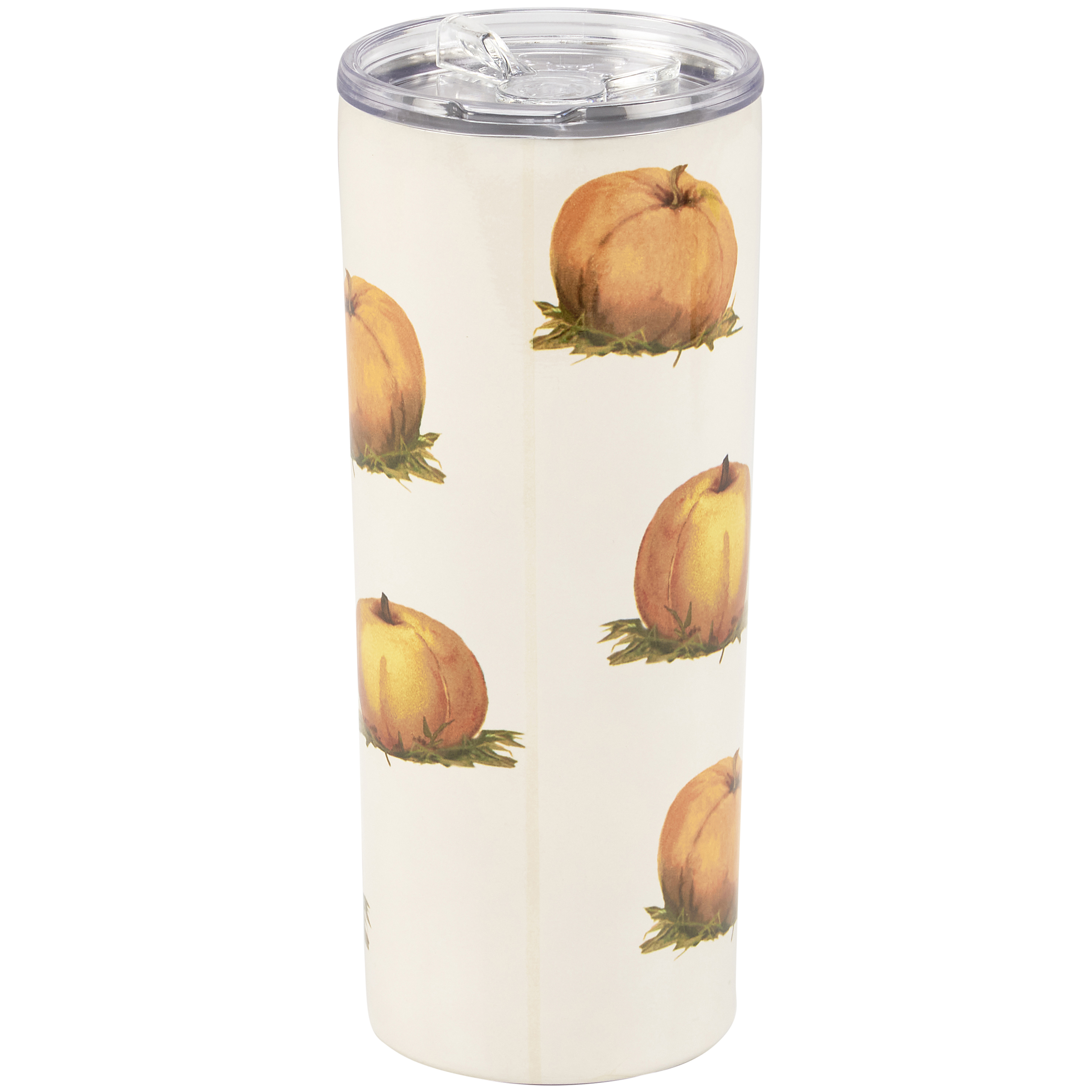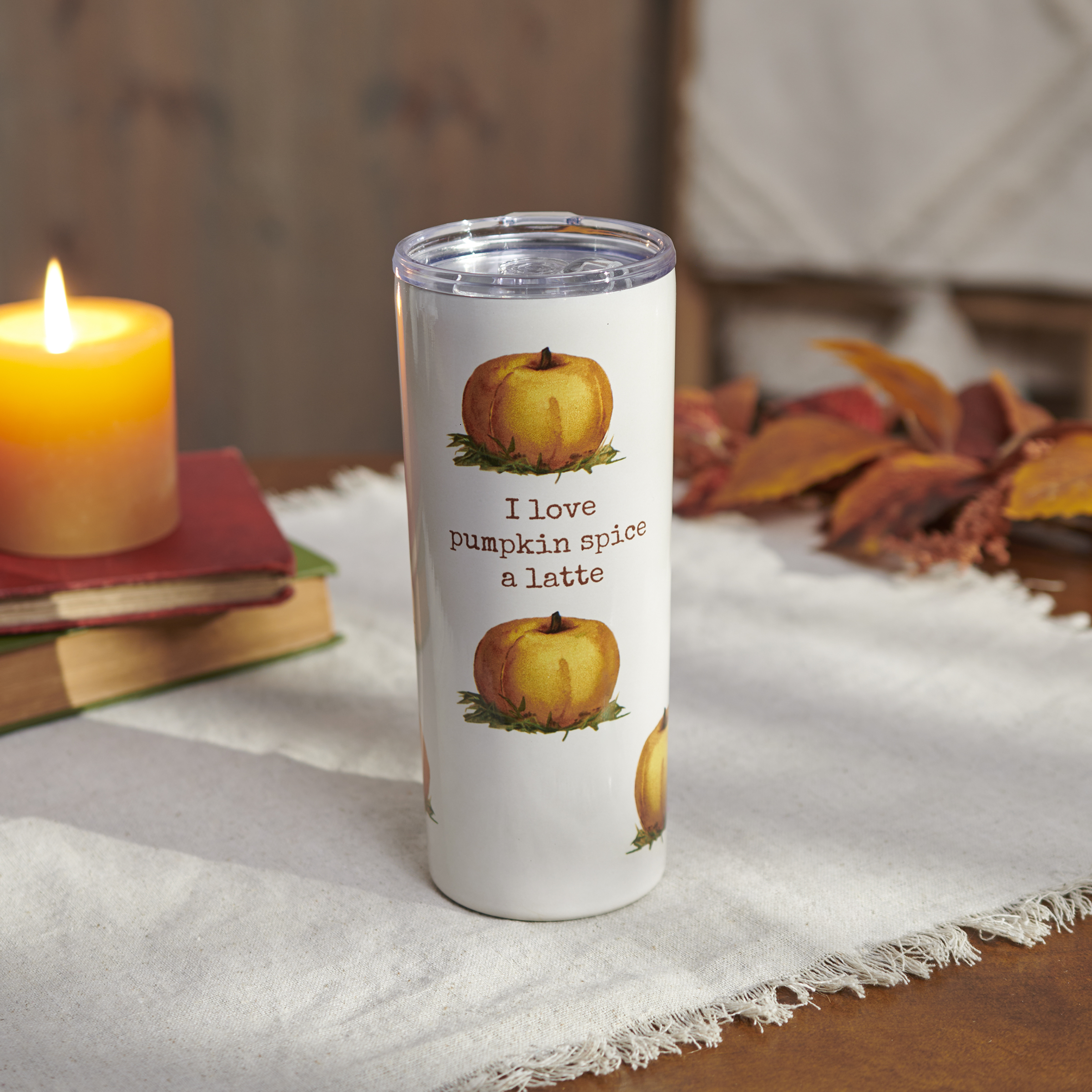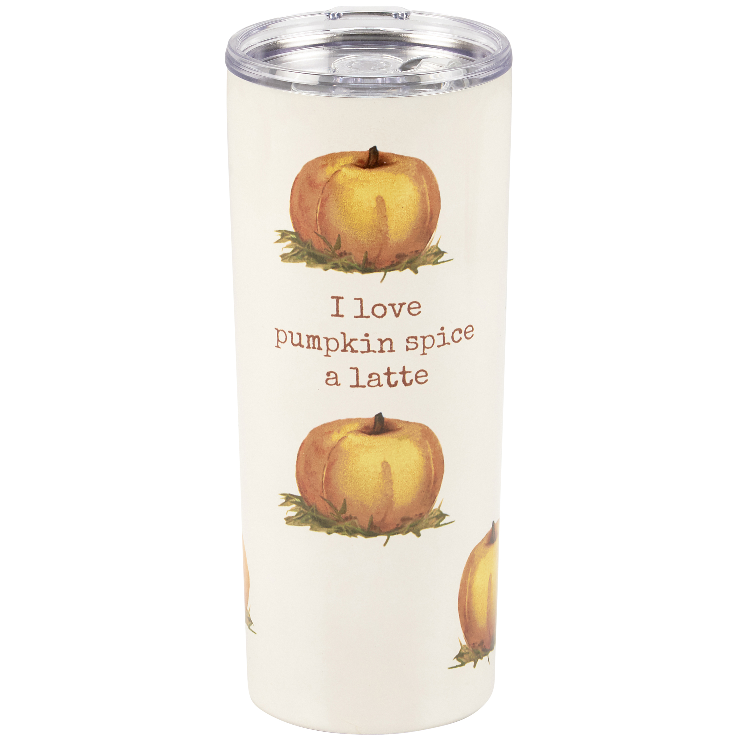 A 20 oz stainless steel coffee tumbler from our Fall & Harvest Collection displaying a full wrap-around design of pumpkins in a vintage style. Design features a coordinating seasonal pun that reads "I Love Pumpkin Spice A Latte." Our Pumpkin Latte tumbler is insulated to keep beverages hot for 4 hours or cold for 6 hours and includes a plastic lid with rubber seal. Hand wash only; do not microwave. BPA free. A fun seasonal accessory perfect for on-the-go or at home.